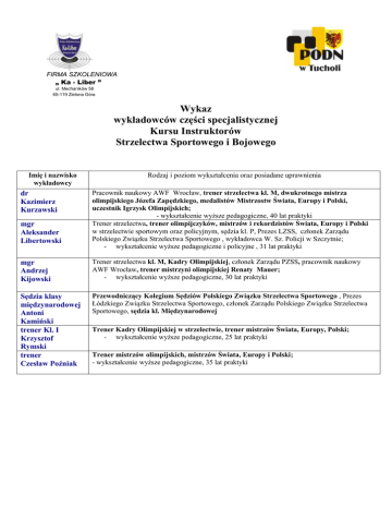 FIRMA SZKOLENIOWA „ Ka - Liber ” ul. Mechaników 58 65-119 Zielona Góra Wykaz wykładowców części specjalistycznej Kursu Instruktorów Strzelectwa Sportowego i Bojowego Imię i nazwisko wykładowcy dr Kazimierz Kurzawski mgr Aleksander Libertowski Rodzaj i poziom wykształcenia oraz posiadane uprawnienia Pracownik naukowy AWF Wrocław, trener strzelectwa kl. M, dwukrotnego mistrza olimpijskiego Józefa Zapędzkiego, medalistów Mistrzostw Świata, Europy i Polski, uczestnik Igrzysk Olimpijskich; - wykształcenie wyższe pedagogiczne, 40 lat praktyki Trener strzelectwa, trener olimpijczyków, mistrzów i rekordzistów Świata, Europy i Polski w strzelectwie sportowym oraz policyjnym, sędzia kl. P, Prezes LZSS, członek Zarządu Polskiego Związku Strzelectwa Sportowego , wykładowca W. Sz. Policji w Szczytnie; - wykształcenie wyższe pedagogiczne i policyjne , 31 lat praktyki mgr Andrzej Kijowski Trener strzelectwa kl. M, Kadry Olimpijskiej, członek Zarządu PZSS, pracownik naukowy AWF Wrocław, trener mistrzyni olimpijskiej Renaty Mauer; - wykształcenie wyższe pedagogiczne, 30 lat praktyki Sędzia klasy międzynarodowej Antoni Kamiński trener Kl. I Krzysztof Rymski trener Czesław Poźniak Przewodniczący Kolegium Sędziów Polskiego Związku Strzelectwa Sportowego , Prezes Łódzkiego Związku Strzelectwa Sportowego, członek Zarządu Polskiego Związku Strzelectwa Sportowego, sędzia kl. Międzynarodowej Trener Kadry Olimpijskiej w strzelectwie, trener mistrzów Świata, Europy, Polski; - wykształcenie wyższe pedagogiczne, 25 lat praktyki Trener mistrzów olimpijskich, mistrzów Świata, Europy i Polski; - wykształcenie wyższe pedagogiczne, 35 lat praktyki