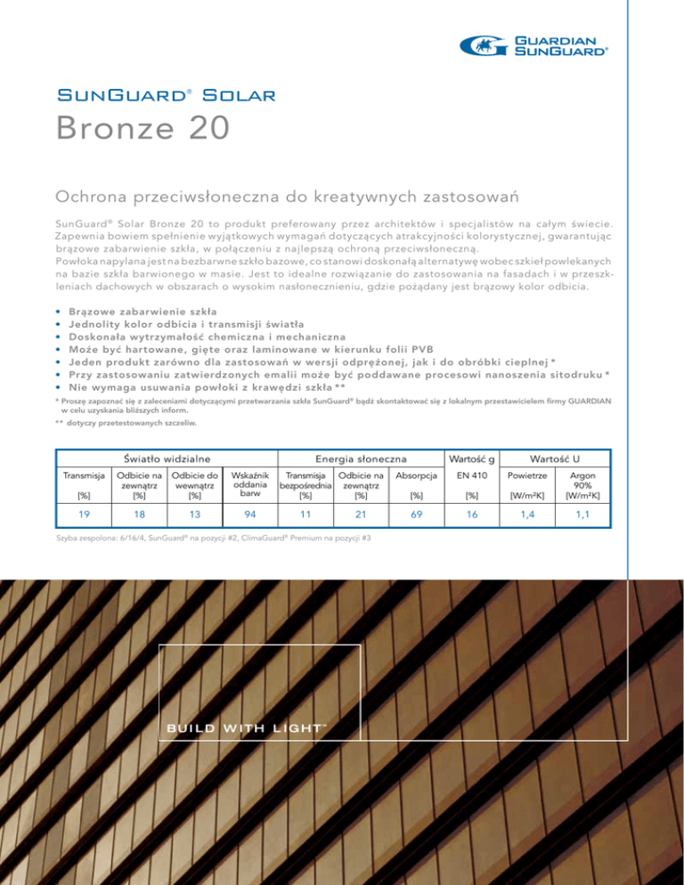 SunGuard Solar ® Bronze 20 Ochrona przeciwsłoneczna do kreatywnych zastosowań SunGuard ® Solar Bronze 20 to produkt preferowany przez architektów i specjalistów na całym świecie. Zapewnia bowiem spełnienie wyjątkowych wymagań dotyczących atrakcyjności kolorystycznej, gwarantując brązowe zabarwienie szkła, w połączeniu z najlepszą ochroną przeciwsłoneczną. Powłoka napylana jest na bezbarwne szkło bazowe, co stanowi doskonałą alternatywę wobec szkieł powlekanych na bazie szkła barwionego w masie. Jest to idealne rozwiązanie do zastosowania na fasadach i w przeszkleniach dachowych w obszarach o wysokim nasłonecznieniu, gdzie pożądany jest brązowy kolor odbicia. • • • • • • • Brązowe zabarwienie szkła Jednolity kolor odbicia i transmisji światła Doskonała wytrzymałość chemiczna i mechaniczna Może być hartowane, gięte oraz laminowane w kierunku folii PVB Jeden produkt zarówno dla zastosowań w wersji odprężonej, jak i do obróbki cieplnej * Przy zastosowaniu zatwierdzonych emalii może być poddawane procesowi nanoszenia sitodruku * Nie wymaga usuwania powłoki z krawędzi szkła ** * Proszę zapoznać się z zaleceniami dotyczącymi przetwarzania szkła SunGuard® bądź skontaktować się z lokalnym przestawicielem firmy GUARDIAN w celu uzyskania bliższych inform. ** dotyczy przetestowanych szczeliw. Światło widzialne Transmisja Energia słoneczna [%] Odbicie na zewnątrz [%] Odbicie do wewnątrz [%] Wskaźnik oddania barw 19 18 13 94 Transmisja Odbicie na bezpośrednia zewnątrz [%] [%] 11 21 Szyba zespolona: 6/16/4, SunGuard® na pozycji #2, ClimaGuard® Premium na pozycji #3 Wartość g Wartość U Absorpcja EN 410 Powietrze [%] [%] [W/m²K] Argon 90% [W/m²K] 69 16 1,4 1,1 Produkty serii SunGuard ® dostępne są w różnych miejscach w Europie za pośrednictwem niezależnej sieci zakładów przetwarzających szkło GUARDIANa. W celu uzyskania dodatkowych informacji, należy skontaktować się z lokalnym przedstawicielem firmy GUARDIAN. GUARDIAN Industries U.K. Ltd. GUARDIAN Luxguard I, S.A. GUARDIAN Glass España, S.L. GUARDIAN Orosháza Kft. United Kingdom Luxembourg Spain Hungary Phone: 0044 (0) 800 032 6322 Phone: 00 352 50301 Phone: 00 34 948 817255 Phone: 0036 (0) 68 887 200 e-Mail: [email protected] e-Mail: sales_bascharage@ e-Mail: [email protected] e-Mail: oroshaza_sales@ guardian.com guardian.com GUARDIAN Thalheim GmbH GUARDIAN Częstochowa Sp. z o.o. GUARDIAN Steklo Ryazan LLC Germany Poland Russia Phone: 0049 (0) 3494 361 800 Phone: 0048 (0) 34 323 9200 Phone: 007 (8) 4912 956600 e-Mail: anwendungstechnik@ e-Mail: tech_poland@ e-Mail: [email protected] guardian.com guardian.com Podane wartości są wartościami nominalnymi podlegającymi tolerancjom produkcyjnym. Podane wartości spektrofotometryczne są zgodne z EN 410; wartości współczynnika przenikania ciepła U są zgodne z EN 673. Sprzedaż produktów przedstawionych w tej publikacji podlega ogólnym warunkom sprzedaży firmy GUARDIAN, jak rownież dodatkowym obowiązującym pisemnym gwarancjom. Nabywca jest odpowiedzialny za potwierdzenie, że produkty są odpowiednie do ich zamierzonego zastosowania. W celu uzyskania wszelkich stosownych instrukcji użytkowania i obsługi, jak rownież aktualnych informacji o produkcie, prosimy o kontakt z Państwa lokalnym przedstawicielem firmy GUARDIAN. www.sunguardglass.pl GUARDIAN Europe Numer referencyjny: 6-16-4 / S B 20 / PL / 12-11 ©2011 GUARDIAN Industries Corp. Nazwa SunGuard ® jest zastrzeżonym znakiem towarowym należącym do GUARDIAN Industries Corp.