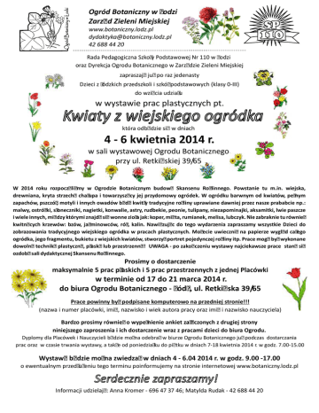 Ogród Botaniczny w Łodzi Zarząd Zieleni Miejskiej www.botaniczny.lodz.pl [email protected] 42 688 44 20 Rada Pedagogiczna Szkoły Podstawowej Nr 110 w Łodzi oraz Dyrekcja Ogrodu Botanicznego w Zarządzie Zieleni Miejskiej zapraszają już po raz jedenasty Dzieci z łódzkich przedszkoli i szkół podstawowych (klasy 0-III) do wzięcia udziału w wystawie prac plastycznych pt. Kwiaty z wiejskiego ogródka która odbędzie się w dniach 4 - 6 kwietnia 2014 r. w sali wystawowej Ogrodu Botanicznego, przy ul. Retkińskiej 39/65 W 2014 roku rozpoczęliśmy w Ogrodzie Botanicznym budowę Skansenu Roślinnego. Powstanie tu m.in. wiejska, drewniana, kryta strzechą chałupa i towarzyszący jej przydomowy ogródek. W ogródku barwnym od kwiatów, pełnym zapachów, pszczół, motyli i innych owadów będą kwitły tradycyjne rośliny uprawiane dawniej przez nasze prababcie np.: malwy, ostróżki, słoneczniki, nagietki, konwalie, astry, rudbekie, peonie, tulipany, niezapominajki, aksamitki, lwie paszcze i wiele innych, między którymi znajdą się wonne zioła jak: koper, mięta, rumianek, melisa, lubczyk. Nie zabraknie tu również kwitnących krzewów: bzów, jaśminowców, róż, kalin. Nawiązując do tego wydarzenia zapraszamy wszystkie Dzieci do zobrazowania tradycyjnego wiejskiego ogródka w pracach plastycznych. Możecie uwiecznić na papierze wygląd całego ogródka, jego fragmentu, bukietu z wiejskich kwiatów, stworzyć portret pojedynczej rośliny itp. Prace mogą być wykonane dowolną techniką plastyczną, płaską lub przestrzenną! UWAGA - po zakończeniu wystawy najciekawsze prace staną się ozdobą sali dydaktycznej Skansenu Roślinnego. Prosimy o dostarczenie maksymalnie 5 prac płaskich i 5 prac przestrzennych z jednej Placówki w terminie od 17 do 21 marca 2014 r. do biura Ogrodu Botanicznego - Łódź, ul. Retkińska 39/65 Prace powinny być podpisane komputerowo na przedniej stronie!!! (nazwa i numer placówki, imię, nazwisko i wiek autora pracy oraz imię i nazwisko nauczyciela) Bardzo prosimy również o wypełnienie ankiet załączonych z drugiej strony niniejszego zaproszenia i ich dostarczenie wraz z pracami dzieci do biura Ogrodu. Dyplomy dla Placówek i Nauczycieli będzie można odebrać w biurze Ogrodu Botanicznego już podczas dostarczania prac oraz w czasie trwania wystawy, a także od poniedziałku do piątku w dniach 7-18 kwietnia 2014 r. w godz. 7.00-15.00 Wystawę będzie można zwiedzać w dniach 4 - 6.04 2014 r. w godz. 9.00 -17.00 o ewentualnym przedłużeniu tego terminu poinformujemy na stronie internetowej www.botaniczny.lodz.pl Serdecznie zapraszamy! Informacji udzielają: Anna Kromer - 696 47 37 46; Matylda Rudak - 42 688 44 20 ANKIETA prosimy o czytelne wypełnienie ankiety i jej dostarczenie wraz z pracami dzieci do biura Ogrodu Botanicznego. Nazwa Placówki .................................................................................................................................... ......................................................................................................................................... Nr tel. .................................................................................................................................................... Liczba nauczycieli z placówki, pod kierunkiem których prace zostały wykonane: ..........................................................................osób.