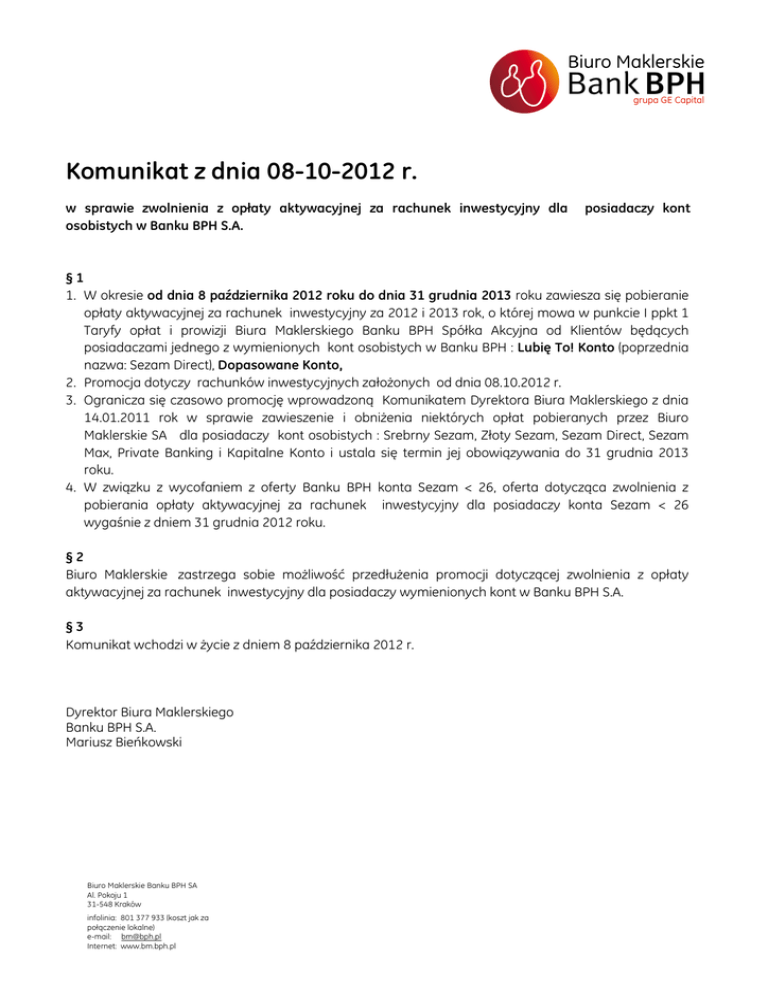 Komunikat z dnia 08-10-2012 r. w sprawie zwolnienia z opłaty aktywacyjnej za rachunek inwestycyjny dla osobistych w Banku BPH S.A. posiadaczy kont §1 1. W okresie od dnia 8 października 2012 roku do dnia 31 grudnia 2013 roku zawiesza się pobieranie opłaty aktywacyjnej za rachunek inwestycyjny za 2012 i 2013 rok, o której mowa w punkcie I ppkt 1 Taryfy opłat i prowizji Biura Maklerskiego Banku BPH Spółka Akcyjna od Klientów będących posiadaczami jednego z wymienionych kont osobistych w Banku BPH : Lubię To! Konto (poprzednia nazwa: Sezam Direct), Dopasowane Konto, 2. Promocja dotyczy rachunków inwestycyjnych założonych od dnia 08.10.2012 r. 3. Ogranicza się czasowo promocję wprowadzoną Komunikatem Dyrektora Biura Maklerskiego z dnia 14.01.2011 rok w sprawie zawieszenie i obniżenia niektórych opłat pobieranych przez Biuro Maklerskie SA dla posiadaczy kont osobistych : Srebrny Sezam, Złoty Sezam, Sezam Direct, Sezam Max, Private Banking i Kapitalne Konto i ustala się termin jej obowiązywania do 31 grudnia 2013 roku. 4. W związku z wycofaniem z oferty Banku BPH konta Sezam < 26, oferta dotycząca zwolnienia z pobierania opłaty aktywacyjnej za rachunek inwestycyjny dla posiadaczy konta Sezam < 26 wygaśnie z dniem 31 grudnia 2012 roku. §2 Biuro Maklerskie zastrzega sobie możliwość przedłużenia promocji dotyczącej zwolnienia z opłaty aktywacyjnej za rachunek inwestycyjny dla posiadaczy wymienionych kont w Banku BPH S.A. §3 Komunikat wchodzi w życie z dniem 8 października 2012 r. Dyrektor Biura Maklerskiego Banku BPH S.A. Mariusz Bieńkowski Biuro Maklerskie Banku BPH SA Al. Pokoju 1 31-548 Kraków infolinia: 801 377 933 (koszt jak za połączenie lokalne) e-mail: [email protected] Internet: www.bm.bph.pl
