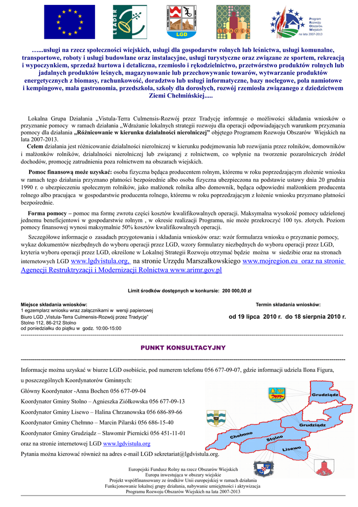 …...usługi na rzecz społeczności wiejskich, usługi dla gospodarstw rolnych lub leśnictwa, usługi komunalne, transportowe, roboty i usługi budowlane oraz instalacyjne, usługi turystyczne oraz związane ze sportem, rekreacją i wypoczynkiem, sprzedaż hurtowa i detaliczna, rzemiosło i rękodzielnictwo, przetwórstwo produktów rolnych lub jadalnych produktów leśnych, magazynowanie lub przechowywanie towarów, wytwarzanie produktów energetycznych z biomasy, rachunkowość, doradztwo lub usługi informatyczne, bazy noclegowe, pola namiotowe i kempingowe, mała gastronomia, przedszkola, szkoły dla dorosłych, rozwój rzemiosła związanego z dziedzictwem Ziemi Chełmińskiej..... Lokalna Grupa Działania „Vistula-Terra Culmensis-Rozwój przez Tradycję informuje o możliwości składania wniosków o przyznanie pomocy w ramach działania „Wdrażanie lokalnych strategii rozwoju dla operacji odpowiadających warunkom przyznania pomocy dla działania „Różnicowanie w kierunku działalności nierolniczej” objętego Programem Rozwoju Obszarów Wiejskich na lata 2007-2013. Celem działania jest różnicowanie działalności nierolniczej w kierunku podejmowania lub rozwijania przez rolników, domowników i małżonków rolników, działalności nierolniczej lub związanej z rolnictwem, co wpłynie na tworzenie pozarolniczych źródeł dochodów, promocję zatrudnienia poza rolnictwem na obszarach wiejskich. Pomoc finansową może uzyskać: osoba fizyczna będąca producentem rolnym, któremu w roku poprzedzającym złożenie wniosku w ramach tego działania przyznano płatności bezpośrednie albo osoba fizyczna ubezpieczona na podstawie ustawy dnia 20 grudnia 1990 r. o ubezpieczeniu społecznym rolników, jako małżonek rolnika albo domownik, będąca odpowiedni małżonkiem producenta rolnego albo pracująca w gospodarstwie producenta rolnego, któremu w roku poprzedzającym z łożenie wniosku przyznano płatności bezpośrednie. Forma pomocy – pomoc ma formę zwrotu części kosztów kwalifikowalnych operacji. Maksymalna wysokość pomocy udzielonej jednemu beneficjentowi w gospodarstwie rolnym , w okresie realizacji Programu, nie może przekroczyć 100 tys. złotych. Poziom pomocy finansowej wynosi maksymalnie 50% kosztów kwalifikowalnych operacji. Szczegółowe informacje o zasadach przygotowania i składania wniosków oraz: wzór formularza wniosku o przyznanie pomocy, wykaz dokumentów niezbędnych do wyboru operacji przez LGD, wzory formularzy niezbędnych do wyboru operacji przez LGD, kryteria wyboru operacji przez LGD, określone w Lokalnej Strategii Rozwoju otrzymać będzie można w siedzibie oraz na stronach internetowych LGD www.lgdvistula.org, na stronie Urzędu Marszałkowskiego www.mojregion.eu oraz na stronie Agenecji Restruktryzacji i Modernizacji Rolnictwa www.arimr.gov.pl Limit środków dostępnych w konkursie: 200 000,00 zł Miejsce składania wniosków: 1 egzemplarz wniosku wraz załącznikami w wersji papierowej Biuro LGD „Vistula-Terra Culmensis-Rozwój przez Tradycję” Stolno 112, 86-212 Stolno od poniedziałku do piątku w godz. 10:00-15:00 Termin składania wniosków: od 19 lipca 2010 r. do 18 sierpnia 2010 r. ----------------------------------------------------------------------------------------------------------------------------------------------------------------PUNKT KONSULTACYJNY -----------------------------------------------------------------------------------------------------------------------------------------------------------------Informacje można uzyskać w biurze LGD osobiście, pod numerem telefonu 056 677-09-07, gdzie informacji udziela Ilona Figura, u poszczególnych Koordynatorów Gminnych: Główny Koordynator -Anna Bochen 056 677-09-04 Koordynator Gminy Stolno – Agnieszka Ziółkowska 056 677-09-13 Koordynator Gminy Lisewo – Halina Chrzanowska 056 686-89-66 Koordynator Gminy Chełmno – Marcin Pilarski 056 686-15-40 Koordynator Gminy Grudziądz – Sławomir Piernicki 056 451-11-01 oraz na stronie internetowej LGD www.lgdvistula.org Pytania można kierować również na adres e-mail LGD [email protected]. Europejski Fundusz Rolny na rzecz Obszarów Wiejskich Europa inwestująca w obszary wiejskie Projekt współfinansowany ze środków Unii europejskiej w ramach działania Funkcjonowanie lokalnej grupy działania, nabywanie umiejętności i aktywizacja Programu Rozwoju Obszarów Wiejskich na lata 2007-2013