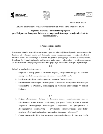 KROSNO Krosno 29.06.2010 r. Załącznik do zarządzenia Nr 807/10 Prezydenta Miasta Krosna z dnia 29 czerwca 2010 r. Regulamin rekrutacji i uczestnictwa w projekcie pn. „Zwiększenie dostępu do Internetu szansą wszechstronnego rozwoju mieszkańców miasta Krosna”. I. Postanowienia ogólne §1 Regulamin określa warunki uczestnictwa i proces rekrutacji Beneficjentów ostatecznych do Projektu „Zwiększenie dostępu do Internetu szansą wszechstronnego rozwoju mieszkańców miasta Krosna” realizowanego w ramach Programu Operacyjnego Innowacyjna Gospodarka, Działanie 8.3 Przeciwdziałanie wykluczeniu cyfrowemu – eInclusion, współfinansowanego ze środków Unii Europejskiej w ramach Europejskiego Funduszu Rozwoju Regionalnego. §2 Ilekroć w regulaminie jest mowa o: 1. Projekcie – naleŜy przez to rozumieć projekt „Zwiększenie dostępu do Internetu szansą wszechstronnego rozwoju mieszkańców miasta Krosna”. 2. Realizatorze Projektu – naleŜy przez to rozumieć Gminę Krosno. 3. Beneficjencie ostatecznym – naleŜy przez to rozumieć osobę zakwalifikowaną do uczestnictwa w Projekcie, korzystającą ze wsparcia oferowanego w ramach Projektu. §3 1. Projekt „Zwiększenie dostępu do Internetu szansą wszechstronnego rozwoju mieszkańców miasta Krosna” realizowany jest przez Gminę Krosno w ramach Programu Operacyjnego „Społeczeństwo Innowacyjna informacyjne – Gospodarka, zwiększanie oś priorytetowa innowacyjności 8 gospodarki”, działanie 8.3 „Przeciwdziałanie wykluczeniu cyfrowemu – eInclusion”. 2. Celem głównym Projektu jest bezpłatne zapewnienie dostępu do Internetu dla 30 1 gospodarstw domowych (1 zestaw komputerowy dla jednego gospodarstwa domowego) oraz 7 instytucji (6 świetlic socjoterapeutycznych-środowiskowych oraz Centrum Wspierania Organizacji Pozarządowych, w ramach którego działał będzie Klub Integracji Społecznej) z terenu miasta Krosna, zagroŜonych wykluczeniem cyfrowym. 3. Projekt będzie obejmował następujące typy działań: 1) zapewnienie Beneficjentom ostatecznym niezbędnego sprzętu komputerowego wraz z oprogramowaniem, 2) zapewnienie pomocy technicznej przy instalowaniu sprzętu w domu, 3) zapewnienie serwisu w trakcie eksploatacji sprzętu, 4) zapewnienie dostępu do Internetu w okresie realizacji Projektu oraz przez 5 lat od daty jego zakończenia, 5) zorganizowanie cyklu 3 szkoleń informatycznych dla 30 Beneficjentów ostatecznych, 6) promocja Projektu. 4. Grupą docelową projektu są osoby zamieszkałe na terenie miasta Krosna w dniu złoŜenia deklaracji, w tym: - rodziny zastępcze (10 rodzin – dla kaŜdej 1 zestaw komputerowy), - osoby niepełnosprawne (20 osób – dla kaŜdej 1 zestaw komputerowy), - osoby korzystające z komputerów wraz z dostępem do Internetu w 7 instytucjach objętych projektem, 5. Biuro Projektu mieści się w budynku Urzędu Miasta Krosna, ul. Lwowska 28a, 38-400 Krosno, pok. 303, tel. 13-47-43-303 II. Warunki uczestnictwa w Projekcie §4 1. Beneficjentami ostatecznymi mogą zostać: 1) rodziny zastępcze, które przedstawią postanowienie sądu o ustanowieniu rodziny zastępczej oraz w wyniku oceny Komisji Rekrutacyjnej otrzymają poniŜszych kryteriów: 2 najwyŜszą liczbę punktów wg a) liczba dzieci pozostających w rodzinie zastępczej: - 3 i więcej – 10 punktów, - 2 dzieci – 7 punktów, - 1 dziecko – 5 punktów. b) liczba dzieci posiadających orzeczenie o niepełnosprawności: - 3 i więcej – 10 punktów, - 2 dzieci – 7 punktów, - 1 dziecko – 5 punktów, c) liczba dzieci posiadających orzeczenie o potrzebie indywidualnego nauczania lub kształcenia specjalnego: - 3 i więcej – 10 punktów, - 2 dzieci – 7 punktów, - 1 dziecko – 5 punktów. 2) osoby niepełnosprawne z orzeczonym znacznym lub umiarkowanym stopniem niepełnosprawności lub z orzeczeniem równowaŜnym o terminie waŜności nie krótszym niŜ rok, które w wyniku oceny Komisji Rekrutacyjnej otrzymają najwyŜszą liczbę punktów wg poniŜszych kryteriów: a) kryterium dochodowe (średni miesięczny dochód netto w przeliczeniu na jednego członka rodziny pozostającego we wspólnym gospodarstwie domowym wyliczony za kwartał poprzedzający miesiąc złoŜenia formularza zgłoszeniowego: - dochód w przedziale 0-400 zł – 10 punktów, - dochód w przedziale 401-700 zł – 7 punktów, - dochód w przedziale 701-1000 zł – 5 punktów, - dochód pow. 1001 zł – 3 punkty. b) stopień niepełnosprawności: 3 - znaczny i dzieci niepełnosprawne – 5 punktów, - umiarkowany – 3 punkty. c) status zawodowy: - dziecko, osoba powyŜej 18 roku Ŝycia, pobierająca naukę w miejscu zamieszkania, rencista i zasiłkobiorca stały w wieku aktywności zawodowej – kobiety do 60 r.Ŝ, męŜczyźni do 65 r.Ŝ, osoba bezrobotna lub poszukująca pracy, pozostająca bez zatrudnienia, zarejestrowana w Powiatowym Urzędzie Pracy w Krośnie – 10 punktów, - pracujący/prowadzący działalność gospodarczą– 5 punktów - emeryt, rencista i zasiłkobiorca stały w wieku: kobiety powyŜej 60 r.Ŝ, męŜczyźni powyŜej 65 r.Ŝ – 3 punkty, Beneficjentami ostatecznymi zostaną rodziny zastępcze i osoby niepełnosprawne, które uzyskają najwyŜszą liczbę punktów. W przypadku uzyskania jednakowej liczby punktów, o wyborze zadecyduje termin złoŜenia wniosku. 2. Beneficjenci, o których mowa w § 4 ust. 1 muszą spełniać następujące warunki: 1) spełniać minimum jeden z punktów § 4 ust.1, 2) posiadać miejsce zamieszkania na terenie miasta Krosna, 3) nie posiadać komputera i dostępu do Internetu, 4) zobowiązać się do stosowania zasad określonych w niniejszym Regulaminie. III. Proces rekrutacji §5 1. Rekrutacja uczestników projektu przebiegać będzie dwuetapowo: 1) pierwszy etap obejmował będzie: a) powołanie Komisji Rekrutacyjnej stosownym zarządzeniem 4 Prezydenta Miasta Krosna. b) nabór prowadzony przez pracowników Urzędu Miasta Krosna grupy potencjalnych Benef