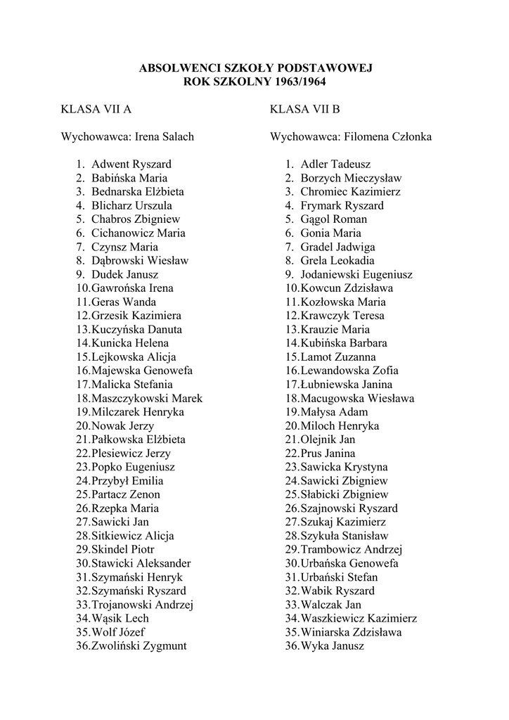 ABSOLWENCI SZKOŁY PODSTAWOWEJ ROK SZKOLNY 1963/1964 KLASA VII A KLASA VII B Wychowawca: Irena Salach Wychowawca: Filomena Członka 1. Adwent Ryszard 2. Babińska Maria 3. Bednarska Elżbieta 4. Blicharz Urszula 5. Chabros Zbigniew 6. Cichanowicz Maria 7. Czynsz Maria 8. Dąbrowski Wiesław 9. Dudek Janusz 10.Gawrońska Irena 11.Geras Wanda 12.Grzesik Kazimiera 13.Kuczyńska Danuta 14.Kunicka Helena 15.Lejkowska Alicja 16.Majewska Genowefa 17.Malicka Stefania 18.Maszczykowski Marek 19.Milczarek Henryka 20.Nowak Jerzy 21.Pałkowska Elżbieta 22.Plesiewicz Jerzy 23.Popko Eugeniusz 24.Przybył Emilia 25.Partacz Zenon 26.Rzepka Maria 27.Sawicki Jan 28.Sitkiewicz Alicja 29.Skindel Piotr 30.Stawicki Aleksander 31.Szymański Henryk 32.Szymański Ryszard 33.Trojanowski Andrzej 34.Wąsik Lech 35.Wolf Józef 36.Zwoliński Zygmunt 1. Adler Tadeusz 2. Borzych Mieczysław 3. Chromiec Kazimierz 4. Frymark Ryszard 5. Gągol Roman 6. Gonia Maria 7. Gradel Jadwiga 8. Grela Leokadia 9. Jodaniewski Eugeniusz 10.Kowcun Zdzisława 11.Kozłowska Maria 12.Krawczyk Teresa 13.Krauzie Maria 14.Kubińska Barbara 15.Lamot Zuzanna 16.Lewandowska Zofia 17.Łubniewska Janina 18.Macugowska Wiesława 19.Małysa Adam 20.Miloch Henryka 21.Olejnik Jan 22.Prus Janina 23.Sawicka Krystyna 24.Sawicki Zbigniew 25.Słabicki Zbigniew 26.Szajnowski Ryszard 27.Szukaj Kazimierz 28.Szykuła Stanisław 29.Trambowicz Andrzej 30.Urbańska Genowefa 31.Urbański Stefan 32.Wabik Ryszard 33.Walczak Jan 34.Waszkiewicz Kazimierz 35.Winiarska Zdzisława 36.Wyka Janusz 37.Zalewska Barbara 38.Ziółek Andrzej KLASA VII C Wychowawca: Mikołaj Gelmuda 1. Bartnik Zdzisław 2. Dorofiejczuk Henryka 3. Frankowski Ryszard 4. Frankowski Stanisław 5. Gańcza Maria 6. Gawlik Bogusława 7. Gomuła Stanisław 8. Gomuła Zbigniew 9. Jodłowski Kazimierz 10.Kobierski Jerzy 11.Krawczyk Zenon 12.Lipiński Henryk 13.Magdziak Henryk 14.Majer Krystyna 15.Maliszewska Ewa 16.Mikszo Lidia 17.Moczyński Stefan 18.Moskal Marian 19.Ordoński Edmund 20.Parzybut Zbigniew 21.Purgacz Stanisław 22.Pytlak Halina 23.Rucińska Kazimiera 24.Równa Danuta 25.Sobieraj Teresa 26.Ślęzak Zofia 27.Tyżyk Sławomir 28.Wilczek Teresa 29.Wróbel Genowefa 30.Wszołak Zbigniew 31.Wysocka Irena 32.Żukowska Władysława