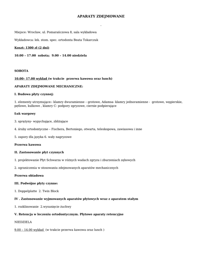 APARATY ZDEJMOWANE Miejsce: Wrocław, ul. Pomarańczowa 8, sala wykładowa Wykładowca: lek. stom. spec. ortodonta Beata Tokarczuk Koszt: 1300 zł (2 dni) 10.00 – 17.00 sobota; 9.00 – 14.00 niedziela SOBOTA 10.00– 17.00 wykład (w trakcie przerwa kawowa oraz lunch) APARATY ZDEJMOWANE MECHANICZNE: I. Budowa płyty czynnej: 1. elementy utrzymujące:- klamry dwuramienne – grotowe, Adamsa- klamry jednoramienne - grotowe, węgierskie, pętlowe, kulkowe , klamry C- podpory zgryzowe, ciernie podpierające Łuk wargowy 3. sprężyny- wypychające, zbliżające 4. śruby ortodontyczne – Fischera, Bertoniego, otwarta, teleskopowa, zawiasowa i inne 5. zapory dla języka 6. wały nagryzowe Przerwa kawowa II. Zastosowanie płyt czynnych 1. projektowanie Płyt Schwarza w różnych wadach zgryzu i zburzeniach zębowych 2. ograniczenia w stosowaniu zdejmowanych aparatów mechanicznych Przerwa obiadowa III. Podwójne płyty czynne: 1. Doppelplatte 2. Twin Block IV . Zastosowanie wyjmowanych aparatów płytowych wraz z aparatem stałym 1. rozklinowanie 2.wysunięcie żuchwy V. Retencja w leczeniu ortodontycznym. Płytowe aparaty retencyjne NIEDZIELA 9.00 – 14.00 wykład (w trakcie przerwa kawowa oraz lunch ) Część 1 - Prezentacja aparatów – zajęcia z praktyczne 1. Aparat Hawleya 2. Płyta Schwarza retencyjna 3. inne aparaty retencyjne VI. Naprawy uszkodzonych aparatów 1. rodzaje awarii śrub i ich naprawa 2. uszkodzenia akrylu 3. złamanie, odkształcenie, wymiana, dorobienie elementu drucianego VII. Dokumentacja kliniczno-laboratoryjna Przerwa obiadowa CZĘŚĆ PRAKTYCZNA: - dogięcie łuku wargowego - dogięcie klamry Adamsa – Podsumowanie Osoby uczestniczące w kursie proszone sa o zabranie ze sobą kleszczy ortodontycznych !!!! Organizator: ESDENT M. Baziuk, ul. Pomarańczowa 8, 54-058 Wrocław tel. 71 353 83 51, 603 441 785 www.ede.pl, [email protected] Opłaty za szkolenie prosimy dokonywać na 2 tygodnie przed planowanym kursem, na konto: ING BANK ŚLĄSKI S.A. 90105015751000002257704359