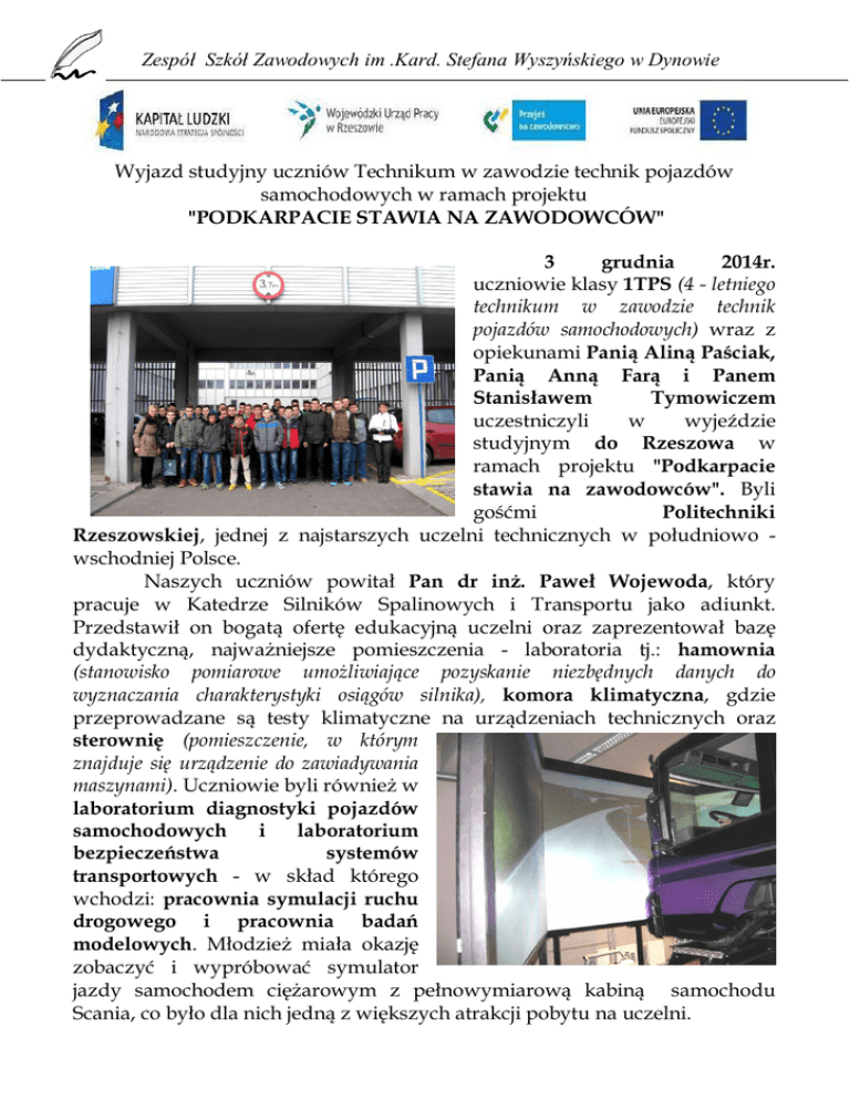 Zespół Szkół Zawodowych im .Kard. Stefana Wyszyńskiego w Dynowie Wyjazd studyjny uczniów Technikum w zawodzie technik pojazdów samochodowych w ramach projektu "PODKARPACIE STAWIA NA ZAWODOWCÓW" 3 grudnia 2014r. uczniowie klasy 1TPS (4 - letniego technikum w zawodzie technik pojazdów samochodowych) wraz z opiekunami Panią Aliną Paściak, Panią Anną Farą i Panem Stanisławem Tymowiczem uczestniczyli w wyjeździe studyjnym do Rzeszowa w ramach projektu "Podkarpacie stawia na zawodowców". Byli gośćmi Politechniki Rzeszowskiej, jednej z najstarszych uczelni technicznych w południowo wschodniej Polsce. Naszych uczniów powitał Pan dr inż. Paweł Wojewoda, który pracuje w Katedrze Silników Spalinowych i Transportu jako adiunkt. Przedstawił on bogatą ofertę edukacyjną uczelni oraz zaprezentował bazę dydaktyczną, najważniejsze pomieszczenia - laboratoria tj.: hamownia (stanowisko pomiarowe umożliwiające pozyskanie niezbędnych danych do wyznaczania charakterystyki osiągów silnika), komora klimatyczna, gdzie przeprowadzane są testy klimatyczne na urządzeniach technicznych oraz sterownię (pomieszczenie, w którym znajduje się urządzenie do zawiadywania maszynami). Uczniowie byli również w laboratorium diagnostyki pojazdów samochodowych i laboratorium bezpieczeństwa systemów transportowych - w skład którego wchodzi: pracownia symulacji ruchu drogowego i pracownia badań modelowych. Młodzież miała okazję zobaczyć i wypróbować symulator jazdy samochodem ciężarowym z pełnowymiarową kabiną samochodu Scania, co było dla nich jedną z większych atrakcji pobytu na uczelni.
