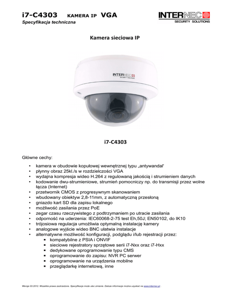 i7-C4303 KAMERA IP Specyfikacja techniczna VGA Kamera sieciowa IP i7-C4303 Główne cechy: • • • • • • • • • • • • • kamera w obudowie kopułowej wewnętrznej typu „antywandal' płynny obraz 25kl./s w rozdzielczości VGA wydajna kompresja wideo H.264 z regulowaną jakością i strumieniem danych kodowanie dwu-strumieniowe, strumień pomocniczy np. do transmisji przez wolne łącza (Internet) przetwornik CMOS z progresywnym skanowaniem wbudowany obiektyw 2,8-11mm, z automatyczną przesłoną gniazdo kart SD dla zapisu lokalnego możliwość zasilania przez PoE zegar czasu rzeczywistego z podtrzymaniem po utracie zasilania odporność na uderzenia: IEC60068-2-75 test Eh,50J; EN50102, do IK10 trójosiowa regulacja umożliwia optymalną instalację kamery analogowe wyjście wideo BNC ułatwia instalacje alternatywne możliwość konfiguracji, podglądu i/lub rejestracji przez: ▪ kompatybilne z PSIA i ONVIF ▪ sieciowe rejestratory sprzętowe serii i7-Nxx oraz i7-Hxx ▪ dedykowane oprogramowanie typu CMS ▪ oprogramowanie do zapisu: NVR PC serwer ▪ oprogramowanie na urządzenia mobilne ▪ przeglądarkę internetową, inne Wersja 03.2012. Wszelkie prawa zastrzeżone. Specyfikacja może ulec zmianie. Dalsze informacje można uzyskać na www.internec.pl . i7-C4303 KAMERA IP Specyfikacja techniczna VGA Parametry techniczne: Model Parametry Kamera Przetwornik Min. oświetlenie Elektroniczna migawka Obiektyw Kąt widzenia Mocowanie obiektywu Auto Iris Regulacja modułu Standard kompresji Kompresja wideo Strumień bitowy Kompresja audio Dwustrumieniowość Obraz Maks.rozdzielczość obrazu Liczba klatek na sekundę (fps) przy zadanej rozdzielczości Ustawienia obrazu Sieć Zapis sieciowy Alarmy Protokoły Bezpieczeństwo Kompatybilność Interfejs Interfejs komunikacyjny Wejście audio Wyjście audio Interfejs szeregowy Wejście alarmowe Wyjście alarmowe Wyjście wideo Zapis lokalny Przycisk reset Ogólne Warunki pracy Zasilanie Pobór prądu Odporność na uderzenia Wymiary Waga i7-C4303 Kamera IP CMOS w obudowie kopułowej wzmocnionej 1/4” CMOS z progresywnym skanowaniem 0.014Lux @ (F1.4, AGC ON) 1/25s -1/100,000s 2,8–11mm / F1.4 70° - 18° Φ14 Sterowanie DC 3D: poziom: 0° - 360°, pion: 0° - 75°, obrót: 0° - 360° H.264/MPEG4/MJPEG 32 Kbps~8Mbps G.711 Tak 640 x 480 50 Hz: 25 fps (640 x 480) 60 Hz: 25 fps (640 x 480) Nasycenie, Jasność, Kontrast: ustawiane przez CMS lub przeglądarkę NAS(ISCSI opcjonalnie) Detekcja ruchu, sabotaż wideo, nieuprawnione logowanie, błąd zapisu, pełna karta SD, błąd sieci IP, alarm z wejścia TCP/IP,HTTP,DHCP,DNS,DDNS,RTP/RTSP, PPPoE, SMTP, NTP, FTP (SNMP,HTTPS, SIP, SRTP, 802.1x, IPV6 opcjonalnie) Ochrona hasłem, Znak wodny ONVIF, PSIA, CGI RJ45 10M / 100M Ethernet 1 kanał wejście mikrofonowe, 3.5mm mini-jack 1 kanał 3.5mm mini-jack (liniowe, 600Ω) RS-485 2 kanały 2 kanały 1Vp-p wyjście kompozytowe (75Ω/BNC) Wsparcie dla kart SD/SDHC do 32GB, wbudowany slot Tak Wewnątrz pomieszczeń; -10℃~60℃, wilgotność maks. 90% (nieskondensowana) DC12V±10% / PoE (802.3af) 4,5W MAX IEC60068-275Eh, 50J; EN50102, do IK10 Φ 140 × 114 mm 1400g Wersja 03.2012. Wszelkie prawa zastrzeżone. Specyfikacja może ulec zmianie. Dalsze informacje można uzyskać na www.internec.pl . i7-C4303 KAMERA IP Specyfikacja techniczna VGA Zasilacz, karta SD, nie są zawarte w składzie zestawu, należy nabyć oddzielnie Informacje do zamówień: i7-C4303 Wymiary: Akcesoria: Uchwyt wewnętrzny do wpuszczenia kamery w sufit podwieszany : i7-B1227 Uchwyt ścienny z przepustem kablowym : i7-B1229 Wersja 03.2012. Wszelkie prawa zastrzeżone. Specyfikacja może ulec zmianie. Dalsze informacje można uzyskać na www.internec.pl .