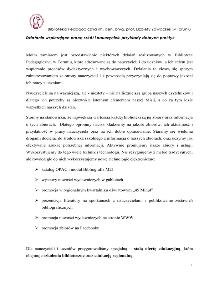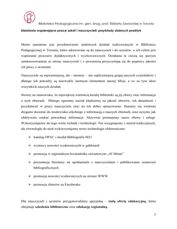 Biblioteka Pedagogiczna im. gen. bryg. prof. Elżbiety Zawackiej w Toruniu Działania wspierające pracę szkół i nauczycieli: przykłady dobrych praktyk Moim zamiarem jest przedstawienie niektórych działań realizowanych w Bibliotece Pedagogicznej w Toruniu, które adresowane są do nauczycieli i do uczniów, a ich celem jest wspieranie procesów dydaktycznych i wychowawczych. Działania te cieszą się sporym zainteresowaniem ze strony nauczycieli i z pewnością przyczyniają się do poprawy jakości ich pracy z uczniami. Nauczyciele są najważniejszą, ale - niestety – nie najliczniejszą grupą naszych czytelników i dlatego ich potrzeby są niezwykle istotnym elementem naszej Misji, a co za tym idzie wszystkich naszych działań. Stoimy na stanowisku, że największą wartością każdej biblioteki są jej zbiory oraz informacja o tych zbiorach. Dlatego ogromny nacisk kładziemy na jakość zbiorów, ich aktualność i przydatność w pracy nauczyciela oraz na ich dobre opracowanie. Staramy się wieloma drogami docierać do środowiska szkolnego z informacją o naszych zbiorach, oraz uczymy jak efektywnie szukać potrzebnej informacji. Aktywnie promujemy nasze zbiory i usługi. Wykorzystujemy do tego wiele technik i technologii. Nie rezygnujemy z metod tradycyjnych, ale równolegle do nich wykorzystujemy nowe technologie elektroniczne: katalog OPAC i moduł Bibliografia M21 wystawy nowości wydawniczych w gablotach promocja w regionalnym kwartalniku oświatowym „45 Minut” prezentacja literatury na spotkaniach z nauczycielami i publikowanie zestawień bibliograficznych promocja nowości wydawniczych na stronie WWW promocja zbiorów na Facebooku Dla nauczycieli i uczniów przygotowaliśmy specjalną – stałą ofertę edukacyjną, która obejmuje szkolenia biblioteczne oraz edukację regionalną. 1 Biblioteka Pedagogiczna im. gen. bryg. prof. Elżbiety Zawackiej w Toruniu Działania wspierające pracę szkół i nauczycieli: przykłady dobrych praktyk Lekcje biblioteczne oferujemy uczniom ze wszystkich poziomów nauczania, ale specjalny nacisk kładziemy na lekcje z uczniami przygotowującymi się do matury. Prowadzimy szkolenia e-lerningowe na platformie Moodle. W ten sposób można m.in. ukończyć podstawowe szkolenie biblioteczne, wykonać ćwiczenia uzupełniające do lekcji bibliotecznych, a nasi nauczyciele bibliotekarze mogą nauczyć się jak tworzyć kurs na platformie Moodle. Biblioteka zorganizowała w ostatnim czasie trzy konferencje dla nauczycieli, bibliotekarzy szkolnych i samorządowców z zakresu zastosowania TIK w edukacji. We współpracy z ośrodkami doskonalenia nauczycieli i Kuratorium Oświaty włączyliśmy się w organizację konferencji dla wizytatorów, doradców i konsultantów „Jak efektywnie nauczać?”. Na tę konferencję przygotowaliśmy bogaty zestaw literatury. Prowadzimy warsztaty dla nauczycieli bibliotekarzy z zakresu TIK, wyszukiwania informacji oraz z opracowania zbiorów. Dla nauczycieli innych przedmiotów mamy w ofercie warsztaty, podczas których uczą się tworzyć pomoce dydaktyczne za pomocą pakietu Hot Potatoes i programu QPprinter. Warsztaty te przeprowadziliśmy także podczas IX Konferencji "Informatyka w Edukacji" organizowanej na Wydziale Matematyki i Informatyki Uniwersytetu Mikołaja Kopernika w Toruniu. Zorganizowaliśmy warsztaty na temat edukacji matematycznej w koncepcji pedagogicznej Marii Montessori. Przy okazji organizowanych przez nas wystaw i imprez kulturalno – oświatowych zapraszamy na warsztaty uczniów. Do nich adresowaliśmy warsztaty dotyczące ekologii, wykluczenia społecznego czy wolontariatu. Organizujemy spotkania autorskie, na które zapraszamy nauczycieli i uczniów. Bibliotekarze szkolni oraz pedagodzy i psycholodzy spotkali się z Iwoną Chmielewską pod hasłem: Pamiętnik Blumki – jak rozmawiać z dziećmi na trudne tematy. 2 Biblioteka Pedagogiczna im. gen. bryg. prof. Elżbiety Zawackiej w Toruniu Działania wspierające pracę szkół i nauczycieli: przykłady dobrych praktyk Historycy mieli okazję spotkać się z p. Tomaszem S. Ceranem autorem ksiązki „Szmalcówka”. Uczniowie uczestniczyli w spotkaniach z Małgorzatą Musierowicz i z Janiną Ochojską. Udostępniamy szkołom nasze sale (wystawową i konferencyjną) na zaprezentowanie swojego dorobku. Najczęściej są to wystawy prac uczniów, albo wystawy pokonkursowe. Współorganizujemy konkursy z bibliotekarzami szkolnymi. U nas odbywają się od pięciu lat półfinały Młodzieżowego Konkursu Filatelistycznego. Zarówno uczniowie, jak i nauczyciele czują się dowartościowani mogąc zaprezentować swój dorobek, pochwalić się sukcesami poza murami szkolnymi. W ramach edukacji regionalnej współorganizujemy od 3 lat Wojewódzki Konkurs im. gen. Elżbiety Zawackiej „Oni tworzyli naszą historię”. Każdego roku na konkurs wpływa ponad 100 prac z gimnazjów i szkół średnich z całego województwa. Cenne nagrody otrzymują zarówno uczniowie jak i opiekunowie. Elżbieta Wykrzykowska Dyrektor Biblioteki Pedagogicznej im. gen. bryg. prof. Elżbiety Zawackiej w Toruniu 3