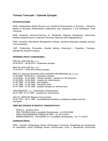 Tomasz Tomczak – Członek Zarządu WYKSZTAŁCENIE: 2008- Wielkopolska Szkoła Biznesu przy Akademii Ekonomicznej w Poznaniu , Executive Master of Business Administration realizowany przy współpracy z The Nottingham Trent University 2006- Akademia Górniczo-Hutnicza im. Stanisława Staszica, Świadectwo Ukończenia studiów podyplomowych w zakresie Górnictwo Otworowe Złóż Węglowodorów 2002- Canadian International Management Institute, szkolenie dotyczące trwałego sukcesu i roli menedżera; 1997- Politechnika Poznańska, Wydział Maszyn Roboczych i Pojazdów, Transport, specjalność transport drogowy PRZEBIEG PRACY ZAWODOWEJ: PBG OIL AND GAS Sp. z o.o. 24.04.2014- - 06.05.2014 - wiceprezes zarządu, PBG OIL AND GAS Sp. z o.o. 10.10.2012 – 23.04.2014 prezes zarządu, PBG S.A. (dawniej TECHNOLOGIE GAZOWE PIECOBIOGAZ Sp. z o.o.): 01.04.2005 - 06.05.2014 - wiceprezes zarządu, 19.03.2004 - 01.04.2005 - członek zarządu – dyrektor ds. technicznych, 01.04.2000 – 19.03.2004 - dyrektor ds. technicznych, 01.05.1999 – 01.04.2000 - szef projektu, 01.03.1998 – 01.05.1999 - kierownik robót, 01.01.1998 – 01.03.1998 - asystent zarządu ds. technicznych. „PIECOBIOGAZ „ s.c. J.Wiśniewski, M.Wiśniewska 08.12.1997 -01.01.1998 – asystent ds. technicznych. VOLVO –SERVICE Zbigniew Przymusiński 03.02.1997 – 30.11.1997 – przedstawiciel handlowy a następnie zastępca service managera. OBECNIE ZASIADA W RADACH NADZORCZYCH: − − − − FPM S.A.- od 09.01.2013, PBG TECHNOLOGIA w upadłości likwidacyjnej – od 30.04.2009, RADA PROGRAMOWA FUNDACJA PBG – od 26.10.2010, ENERGOMONTAŻ – POŁUDNIE S.A. w upadłości likwidacyjnej – od 17.12.2012. ZAŚWIADCZENIA: 2004 – Dyrektor Okręgowego Urzędu Górniczego w Poznaniu, Świadectwo do zatrudnienia na stanowisku osoby średniego dozoru technicznego ruchu o specjalności technicznej mechanicznej w zakładach górniczych wydobywających otworami wiertniczymi ropę naftową i gaz ziemny, 2004 – Armsystem, zaświadczenie nr 2436/2004 uczestnictwa w szkoleniu „ Integracja systemów Wymagania normy PN-EN ISO 14001:1998. Aspekty środowiskowe . Wymagania normy PN-N-18001:2004. Ryzyko zawodowe”, 2004 – Gdańska Fundacja Kształcenia Menedżerów – Świadectwo uczestnictwa w szkoleniu Finansowa logika podejmowania decyzji biznesowych, 2004 – SITPNiG Komisja Kwalifikacyjna nr 204, Świadectwo Kwalifikacyjne nr 134/04/204 uprawniające do zajmowania się eksploatacją urządzeń, instalacji i sieci na stanowisku DOZORU w zakresie obsługi, konserwacji, montażu, prac kontrolno-pomiarowych dla urządzeń GRUPY 3, 2004 – SITPNiG Komisja Kwalifikacyjna nr 204, Świadectwo Kwalifikacyjne nr 133/04/204 uprawniające do zajmowania się eksploatacją urządzeń, instalacji i sieci na stanowisku DOZORU w zakresie obsługi, konserwacji, montażu, prac kontrolno-pomiarowych dla urządzeń GRUPY 2, 2002 – Negocjator. Agencja Usług Szkoleniowych i Doradztwa Personalnego, ukończenie szkolenia: Sztuka prowadzenia profesjonalnej prezentacji, 2001 – BVQI – warsztaty uzupełniające dla auditorów. Pan Tomasz Tomczak nie prowadzi działalności konkurencyjnej w stosunku do działalności RAFAKO S.A. Nie uczestniczy w spółce konkurencyjnej jako wspólnik spółki cywilnej, spółki osobowej lub jako członek organu spółki kapitałowej bądź w innej konkurencyjnej osobie prawnej jako członek organu. Nie figuruje w Rejestrze Dłużników Niewypłacalnych, prowadzonym na podstawie ustawy o KRS.