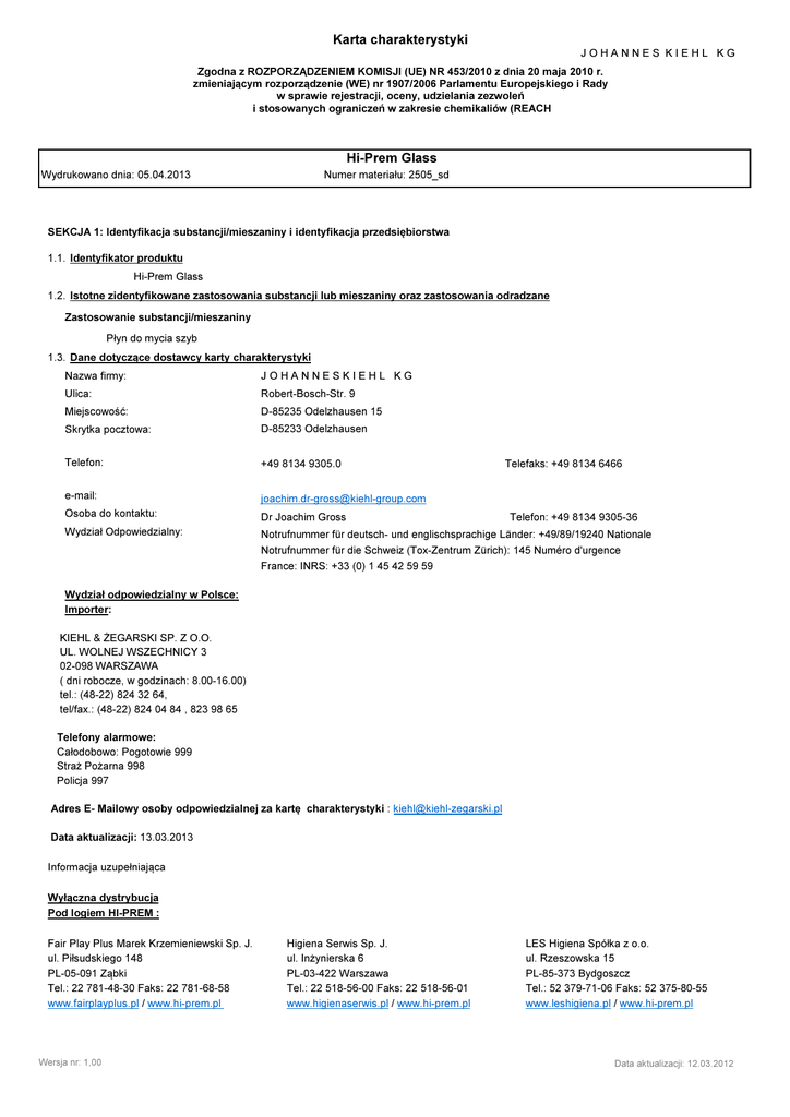Karta charakterystyki JOHANNES KIEHL KG Zgodna z ROZPORZĄDZENIEM KOMISJI (UE) NR 453/2010 z dnia 20 maja 2010 r. zmieniającym rozporządzenie (WE) nr 1907/2006 Parlamentu Europejskiego i Rady w sprawie rejestracji, oceny, udzielania zezwoleń i stosowanych ograniczeń w zakresie chemikaliów (REACH Hi-Prem Glass Wydrukowano dnia: 05.04.2013 Numer materiału: 2505_sd SEKCJA 1: Identyfikacja substancji/mieszaniny i identyfikacja przedsiębiorstwa 1.1. Identyfikator produktu Hi-Prem Glass 1.2. Istotne zidentyfikowane zastosowania substancji lub mieszaniny oraz zastosowania odradzane Zastosowanie substancji/mieszaniny Płyn do mycia szyb 1.3. Dane dotyczące dostawcy karty charakterystyki Nazwa firmy: JOHANNESKIEHL KG Ulica: Robert-Bosch-Str. 9 Miejscowość: D-85235 Odelzhausen 15 Skrytka pocztowa: D-85233 Odelzhausen Telefon: +49 8134 9305.0 e-mail: [email protected] Osoba do kontaktu: Dr Joachim Gross Wydział Odpowiedzialny: Notrufnummer für deutsch- und englischsprachige Länder: +49/89/19240 Nationale Telefaks: +49 8134 6466 Telefon: +49 8134 9305-36 Notrufnummer für die Schweiz (Tox-Zentrum Zürich): 145 Numéro d'urgence France: INRS: +33 (0) 1 45 42 59 59 Wydział odpowiedzialny w Polsce: Importer: KIEHL & ŻEGARSKI SP. Z O.O. UL. WOLNEJ WSZECHNICY 3 02-098 WARSZAWA ( dni robocze, w godzinach: 8.00-16.00) tel.: (48-22) 824 32 64, tel/fax.: (48-22) 824 04 84 , 823 98 65 Telefony alarmowe: Całodobowo: Pogotowie 999 Straż Pożarna 998 Policja 997 Adres E- Mailowy osoby odpowiedzialnej za kartę charakterystyki : [email protected] Data aktualizacji: 13.03.2013 Informacja uzupełniająca Wyłączna dystrybucja Pod logiem HI-PREM : Fair Play Plus Marek Krzemieniewski Sp. J. ul. Piłsudskiego 148 PL-05-091 Ząbki Tel.: 22 781-48-30 Faks: 22 781-68-58 www.fairplayplus.pl / www.hi-prem.pl Wersja nr: 1,00 Higiena Serwis Sp. J. ul. Inżynierska 6 PL-03-422 Warszawa Tel.: 22 518-56-00 Faks: 22 518-56-01 www.higienaserwis.pl / www.hi-prem.pl LES Higiena Spółka z o.o. ul. Rzeszowska 15 PL-85-373 Bydgoszcz Tel.: 52 379-71-06 Faks: 52 375-80-55 www.leshigiena.pl / www.hi-prem.pl Data aktualizacji: 12.03.2012 JOHANNESKIEHLKG Karta charakterystyki Hi-Prem Glass Wydrukowano dnia: 05.04.2013 Numer materiału: 2505_sd Strona 2 z 6 SEKCJA 2: Identyfikacja zagrożeń 2.1. Klasyfikacja substancji lub mieszaniny Nie wymagalne. 2.2. Elementy oznakowania 2.3. Inne zagrożenia Nie wymagane przy normalnym użyciu SEKCJA 3: Skład/informacja o składnikach (zgodnie z 648/2004/WE) 3.2. Mieszaniny Charakterystyka chemiczna Środki anionowe powierzchniowo -czynne < 5%, Środki rozpuszczalne w wodzie, Aromaty, Barwniki Składniki niebezpieczne Nr WE Nazwa chemiczna Nr CAS Klasyfikacja Nr Index Klasyfikacja GHS Ilość Nr REACH 200-661-7 alkohol izopropylowy 67-63-0 F - Produkt wysoce łatwopalny, Xi - Produkt drażniący R11-36-67 603-117-00-0 Flam. Liq. 2, Eye Irrit. 2, STOT SE 3; H225 H319 H336 5 - 10 % Dosłowne brzmienie zwrotów R i H: patrz sekcja 16. Informacja uzupełniająca Zgodnie z dyrektywą Unii Europejskiej 99/45/EG produkt ten nie jest 'preparatem niebezpiecznym'. Należy jednak przestrzegać wskazówek dotyczących bezpieczeństwa użytkowania. SEKCJA 4: Środki pierwszej pomocy 4.1. Opis środków pierwszej pomocy Wskazówki ogólne Brak zagrożeń wymagających specjalistycznej pierwszej pomocy. W przypadku wdychania Brak niebezpieczeństwa przy wdychaniu W przypadku kontaktu ze skórą Zmyć dużą ilością wody. W przypadku kontaktu z oczami Płukać starannie dużą ilością wody, również pod powiekami. W przypadku połknięcia Przemyć usta wodą i następnie wypić dużą ilość wody. Jeśli to możliwe nie dopuścić do wymiotów. Jeśli zajdzie potrzeba zasięgnij porady lekarza. 4.2. Najważniejsze ostre i opóźnione objawy oraz skutki narażenia Informacje te nie są dostępne. 4.3. Wskazania dotyczące wszelkiej natychmiastowej pomocy lekarskiej i szczególnego postępowania z poszkodowanym Przedstawić lekarzowi dołączoną Kartę Charakterystyki Substancji Niebezpiecznej. SEKCJA 5: Postępowanie w przypadku pożaru Wersja nr: 1,00 Data aktualizacji: 12.03.2012 JOHANNESKIEHLKG Karta charakterystyki Hi-Prem Glass Wydrukowano dnia: 05.04.2013 5.1. Numer materiału: 2505_sd Środki gaśnicze Odpowiednie środki gaśnicze W przypadku pożaru dopuszcza się użycie wszelkich środków przeciwpożarowych. 5.2. Szczególne zagrożenia związane z substancją lub mieszaniną Informacje te nie są dostępne. 5.3. Informacje dla straży pożarnej Użycie środków gaśniczych odpowiednich dla lokalnych warunków i dla środowiska. SEKCJA 6: Postępowanie w przypadku niezamierzonego uwolnienia do środowiska 6.1. Indywidualne środki ostrożności, wyposażenie ochronne i procedury w sytuacjach awaryjnych Nie wymagalne. 6.2. Środki ostrożności w zakresie ochrony środowiska Nie wylewać do wód powierzchniowych. 6.3. Metody i materiały zapobiegające rozprzestrzenianiu się skażenia i służące do usuwania skażenia Zebrać razem z materiałem wchłaniającym (np. szmaty, włóknina). Zebranych wycieków nigdy nie przechowywać w oryginalnych pojemnikach do ponownego użycia. 6.4. Odniesienia do innych sekcji Sprawdź środki ochronne w sekcjach 7 i 8. SEKCJA 7: Postępowanie z substancjami i mieszaninami oraz ich magazynowanie 7.1. Środki ostrożności dotyczące bezpiecznego postępowania Wskazówki odnośnie bezpiecznego obchodzenia się z substancją Nie są wymagane specjalne środki ostrożności. Wskazówki w zakresie ochrony ppoż. i przeciwwybuchowej Nie palić podczas stosowania. Przechowywać z dala od otwartego ognia, gorących powierzchni i źródeł zapłonu. 7.2. Warunki bezpiecznego magazynowania, łącznie z informacjami dotyczącymi wszelkich wzajemnych niezgodności Wymagania względem pomieszczeń i pojemników magazynowych Przechowywać w temperaturze pokojowej w oryginalnym opakowaniu. Chronić przed bezpośrednim dostępem promieni słonecznych. Przecho