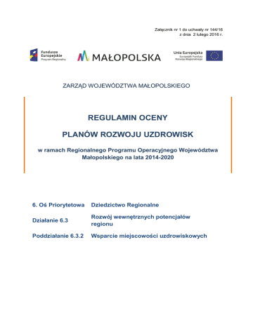 Załącznik nr 1 do uchwały nr 144/16 z dnia 2 lutego 2016 r. ZARZĄD WOJEWÓDZTWA MAŁOPOLSKIEGO REGULAMIN OCENY PLANÓW ROZWOJU UZDROWISK w ramach Regionalnego Programu Operacyjnego Województwa Małopolskiego na lata 2014-2020 6. Oś Priorytetowa Dziedzictwo Regionalne Działanie 6.3 Rozwój wewnętrznych potencjałów regionu Poddziałanie 6.3.2 Wsparcie miejscowości uzdrowiskowych ROZDZIAŁ 1. POSTANOWIENIA OGÓLNE 1.1 Informacje ogólne 1. Regulamin oceny Planów Rozwoju Uzdrowisk w ramach Regionalnego Programu Operacyjnego Województwa Małopolskiego na lata 2014-2020 dla 6. Osi priorytetowej Dziedzictwo regionalne, Działanie 6.3 Rozwój wewnętrznych potencjałów regionu, Poddziałanie 6.3.2 Wsparcie miejscowości uzdrowiskowych, zwany dalej Regulaminem, określa zasady oceny Planów Rozwoju Uzdrowisk (zwanych dalej: PRU). 2. Regulamin ma zastosowanie do etapu przedkonkursowego, który poprzedza i warunkuje przeprowadzenie właściwej procedury konkursowej w ramach poddziałania 6.3.2. 3. Ocena planów rozwoju uzdrowisk na etapie przedkonkursowym nie jest oceną projektów prowadzoną w oparciu o kryteria zatwierdzone przez Komitet Monitorujący Regionalny Program Operacyjny Województwa Małopolskiego na lata 2014-2020. Niniejszy regulamin nie stanowi regulaminu, o którym mowa w art. 41 ustawy z dnia 11 lipca 2014 r. o zasadach realizacji programów w zakresie polityki spójności finansowanych w perspektywie finansowej 2014-2020 (Dz. U. z 2014 r. poz. 1146 z późn. zm.). 4. Ocena planów rozwoju uzdrowisk obejmuje ocenę formalną i merytoryczną prowadzoną w celu uzgodnienia i zatwierdzenia planów rozwoju uzdrowisk wraz z listą planowanych, podstawowych projektów i przedsięwzięć w ramach tych planów. Etap ten kończy się sporządzeniem i opublikowaniem listy planów rozwoju uzdrowisk które przeszły pozytywnie ocenę, tj. otrzymały co najmniej 60% maksymalnej liczby punktów z oceny merytorycznej. 5. W ramach właściwego etapu wyboru projektów, o dofinansowanie ze środków RPO WM 2014 – 2020 mogą ubiegać się projekty znajdujące się na liście planowanych, podstawowych projektów i przedsięwzięć w ramach planu rozwoju uzdrowiska, który został uzgodniony i pozytywnie zaopiniowany przez IZ RPO WM. 1.2 Podstawy prawne i dokumenty programowe 1. Niniejszy Regulamin został przygotowany z uwzględnieniem zasad i założeń wynikających z następujących aktów prawnych i dokumentów programowych: a) Rozporządzenie Parlamentu Europejskiego i Rady (UE) nr 1303/2013 z dnia 17 grudnia 2013 r. ustanawiające wspólne przepisy dotyczące Europejskiego Funduszu Rozwoju Regionalnego, Europejskiego Funduszu Społecznego, Funduszu Spójności, Europejskiego Funduszu Rolnego na rzecz Rozwoju Obszarów Wiejskich oraz Europejskiego Funduszu Morskiego i Rybackiego oraz ustanawiającego przepisy ogólne dotyczące Europejskiego Funduszu Rozwoju Regionalnego, Europejskiego Funduszu Społecznego, Funduszu Spójności i Europejskiego Funduszu Morskiego i Rybackiego oraz uchylającego rozporządzenie Rady (WE) nr 1083/2006 (Dz. Urz. UE L 347 z 20.12.2013, str. 320, z późn. zm.); b) Rozporządzenie Parlamentu Europejskiego i Rady (UE) nr 1301/2013 z dnia 17 grudnia 2013 r. w sprawie Europejskiego Funduszu Rozwoju Regionalnego i przepisów szczególnych dotyczących celu „Inwestycje na rzecz wzrostu i zatrudnienia” oraz w sprawie uchylenia rozporządzenia (WE) nr 1080/2006 (Dz. Urz. UE L 347 z 20.12.2013); c) Ustawa z dnia 5 czerwca 1998 r. o samorządzie województwa (Dz. U. z 2013 r., poz. 596 z późn. zm.); d) Ustawa z dnia 11 lipca 2014 r. o zasadach realizacji programów w zakresie polityki spójności finansowanych w perspektywie finansowej 2014-2020 (Dz. U. z 2014 r. poz. 1146 z późn. zm.); e) Ustawa z dnia 9 października 2015 r. o rewitalizacji ( Dz. U. z 2015 r., poz. 1777) f) Regionalny Program Operacyjny Województwa Małopolskiego na lata 2014-2020 przyjęty Uchwałą Nr 240/15 Zarządu Województwa Małopolskiego z dnia 4 marca 2015 r.; g) Szczegółowy Opis Osi Priorytetowych Regionalnego Programu Operacyjnego Województwa Małopolskiego na lata 2014-2020 przyjęty Uchwałą Nr 757/15 Zarządu Województwa Małopolskiego z dnia 18 czerwca 2015 r. z późn. zm.; h) Podręcznik kwalifikowania wydatków objętych dofinansowaniem w ramach Regionalnego Programu Operacyjnego Województwa Małopolskiego na lata 20142020, Wytyczne programowe Instytucji Zarządzającej RPO WM 2014-2020 przyjęte Uchwałą Nr 756/15 Zarządu Województwa Małopolskiego z dnia 18 czerwca 2015 r. z późn zm.; i) Wytyczne w zakresie rewitalizacji w programach operacyjnych na lata 2014-2020. 2. Plany rozwoju uzdrowiska składane w naborze przeprowadzanym w oparciu o niniejszy Regulamin muszą być zgodne z powyższymi aktami prawnymi oraz dokumentami programowymi. 1.3 Wykaz pojęć 1. Użyte w Regulaminie pojęcia oznaczają: a) IZ – Instytucja Zarządzająca Regionalnym Programem Operacyjnym Województwa Małopolskiego na lata 2014-2020, tj. Zarząd Województwa Małopolskiego (ZWM); Instytucja organizującą nabór i ocenę PRU b) Operatora Planu - należy przez to rozumieć Gminę Uzdrowiskową, która składa do oceny plan rozwoju uzdrowiska; c) Lista planowanych, podstawowych projektów i przedsięwzięć w ramach planu rozwoju uzdrowiska – oznacza listę projektów które będą mogły ubiegać się o wsparcie w ramach 6. Osi priorytetowej Dziedzictwo regionalne, działanie 6.3 Rozwój wewnętrznych potencjałów regionu, poddziałanie 6.3.2 Wsparcie miejscowości uzdrowiskowych; d) Projekt - należy przez to rozumieć przedsięwzięcie, realizowane lub zamierzone do realizacji przez Wnioskodawcę, uwzględnione w Planie Rozwoju Uzdrowiska, e) Plan Rozwoju Uzdrowiska - należy przez to rozumieć dokument, opracowywany i przyjmowany przez właściwą gminę uzdrowiskową, niezbędny do ubiegania się o wsparcie ze środków Regionalnego Programu Operacyjnego Wojewódz