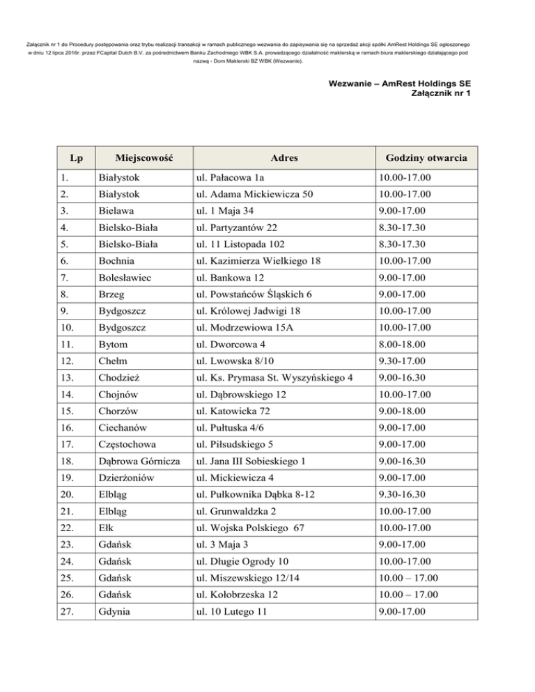 Załącznik nr 1 do Procedury postępowania oraz trybu realizacji transakcji w ramach publicznego wezwania do zapisywania się na sprzedaż akcji spółki AmRest Holdings SE ogłoszonego w dniu 12 lipca 2016r. przez FCapital Dutch B.V. za pośrednictwem Banku Zachodniego WBK S.A. prowadzącego działalność maklerską w ramach biura maklerskiego działającego pod nazwą - Dom Maklerski BZ WBK (Wezwanie). Wezwanie – AmRest Holdings SE Załącznik nr 1 Miejscowość Lp Adres Godziny otwarcia 1. Białystok ul. Pałacowa 1a 10.00-17.00 2. Białystok ul. Adama Mickiewicza 50 10.00-17.00 3. Bielawa ul. 1 Maja 34 9.00-17.00 4. Bielsko-Biała ul. Partyzantów 22 8.30-17.30 5. Bielsko-Biała ul. 11 Listopada 102 8.30-17.30 6. Bochnia ul. Kazimierza Wielkiego 18 10.00-17.00 7. Bolesławiec ul. Bankowa 12 9.00-17.00 8. Brzeg ul. Powstańców Śląskich 6 9.00-17.00 9. Bydgoszcz ul. Królowej Jadwigi 18 10.00-17.00 10. Bydgoszcz ul. Modrzewiowa 15A 10.00-17.00 11. Bytom ul. Dworcowa 4 8.00-18.00 12. Chełm ul. Lwowska 8/10 9.30-17.00 13. Chodzież ul. Ks. Prymasa St. Wyszyńskiego 4 9.00-16.30 14. Chojnów ul. Dąbrowskiego 12 10.00-17.00 15. Chorzów ul. Katowicka 72 9.00-18.00 16. Ciechanów ul. Pułtuska 4/6 9.00-17.00 17. Częstochowa ul. Piłsudskiego 5 9.00-17.00 18. Dąbrowa Górnicza ul. Jana III Sobieskiego 1 9.00-16.30 19. Dzierżoniów ul. Mickiewicza 4 9.00-17.00 20. Elbląg ul. Pułkownika Dąbka 8-12 9.30-16.30 21. Elbląg ul. Grunwaldzka 2 10.00-17.00 22. Ełk ul. Wojska Polskiego 67 10.00-17.00 23. Gdańsk ul. 3 Maja 3 9.00-17.00 24. Gdańsk ul. Długie Ogrody 10 10.00-17.00 25. Gdańsk ul. Miszewskiego 12/14 10.00 – 17.00 26. Gdańsk ul. Kołobrzeska 12 10.00 – 17.00 27. Gdynia ul. 10 Lutego 11 9.00-17.00 Załącznik nr 1 do Procedury postępowania oraz trybu realizacji transakcji w ramach publicznego wezwania do zapisywania się na sprzedaż akcji spółki AmRest Holdings SE ogłoszonego w dniu 12 lipca 2016r. przez FCapital Dutch B.V. za pośrednictwem Banku Zachodniego WBK S.A. prowadzącego działalność maklerską w ramach biura maklerskiego działającego pod nazwą - Dom Maklerski BZ WBK (Wezwanie). Lp Miejscowość Adres Godziny otwarcia 28. Gdynia ul. Starowiejska 25 10.00-17.00 29. Gliwice ul. Dolnych Wałów 1 9.30-17.30 30. Głogów ul. Obrońców Pokoju 12 9.00-18.00 31. Głogów ul. Wolności 2 10.00-17.00 32. ul. Sienkiewicza 17 9.00-17.00 ul. Kombatantów 2 8.30-17.00 ul. Bojanowskiego 22 9.30-17.00 ul. 3 Maja 8 10.00-17.00 36. Gniezno Gorzów Wielkopolski Gostyń Grodzisk Wielkopolski Grudziądz al. 23 Stycznia 42 9.30-17.00 37. Gubin ul. Piastowska 4 9.30-17.00 38. Inowrocław ul. Grodzka 5/7 9.30-17.00 39. Jarocin ul. Kilińskiego 2a 9.30-17.00 40. Jaworzno ul. Grunwaldzka 39 10.00-17.00 41. Jelenia Góra pl. Niepodległości 4 8.00-18.00 42. Kalisz ul. Parczewskiego 9a 9.00-17.00 43. Kalisz ul. Górnośląska 50 9.30-17.00 44. Kamienna Góra ul. Parkowa 1 9.00-17.00 45. Katowice ul. Katowicka 61 9.00-17.00 46. Katowice ul. Wita Stwosza 2 9.00-17.00 47. Kępno ul. Kościuszki 6 9.00-17.00 48. Kielce ul. Wspólna 2 8.00-18.00 49. Kielce ul. Warszawska 27 9.30-17.00 50. Kłodzko ul. Kościuszki 7 8.30-17.00 51. Koło ul. Zielona 2 9.00-17.00 52. Kołobrzeg ul. Gierczak 44/45 8.30-16.00 53. Konin ul. Energetyka 6a 9.00-17.00 54. Kościan al. Kościuszki 2 9.30-17.00 55. Kożuchów ul. Rynek 20 10.00-17.00 56. Kraków ul. Karmelicka 9 10.00-18.00 57. Kraków ul. Fiszera 36 9.30-17.00 58. Kraków Rynek Główny 30 10.00-18.00 33. 34. 35. Załącznik nr 1 do Procedury postępowania oraz trybu realizacji transakcji w ramach publicznego wezwania do zapisywania się na sprzedaż akcji spółki AmRest Holdings SE ogłoszonego w dniu 12 lipca 2016r. przez FCapital Dutch B.V. za pośrednictwem Banku Zachodniego WBK S.A. prowadzącego działalność maklerską w ramach biura maklerskiego działającego pod nazwą - Dom Maklerski BZ WBK (Wezwanie). Lp Miejscowość Adres Godziny otwarcia 59. Kraków ul. Wielicka 72 10.00-18.00 60. Kraków Os Kościuszkowskie 4 10.00-17.00 61. Kraków ul. Stradomska 8 10.00-17.00 62. Kraków ul. Kapelanka 17 10.00-17.00 63. Kraków ul. Królewska 55 10.30 – 17.30 64. Krosno ul. A. Lewakowskiego 23 9.30-17.00 65. Krosno Odrzańskie ul. Poznańska 21 9.30-17.00 66. Krotoszyn ul. Sienkiewicza 12a 9.30-17.00 67. Legnica ul. Gwarna 4a 8.00-18.00 68. Legnica ul. Powstańców Śląskich 1 10.00-17.00 69. Leszno ul. Słowiańska 33 9.00-17.00 70. Leszno ul. Słowiańska 50 9.30-17.00 71. Lubań pl. 3 Maja 16 9.30-17.00 72. Lubin ul. Odrodzenia 5 9.00-17.00 73. Lublin ul. Krakowskie Przedmieście 37 9.00-18.00 74. Lublin ul. Spółdzielczości Pracy 26 9.30-17.00 75. Lwówek Śląski ul. Sienkiewicza 21-23 10.00 -17.00 76. Łomża ul. Dworna 14 10.00-17.00 77. Łódź al. Piłsudskiego 3 10.00-18.00 78. Łódź ul. Sienkiewicza 24 10.00-17.00 79. Łódź ul. Wólczańska 178 10.00-17.00 80. Łódź al. Piłsudskiego 76 10.00-17.00 81. Łuków ul. Staropijarska 3 9.30-16.30 82. Mielec Al. Niepodległości 14 9.00 – 17.00 83. Myślenice ul. K.I. Gałczyńskiego 1 10.00-17.00 84. Nowa Sól ul. Moniuszki 9 9.30-17.00 85. Nowy Sącz ul. Wolności 6 9.00-17.00 86. Nowy Targ ul. Królowej Jadwigi 17 10.00 – 17.00 87. Nowy Tomyśl ul. Poznańska 13 9.30-17.00 88. Oleśnica Rynek-Ratusz 9.00-17.00 89. Olsztyn ul. Piłsudskiego 44a 10.00-17.00 Załącznik nr 1 do Procedury postępowania oraz trybu realizacji transakcji w ramach publicznego wezwania do zapisywania się na sprzedaż akcji spółki AmRest Holdings SE ogłoszonego w dniu 12 lipca 2016r. przez FCapital Dutch B.V. za pośrednictwem Banku Zachodniego WBK S.A. prowadzącego działalność maklerską w ramach biura maklerskiego działającego pod nazwą - Dom Maklerski BZ WBK (Wezwanie). Lp Miejscowość Adres Godziny otwarcia 90. Olsztyn ul. Seweryna Pieniężnego 14 10.00-17.00 91. Olsztyn Al. Wojska Polskiego 62 10.00 – 17.00 92. Oława ul. 3 Maja 2a 9.00-17.00 93. Opole ul. Ozimska 6 9