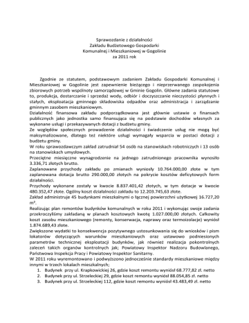 Sprawozdanie z działalności Zakładu Budżetowego Gospodarki Komunalnej i Mieszkaniowej w Gogolinie za 2011 rok Zgodnie ze statutem, podstawowym zadaniem Zakładu Gospodarki Komunalnej i Mieszkaniowej w Gogolinie jest zapewnienie bieżącego i nieprzerwanego zaspokojenia zbiorowych potrzeb wspólnoty samorządowej w Gminie Gogolin. Główne zadania statutowe to, produkcja, dostarczanie i sprzedaż wody, odbiór i doczyszczanie nieczystości płynnych i stałych, eksploatacja gminnego składowiska odpadów oraz administracja i zarządzanie gminnym zasobem mieszkaniowym. Działalność finansowa zakładu podporządkowana jest głównie ustawie o finansach publicznych jako jednostka samo finansująca się na podstawie dochodów własnych za wykonane usługi i przekazywanych dotacji z budżetu gminy. Ze względów społecznych prowadzenie działalności i świadczenie usług nie mogą być maksymalizowane, dlatego też niektóre usługi wymagały wsparcia w postaci dotacji z budżetu gminy. W roku sprawozdawczym zakład zatrudniał 54 osób na stanowiskach robotniczych i 13 osób na stanowiskach umysłowych. Przeciętne miesięczne wynagrodzenie na jednego zatrudnionego pracownika wynosiło 3.336,71 złotych brutto. Zaplanowane przychody zakładu po zmianach wyniosły 10.764.000,00 złote w tym zaplanowana dotacja brutto 290.000,00 złotych na pokrycie kosztów deficytowych form działalności. Przychody wykonane zostały w kwocie 8.837.401,42 złotych, w tym dotacje w kwocie 480.352,47 złote. Ogólny koszt działalności zakładu to 12.203.745,63 złote. Zakład administruje 45 budynkami mieszkalnymi o łącznej powierzchni użytkowej 16.727,20 m². Realizując plan remontów budynków komunalnych w roku 2011 i wykonując swoje zadania przekroczyliśmy zakładaną w planach kosztowych kwotę 1.027.000,00 złotych. Całkowity koszt zasobu mieszkaniowego (remonty, konserwacja, naprawy oraz termoizolacje) wyniósł 1.874.689,43 złote. Zwiększone wydatki to konsekwencja pozytywnego ustosunkowania się do wniosków i pism lokatorów dotyczących warunków mieszkaniowych oraz ustawowo podniesionych parametrów technicznej eksploatacji budynków, jak również realizacja pokontrolnych zaleceń takich organów kontrolnych jak; Powiatowy Inspektor Nadzoru Budowlanego, Państwowa Inspekcja Pracy i Powiatowy Inspektor Sanitarny. W 2011 roku wyremontowano i podwyższono jednocześnie standardy mieszkaniowe między innymi w trzech lokalach mieszkalnych; 1. Budynek przy ul. Krapkowickiej 26, gdzie koszt remontu wyniósł 68.777,82 zł. netto 2. Budynek przy ul. Strzeleckiej 29, gdzie koszt remontu wyniósł 88.054,85 zł. netto 3. Budynek przy ul. Strzeleckiej 112, gdzie koszt remontu wyniósł 43.483,49 zł. netto W pierwszym kwartale 2011 roku zakończono również rozpoczęty w 2010 roku remont sześciorodzinnego budynku przy ulicy Strzeleckiej 101 (klatka schodowa, kotłownia, elewacja budynku, utwardzenie podwórka), którego to koszt wyniósł 44.580,41 złotych. Wykonując planowe zadania związane z dokończeniem termoizolacji budynków zrealizowano następujące zadania; 1. Budynek przy ul. Ligonia 3 - koszt 41.914,94 zł. netto 2. Budynek przy ul. Krapkowicka 3 - koszt 41.962,11 zł. netto 3. Budynek przy ul. Krapkowicka 87 - koszt 50494,21 zł netto. W 2011 roku wykonano również dwie decyzje Powiatowego Inspektora Nadzoru Budowlanego w Krapkowicach. Wykonanie decyzji nr 52/2010 dot. wzmocnienia i ocieplenia trzech zewnętrznych ścian budynku przy ul. Konopnickiej 9 w Gogolinie kosztowało nas w sumie 80.611,78 złotych, z czego 33.306,05 zł. kosztowało wzmocnienie ścian, natomiast termoizolacja tych ścian kosztowała 47.305,73 złote. Druga decyzja nr 36/2011 dot. rozbiórki zabudowań mieszkalnych i gospodarczych przy ul. Konopnickiej 3-5 w Gogolinie kosztowała nas 40.824,13 złotych. Uwzględniając zalecenia pokontrolne Państwowej Inspekcji Pracy wykonano remont pomieszczeń łaźni i szatni w budynku administracyjnym na łączną kwotę 100.202,33 złote. Łącznie robotami remontowo-budowlanymi i konserwacyjnymi objęto 26 budynków i dotyczyły 47 lokali mieszkalnych z 212 mieszkań, które są w naszym administrowaniu. Przychody związane z prowadzeniem gospodarki mieszkaniowej (czynsze, reklamy, ekipa remontowo-budowlana, itp.), to kwota zaledwie 1.077863,83 złote, co stanowi 94,9% przyjętego planu na 2011 rok. Na pokrycie kosztów napraw i remontów w administrowanych zasobach mieszkaniowych zakład otrzymał zaledwie 130.000,00 złotych. W związku z czym dział ten osiągnął stratę w wysokości 796.825,60 złotych. Ponadto zaległości czynszowe najemców względem naszego zakładu wynoszą 17.316,73 złote oraz zaległości za media (woda, ścieki, śmieci i inne) 20.076,62 złote. Środki te sukcesywnie poprzez nasze służby windykacyjne są powoli odzyskiwane, ale wymaga to dużo staranności i czasu. Wobec dłużników prowadzone są działania windykacyjne zgodnie z obowiązującymi przepisami w tym zakresie, wysyłane są upomnienia, wezwania do zapłaty, sprawy kierowane do sądu o nakaz zapłaty oraz egzekucji komorniczej. Pracownicy działu remontowego realizowali również zlecenia Urzędu Miejskiego na kwotę 57.416,58 złotych, które dotyczyły remontów i wymiany drogowego oznakowania pionowego i poziomego na drogach gminnych. W zakresie gospodarki wodno-ściekowej, koszty prowadzonej działalności wyniosły 6.140.572,74 złote, a przychody 3.590.649,82 złote. Cała działalność zamknęła się wynikiem ujemnym na kwotę 2.549.922,92 złote, po uwzględnieniu przyznanej dotacji w kwocie 112.706,82 złote. Powodem zaistniałej sytuacji było między innymi utrzymywanie niezmienionych cen za dostarczanie wody i odbiór ścieków przez ponad 1,5 roku oraz naliczenie po raz pierwszy kosztów amortyzacji w kwocie 2.297.751,85 złotych. W roku 2011 zakład nasz wyprodukował 497,8 tys. m³ wody, przy czym mieszkańcom sprzedał 368,5 tys. m³ wody. St