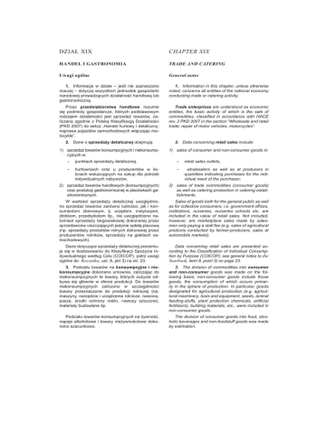 DZIAŁ XIX CHAPTER XIX HANDEL I GASTRONOMIA TRADE AND CATERING Uwagi ogólne General notes 1. Informacje w dziale – jeśli nie zaznaczono inaczej – dotyczą wszystkich jednostek gospodarki narodowej prowadzących działalność handlową lub gastronomiczną. 1. Information in this chapter, unless otherwise noted, concerns all entities of the national economy conducting trade or catering activity. Przez przedsiębiorstwa handlowe rozumie się podmioty gospodarcze, których podstawowym rodzajem działalności jest sprzedaż towarów, zaliczana zgodnie z Polską Klasyfikacją Działalności (PKD 2007) do sekcji „Handel hurtowy i detaliczny; naprawa pojazdów samochodowych włączając motocykle”. Trade enterprises are understood as economic entities, the basic activity of which is the sale of commodities, classified in accordance with NACE rev. 2 PKD 2007 in the section “Wholesale and retail trade; repair of motor vehicles, motorcycles”. 2. Dane o sprzedaży detalicznej obejmują: 1) sprzedaż towarów konsumpcyjnych i niekonsumpcyjnych w: 2. Data concerning retail sales include: 1) sales of consumer and non-consumer goods in: – punktach sprzedaży detalicznej, – retail sales outlets, – hurtowniach oraz u producentów w ilościach wskazujących na zakup dla potrzeb indywidualnych nabywców; – wholesalers as well as at producers in quantities indicating purchases for the individual need of the purchaser; 2) sprzedaż towarów handlowych (konsumpcyjnych) oraz produkcji gastronomicznej w placówkach gastronomicznych. 2) sales of trade commodities (consumer goods) as well as catering production in catering establishments. W wartości sprzedaży detalicznej uwzględniono sprzedaż towarów zarówno ludności, jak i konsumentom zbiorowym, tj. urzędom, instytucjom, żłobkom, przedszkolom itp., nie uwzględniono natomiast sprzedaży targowiskowej dokonanej przez sprzedawców uiszczających jedynie opłatę placową (np. sprzedaży produktów rolnych dokonanej przez producentów rolników, sprzedaży na giełdach samochodowych). Sales of goods both for the general public as well as for collective consumers, i.e. government offices, institutions, nurseries, nurseries schools etc. are included in the value of retail sales. Not included, however, are marketplace sales made by salesmen only paying a stall fee (e.g. sales of agricultural products conducted by farmer-producers, sales at automobile markets). Dane dotyczące sprzedaży detalicznej prezentuje się w dostosowaniu do Klasyfikacji Spożycia Indywidualnego według Celu (COICOP); patrz uwagi ogólne do Rocznika, ust. 8, pkt 3) na str. 23. Data concerning retail sales are presented according to the Classification of Individual Consumption by Purpose (COICOP); see general notes to the Yearbook, item 8, point 3) on page 23. 3. Podziału towarów na konsumpcyjne i niekonsumpcyjne dokonano umownie, zaliczając do niekonsumpcyjnych te towary, których zużycie odbywa się głównie w sferze produkcji. Do towarów niekonsumpcyjnych zaliczono w szczególności towary przeznaczone do produkcji rolniczej (np. maszyny, narzędzia i urządzenia rolnicze, nasiona, pasze, środki ochrony roślin, nawozy sztuczne), materiały budowlane itp. 3. The division of commodities into consumer and non-consumer goods was made on the following basis; non-consumer goods include those goods, the consumption of which occurs primarily in the sphere of production. In particular, goods designated for agricultural production (e.g. agricultural machinery, tools and equipment, seeds, animal feeding-stuffs, plant protection chemicals, artificial fertilizers), building materials, etc., were included in non-consumer goods. Podziału towarów konsumpcyjnych na żywność, napoje alkoholowe i towary nieżywnościowe dokonano szacunkowo. The division of consumer goods into food, alcoholic beverages and non-foodstuff goods was made by estimation. Trade and catering 349 4. Dane o sprzedaży hurtowej towarów obejmują sprzedaż z magazynów handlowych własnych bądź użytkowanych, w których składowane towary stanowią własność przedsiębiorstwa handlowego. Do wartości sprzedaży hurtowej zalicza się również wartość sprzedaży zrealizowanej na zasadzie bezpośredniej płatności lub kontraktu (agenci, aukcjonerzy), jak również wartość sprzedaży zrealizowanej przez tranzyt rozliczany, polegający na przekazywaniu towarów bezpośrednio od dostawcy do odbiorcy z pominięciem magazynów, które tę dostawę realizują. 4. Data regarding the wholesale sale of commodities include sales from own or commercial warehouses in which the commodities stored account for the property of a trade enterprise. The value of wholesale sales also includes the value of sales realized on the basis of a direct payment or contract (agents, auctioneers), as well as the value of sales realized by settled transit consisting in the transfer of commodities directly from the supplier to the client, by-passing the warehouses which realize the delivery. 5. Podziału sklepów według form organizacyjnych dokonano na podstawie wielkości powierzchni sprzedażowej sklepów i rodzaju sprzedawanych w nich towarów. 5. The division of stores by organizational form was made on the basis of the area of the sales floor and the types of goods sold. Domy towarowe i handlowe są to sklepy wielodziałowe, prowadzące sprzedaż szerokiego i uniwersalnego asortymentu, głównie towarów nieżywnościowych, o powierzchni sal sprzedażowych: domy towarowe – 2000 m2 i więcej, domy handlowe – od 600 do 1999 m2. Department stores and trade stores are stores with multiple departments, selling a broad and universal assortment, primarily non-foodstuff goods, with a sales floor area of 2000 m2 and more for department stores and from 600 to 1999 m2 for trade stores. Supermarkety są to sklepy o powierzchni sprzedażowej od 400 m2 do 2499 m2 prowadzące sprzedaż głównie w systemie samoobsługowym, of