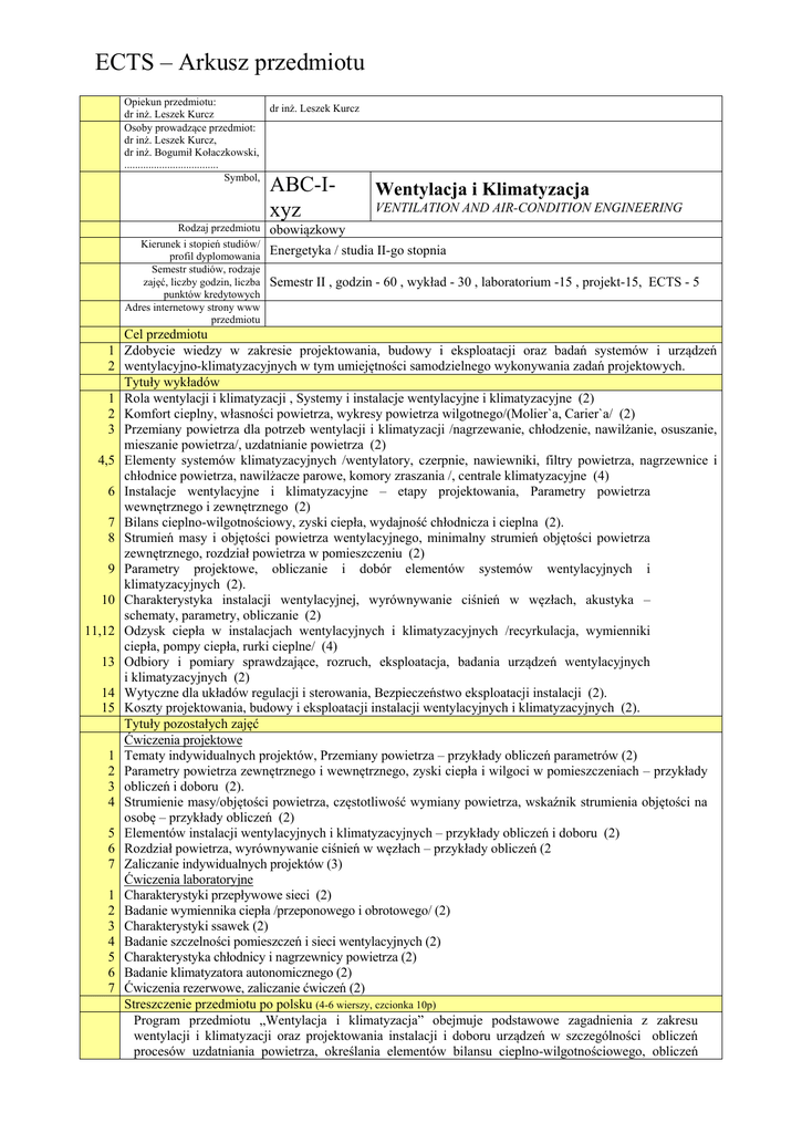 ECTS – Arkusz przedmiotu Opiekun przedmiotu: dr inż. Leszek Kurcz dr inż. Leszek Kurcz Osoby prowadzące przedmiot: dr inż. Leszek Kurcz, dr inż. Bogumił Kołaczkowski, ................................... Symbol, ABC-Ixyz Rodzaj przedmiotu Kierunek i stopień studiów/ profil dyplomowania Semestr studiów, rodzaje zajęć, liczby godzin, liczba punktów kredytowych Adres internetowy strony www przedmiotu Wentylacja i Klimatyzacja VENTILATION AND AIR-CONDITION ENGINEERING obowiązkowy Energetyka / studia II-go stopnia Semestr II , godzin - 60 , wykład - 30 , laboratorium -15 , projekt-15, ECTS - 5 Cel przedmiotu 1 Zdobycie wiedzy w zakresie projektowania, budowy i eksploatacji oraz badań systemów i urządzeń 2 wentylacyjno-klimatyzacyjnych w tym umiejętności samodzielnego wykonywania zadań projektowych. Tytuły wykładów 1 Rola wentylacji i klimatyzacji , Systemy i instalacje wentylacyjne i klimatyzacyjne (2) 2 Komfort cieplny, własności powietrza, wykresy powietrza wilgotnego/(Molier`a, Carier`a/ (2) 3 Przemiany powietrza dla potrzeb wentylacji i klimatyzacji /nagrzewanie, chłodzenie, nawilżanie, osuszanie, mieszanie powietrza/, uzdatnianie powietrza (2) 4,5 Elementy systemów klimatyzacyjnych /wentylatory, czerpnie, nawiewniki, filtry powietrza, nagrzewnice i chłodnice powietrza, nawilżacze parowe, komory zraszania /, centrale klimatyzacyjne (4) 6 Instalacje wentylacyjne i klimatyzacyjne – etapy projektowania, Parametry powietrza wewnętrznego i zewnętrznego (2) 7 Bilans cieplno-wilgotnościowy, zyski ciepła, wydajność chłodnicza i cieplna (2). 8 Strumień masy i objętości powietrza wentylacyjnego, minimalny strumień objętości powietrza zewnętrznego, rozdział powietrza w pomieszczeniu (2) 9 Parametry projektowe, obliczanie i dobór elementów systemów wentylacyjnych i klimatyzacyjnych (2). 10 Charakterystyka instalacji wentylacyjnej, wyrównywanie ciśnień w węzłach, akustyka – schematy, parametry, obliczanie (2) 11,12 Odzysk ciepła w instalacjach wentylacyjnych i klimatyzacyjnych /recyrkulacja, wymienniki ciepła, pompy ciepła, rurki cieplne/ (4) 13 Odbiory i pomiary sprawdzające, rozruch, eksploatacja, badania urządzeń wentylacyjnych i klimatyzacyjnych (2) 14 Wytyczne dla układów regulacji i sterowania, Bezpieczeństwo eksploatacji instalacji (2). 15 Koszty projektowania, budowy i eksploatacji instalacji wentylacyjnych i klimatyzacyjnych (2). Tytuły pozostałych zajęć Ćwiczenia projektowe 1 Tematy indywidualnych projektów, Przemiany powietrza – przykłady obliczeń parametrów (2) 2 Parametry powietrza zewnętrznego i wewnętrznego, zyski ciepła i wilgoci w pomieszczeniach – przykłady 3 obliczeń i doboru (2). 4 Strumienie masy/objętości powietrza, częstotliwość wymiany powietrza, wskaźnik strumienia objętości na osobę – przykłady obliczeń (2) 5 Elementów instalacji wentylacyjnych i klimatyzacyjnych – przykłady obliczeń i doboru (2) 6 Rozdział powietrza, wyrównywanie ciśnień w węzłach – przykłady obliczeń (2 7 Zaliczanie indywidualnych projektów (3) Ćwiczenia laboratoryjne 1 Charakterystyki przepływowe sieci (2) 2 Badanie wymiennika ciepła /przeponowego i obrotowego/ (2) 3 Charakterystyki ssawek (2) 4 Badanie szczelności pomieszczeń i sieci wentylacyjnych (2) 5 Charakterystyka chłodnicy i nagrzewnicy powietrza (2) 6 Badanie klimatyzatora autonomicznego (2) 7 Ćwiczenia rezerwowe, zaliczanie ćwiczeń (2) Streszczenie przedmiotu po polsku (4-6 wierszy, czcionka 10p) Program przedmiotu „Wentylacja i klimatyzacja” obejmuje podstawowe zagadnienia z zakresu wentylacji i klimatyzacji oraz projektowania instalacji i doboru urządzeń w szczególności obliczeń procesów uzdatniania powietrza, określania elementów bilansu cieplno-wilgotnościowego, obliczeń ECTS – Arkusz przedmiotu ilości i rozdziału powietrza, doboru urządzeń i aparatury, określania kosztów. Program realizowany jest w ramach wykładu, ćwiczeń laboratoryjnych i ćwiczeń projektowych uzupełnionych indywidualnymi projektami wykonywanymi przez studentów. Streszczenie przedmiotu po angielsku (4-6 wierszy, czcionka 10p) The area covered by the program of subject “Ventilation and air-condition” is problems specjally principles of apparatuses /installations/ engineering design and methods of calculation in many aspects such as air treatment, air flow control, heat and humidity balance, selecting air-condition systems and costs of installations. The subject is realised by the lecture, project and laboratory exercise with the supplementary individual student project works. Bibliografia (2-5 podstawowych pozycji) w ujęciu wymaganym w Wyd. Nauk AGH. Wskazane książki i skrypty wykładowców oraz literatura w języku angielskim 1.1 2.2 3.3 4.4 5.5 Jones W.P.: Klimatyzacja. Arkady, Warszawa, 2001 Ulrich H.J.: Technika klimatyzacyjna. Poradnik. I.P.P.U. MASTA Sp. z o.o., 2001 Malicki M.: Wentylacja i klimatyzacja. PWN, W-wa, 1980. Przydrożny S., Ferencowicz J.: Klimatyzacja, PW skrypt, Wrocław, 1998 Recknagel H. i in.: Ogrzewanie i klimatyzacja. Poradnik. EWFE, Gdańsk, 1994. Forma zaliczenia przedmiotu, w nawiasie (czcionka pochyła) po angielsku Zasada wystawiania oceny końcowej, w nawiasie (czcionka pochyła) po angielsku Słowa kluczowe (5) w j polskim i angielskim Zaliczenie i egzamin Wentylacja, klimatyzacja, projektowanie