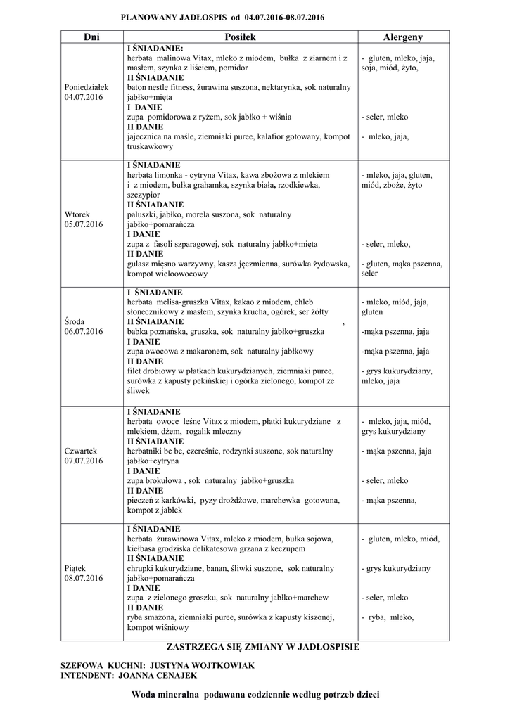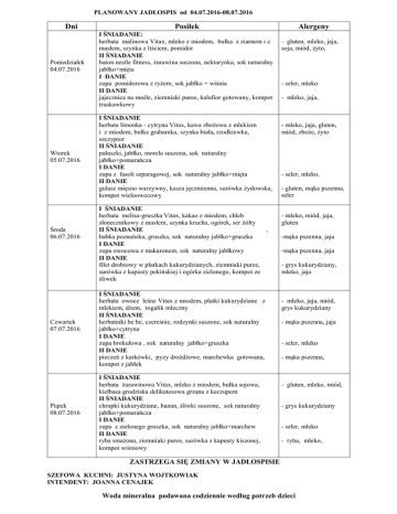 PLANOWANY JADŁOSPIS od 04.07.2016-08.07.2016 Dni Poniedziałek 04.07.2016 Wtorek 05.07.2016 Środa 06.07.2016 Czwartek 07.07.2016 Piątek 08.07.2016 Posiłek I ŚNIADANIE: herbata malinowa Vitax, mleko z miodem, bułka z ziarnem i z masłem, szynka z liściem, pomidor II ŚNIADANIE baton nestle fitness, żurawina suszona, nektarynka, sok naturalny jabłko+mięta I DANIE zupa pomidorowa z ryżem, sok jabłko + wiśnia II DANIE jajecznica na maśle, ziemniaki puree, kalafior gotowany, kompot truskawkowy I ŚNIADANIE herbata limonka - cytryna Vitax, kawa zbożowa z mlekiem i z miodem, bułka grahamka, szynka biała, rzodkiewka, szczypior II ŚNIADANIE paluszki, jabłko, morela suszona, sok naturalny jabłko+pomarańcza I DANIE zupa z fasoli szparagowej, sok naturalny jabłko+mięta II DANIE gulasz mięsno warzywny, kasza jęczmienna, surówka żydowska, kompot wieloowocowy I ŚNIADANIE herbata melisa-gruszka Vitax, kakao z miodem, chleb słonecznikowy z masłem, szynka krucha, ogórek, ser żółty II ŚNIADANIE , babka poznańska, gruszka, sok naturalny jabłko+gruszka I DANIE zupa owocowa z makaronem, sok naturalny jabłkowy II DANIE filet drobiowy w płatkach kukurydzianych, ziemniaki puree, surówka z kapusty pekińskiej i ogórka zielonego, kompot ze śliwek I ŚNIADANIE herbata owoce leśne Vitax z miodem, płatki kukurydziane z mlekiem, dżem, rogalik mleczny II ŚNIADANIE herbatniki be be, czereśnie, rodzynki suszone, sok naturalny jabłko+cytryna I DANIE zupa brokułowa , sok naturalny jabłko+gruszka II DANIE pieczeń z karkówki, pyzy drożdżowe, marchewka gotowana, kompot z jabłek I ŚNIADANIE herbata żurawinowa Vitax, mleko z miodem, bułka sojowa, kiełbasa grodziska delikatesowa grzana z keczupem II ŚNIADANIE chrupki kukurydziane, banan, śliwki suszone, sok naturalny jabłko+pomarańcza I DANIE zupa z zielonego groszku, sok naturalny jabłko+marchew II DANIE ryba smażona, ziemniaki puree, surówka z kapusty kiszonej, kompot wiśniowy Alergeny - gluten, mleko, jaja, soja, miód, żyto, - seler, mleko - mleko, jaja, - mleko, jaja, gluten, miód, zboże, żyto - seler, mleko, - gluten, mąka pszenna, seler - mleko, miód, jaja, gluten -mąka pszenna, jaja -mąka pszenna, jaja - grys kukurydziany, mleko, jaja - mleko, jaja, miód, grys kukurydziany - mąka pszenna, jaja - seler, mleko - mąka pszenna, - gluten, mleko, miód, - grys kukurydziany - seler, mleko - ryba, mleko, ZASTRZEGA SIĘ ZMIANY W JADŁOSPISIE SZEFOWA KUCHNI: JUSTYNA WOJTKOWIAK INTENDENT: JOANNA CENAJEK Woda mineralna podawana codziennie według potrzeb dzieci