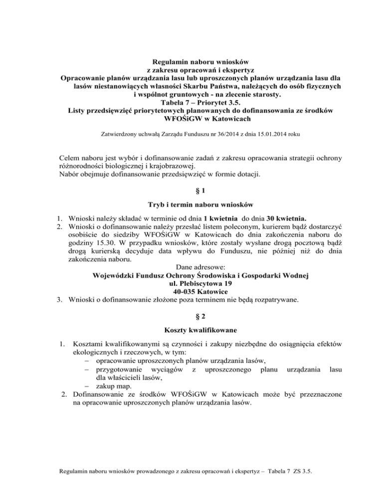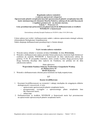 Regulamin naboru wniosków z zakresu opracowań i ekspertyz Opracowanie planów urządzania lasu lub uproszczonych planów urządzania lasu dla lasów niestanowiących własności Skarbu Państwa, należących do osób fizycznych i wspólnot gruntowych - na zlecenie starosty. Tabela 7 – Priorytet 3.5. Listy przedsięwzięć priorytetowych planowanych do dofinansowania ze środków WFOŚiGW w Katowicach Zatwierdzony uchwałą Zarządu Funduszu nr 36/2014 z dnia 15.01.2014 roku Celem naboru jest wybór i dofinansowanie zadań z zakresu opracowania strategii ochrony różnorodności biologicznej i krajobrazowej. Nabór obejmuje dofinansowanie przedsięwzięć w formie dotacji. §1 Tryb i termin naboru wniosków 1. Wnioski należy składać w terminie od dnia 1 kwietnia do dnia 30 kwietnia. 2. Wnioski o dofinansowanie należy przesłać listem poleconym, kurierem bądź dostarczyć osobiście do siedziby WFOŚiGW w Katowicach do dnia zakończenia naboru do godziny 15.30. W przypadku wniosków, które zostały wysłane drogą pocztową bądź drogą kurierską decyduje data wpływu do Funduszu, nie później niż do dnia zakończenia naboru. Dane adresowe: Wojewódzki Fundusz Ochrony Środowiska i Gospodarki Wodnej ul. Plebiscytowa 19 40-035 Katowice 3. Wnioski o dofinansowanie złożone poza terminem nie będą rozpatrywane. §2 Koszty kwalifikowane 1. Kosztami kwalifikowanymi są czynności i zakupy niezbędne do osiągnięcia efektów ekologicznych i rzeczowych, w tym: − opracowanie uproszczonych planów urządzania lasów, − przygotowanie wyciągów z uproszczonego planu urządzania lasu dla właścicieli lasów, − zakup map. 2. Dofinansowanie ze środków WFOŚiGW w Katowicach może być przeznaczone na opracowanie uproszczonych planów urządzania lasów. Regulamin naboru wniosków prowadzonego z zakresu opracowań i ekspertyz – Tabela 7 ZS 3.5. §3 Wysokość i warunki dofinansowania Zgodnie z „Zasadami udzielania dofinansowania ze środków WFOŚiGW w Katowicach” wysokość dofinansowania w formie dotacji może wynosić do 80% kosztów kwalifikowanych, z uwzględnieniem efektów zadania i możliwości finansowych Funduszu. §4 Wnioski i załączniki 1. Warunkiem przystąpienia do konkursu jest złożenie: a) Wniosku A, b) Wniosku B1 wraz z załącznikami: − harmonogramem rzeczowo – finansowym, − potwierdzeniem posiadania udziału środków własnych, pozyskanych z innych źródeł (np. wyciąg z uchwały budżetowej, kopia umowy) lub oświadczeniem, − dokumentami określającymi status prawny wnioskodawcy c) Załącznika dodatkowego: − deklaracji wnioskodawcy, co do sposobu wykorzystania i wdrożenia wyników pracy. 2. Składane dokumenty winny być aktualnie datowane, opatrzone pieczęcią wnioskodawcy i podpisane przez osoby uprawnione bądź upoważnione do imiennymi reprezentowania wnioskodawcy oraz opatrzone pieczątkami i stanowiskowymi osób składających na nich podpisy. Kopie dokumentów lub wyciągi z dokumentów powinny być uwierzytelnione za zgodność z oryginałem przez osoby do tego uprawnione lub upoważnione. 3. Wzory wniosków dostępne na stronie Funduszu www.wfosigw.katowice.pl §5 Kryteria wyboru 1. Kryteria formalne : − zadnie zgodne z „Listą przedsięwzięć…”, − wniosek wypełnione czytelnie, − wypełnione wszystkie pola, tabele, oświadczenia zawarte we wniosku. W przypadku punktów, które nie dotyczą beneficjenta należy wstawić kreskę lub wpisać „nie dotyczy”, − wyczerpujący i adekwatny do przedsięwzięcia opis zadania, − wniosek podpisany przez osoby uprawnione lub upoważnione, − w przypadku braku pieczęci imiennych wymagane jest złożenie czytelnych podpisów, − załączniki dołączone do wniosku powinny być oryginalne lub potwierdzone za zgodność z oryginałem na każdej stronnie kopii, − wniosek zawiera wszystkie wymagane załączniki. 2. Kryteria merytoryczne Ocenie merytorycznej będzie podlegać: − koszt zadania, wysokość współfinansowania z innych źródeł, − stosunek kosztu zadania do powierzchni lasu. Regulamin naboru wniosków prowadzonego z zakresu opracowań i ekspertyz – Tabela 7 ZS 3.5. §6 Procedura rozpatrywania wniosków 1. Wnioski będą podlegać ocenie formalnej i merytorycznej. 2. W trakcie oceny dopuszcza się jednorazowe złożenie wyjaśnień lub złożenie dodatkowych dokumentów w terminie do 30 dni od daty zakończenia naboru. O konieczności uzupełnień Wnioskodawca będzie powiadomiony drogą elektroniczną, faksem lub drogą pocztową. 3. Ocena wniosków zakończy się w terminie do 6 tygodni od daty zakończenia naboru. 4. Zarząd Funduszu podejmuje decyzję o dofinansowaniu realizacji zadania po pozytywnej ocenie wniosku. 5. Informacja o rozstrzygnięciu naboru zostanie umieszczona na stronie internetowej Funduszu. 6. Wnioskodawca zostanie powiadomiony o zakwalifikowaniu wniosku do dofinansowania lub odrzuceniu wniosku. §7 Postanowienia końcowe 1. 2. 3. 4. Od podjętych decyzji nie przysługuje odwołanie. Złożenie wniosku nie jest równoznaczne z przyznaniem dotacji. Kwota przyznanej dotacji może być niższa od wnioskowanej. W kwestiach nieobjętych niniejszym regulaminem obowiązują: − Zasady udzielania dofinansowania ze środków WFOŚIGW w Katowicach. − Kryteria wyboru przedsięwzięć finansowanych ze środków WFOŚIGW w Katowicach. 5. Niniejszy regulamin nie dotyczy państwowych jednostek budżetowych. Regulamin naboru wniosków prowadzonego z zakresu opracowań i ekspertyz – Tabela 7 ZS 3.5.