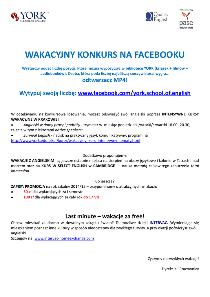 WAKACYJNY KONKURS NA FACEBOOKU Wystarczy podać liczbę pozycji, które można wypożyczyć w bibliotece YORK (książek + filmów + audiobooków). Osoba, która poda liczbę najbliższą rzeczywistości wygra... odtwarzacz MP4! Wytypuj swoją liczbę: www.facebook.com/york.school.of.english W oczekiwaniu na konkursowe losowanie, możesz odświeżyć swój angielski poprzez INTENSYWNE KURSY WAKACYJNE W KRAKOWIE! Angielski w domy pracy i podróży - trymestr w miesiąc poniedziałki/wtorki/czwartki 18.00–20.30; zajęcia w tym z lektorami native speakers; Survival English - nacisk na praktyczny język komunikatywny: program na http://www.york.edu.pl/pl/kursy/wakacyjny_kurs_intensywny_tematy.html Dodatkowo proponujemy: WAKACJE Z ANGIELSKIM są jeszcze ostatnie miejsca na sierpień na obozy językowe i kolonie w Tatrach i nad morzem oraz na KURS W SELECT ENGLISH w CAMBRIDGE – nauka metodą całkowitego zanurzenia total immersion. Co jeszcze? ZAPISY: PROMOCJA na rok szkolny 2014/15 – przypominamy o atrakcyjnych zniżkach: 50 zł dla wpłacających za I semestr 100 zł dla wpłacających za cały rok do 17 VII Last minute – wakacje za free! Chcesz mieszkać za darmo w dowolnym zakątku świata? To możliwe dzięki INTERVAC. Wymieniając się mieszkaniem poznasz inne kultury w sposób niedostępny dla zwykłego turysty, a przy okazji poćwiczysz swój... angielski. Szczegóły na: www.intervac-homeexchange.com Życzymy niezwykłych wakacji! Dyrekcja i Pracownicy