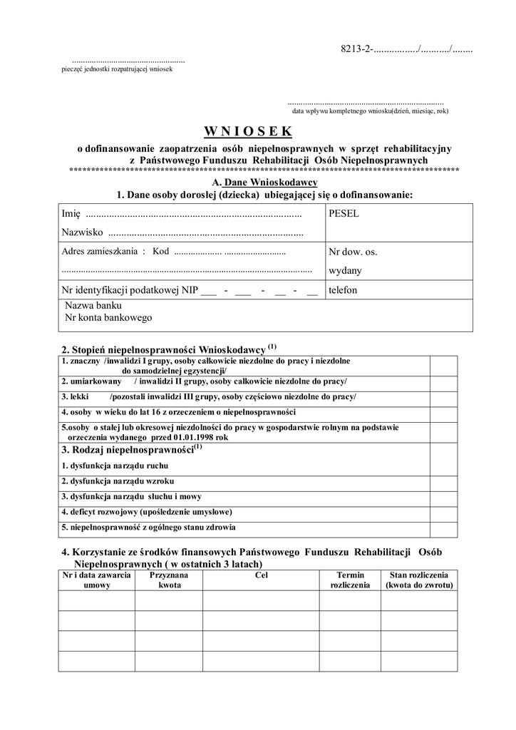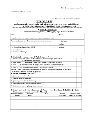8213-2-................./.........../........ .................................................... pieczęć jednostki rozpatrującej wniosek ........................................................................ data wpływu kompletnego wniosku(dzień, miesiąc, rok) WNIOSEK o dofinansowanie zaopatrzenia osób niepełnosprawnych w sprzęt rehabilitacyjny z Państwowego Funduszu Rehabilitacji Osób Niepełnosprawnych ****************************************************************************************** A. Dane Wnioskodawcy 1. Dane osoby dorosłej (dziecka) ubiegającej się o dofinansowanie: Imię ................................................................................... PESEL Nazwisko ........................................................................... Adres zamieszkania : Kod .................... .......................... Nr dow. os. ......................................................................................................... wydany Nr identyfikacji podatkowej NIP ___ - ___ - __ - __ Nazwa banku Nr konta bankowego telefon 2. Stopień niepełnosprawności Wnioskodawcy (1) 1. znaczny /inwalidzi I grupy, osoby całkowicie niezdolne do pracy i niezdolne do samodzielnej egzystencji/ 2. umiarkowany / inwalidzi II grupy, osoby całkowicie niezdolne do pracy/ 3. lekki /pozostali inwalidzi III grupy, osoby częściowo niezdolne do pracy/ 4. osoby w wieku do lat 16 z orzeczeniem o niepełnosprawności 5.osoby o stałej lub okresowej niezdolności do pracy w gospodarstwie rolnym na podstawie orzeczenia wydanego przed 01.01.1998 rok 3. Rodzaj niepełnosprawności(1) 1. dysfunkcja narządu ruchu 2. dysfunkcja narządu wzroku 3. dysfunkcja narządu słuchu i mowy 4. deficyt rozwojowy (upośledzenie umysłowe) 5. niepełnosprawność z ogólnego stanu zdrowia 4. Korzystanie ze środków finansowych Państwowego Funduszu Rehabilitacji Osób Niepełnosprawnych ( w ostatnich 3 latach) Nr i data zawarcia umowy Przyznana kwota Cel Termin rozliczenia Stan rozliczenia (kwota do zwrotu) B. Informacja o przedmiocie wniosku 1. Przedmiot wniosku, przeznaczenie dofinansowania .............................................................................................................................................................. .............................................................................................................................................................. 2. Szczegółowy wykaz sprzętu / przewidywany koszt realizacji zadania Lp. Nazwa Ilość sztuk Cena jednostkowa Wartość ogółem Do dofiansowanie z PFRON Ogółem wartość sprzętu: 3. Cel dofinansowania .............................................................................................................................................................. .............................................................................................................................................................. .............................................................................................................................................................. .............................................................................................................................................................. .............................................................................................................................................................. 4. Miejsce realizacji zadania ....................................................................................................... .............................................................................................................................................................. 5. Termin rozpoczęcia i przewidywany czas realizacji zadania .............................................................................................................................................................. 6. Ogólna wartość nakładów dotychczas poniesionych przez wnioskodawcę na realizację zadania do końca miesiąca poprzedzającego miesiąc, w którym składany jest wniosek wraz z podaniem dotychczasowych źródeł finansowania ................................................................... .............................................................................................................................................................. .............................................................................................................................................................. 7. Udokumentowaną informację o innych źródłach finansowania zadania ( tak/nie) ............... .............................................................................................................................................................. 8. Łączna kwota wnioskowanego dofinansowania do 60% wartości sprzętu ..........................zł słownie: ........................................................................................................................................ zł. 9. Oświadczam, że posiadam /nie posiadam* wymagalnych zobowiązań wobec Państwowego Funduszu Rehabilitacji Osób Niepełnosprawnych ............................................................................. podpis Wnioskodawcy lub osoby uprawnione * właściwe zaznaczyć strona 2 Przedstawiciel ustawowy (dla małoletniego Wnioskodawcy), opiekun prawny lub pełnomocnik .........................................................................................................................syn/córka............................................ imię i nazwisko seria..........nr..................................wydany w dniu....................... przez..................................................................... dowód osobisty nr PESEL .............................................................., nr NIP ..............................................................................
