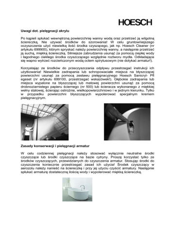 Uwagi dot. pielęgnacji akrylu Po kąpieli spłukać wewnętrzną powierzchnię wanny wodą oraz przetrzeć ją wilgotną ściereczką. Nie używać środków do szorowania! W celu gruntowniejszego oczyszczenia użyć niewielką ilość środka czyszącego, jak np. Hoesch Cleaner (nr artykułu 699900), którym spryskać należy powierzchnię wanny, a następnie przetrzeć ją suchą, miękką ściereczką. Silniejsze zabrudzenia usunąć za pomocą ciepłej wody i łagodnego ciekłego środka czyszczącego względnie roztworu mydła. Odkładające się wapno wytrzeć rozcieńczonym wodą octem spirytusowym (nie dotykać armatur!). Korzystając ze środków do przeczyszczania odpływu przestrzegać instrukcji ich użytkowania! Niewielkie zadrapania lub schropowaciałe miejsca na błyszczącej powierzchni usunąć za pomocą zestawu pielęgnacyjnego Hoesch Sanicryl- Pfl egeset (nr artykułu 699100, przestrzegać wskazówek!). Głębokie zadrapania lub miejsca wypalone na błyszczącej lub matowej powierzchni usunąć za pomocą drobnoziarnistego papieru ściernego (nr 500) lub ścieracza wykonanego z miękkiej wełny stalowej, ścierając ostrożnie, wielkopowierzchniowo i w jednym kierunku. Tylko w przypadku powierzchni błyszczących wypolerować specjalnym kremem pielęgnacyjnym. Zasady konserwacji i pielęgnacji armatur W celu codziennej pielęgnacji należy stosować wyłącznie neutralne środki czyszczące lub środki czyszczące na bazie cytryny. Proszę korzystać tylko ze środków czyszczących, przewidzianych do czyszczenia armatur. Stosując środki do czyszczenia koniecznie przestrzegać zasad ich użycia! Środek czyszczący w aerozolu należy nanieść na ściereczkę i przy jej użyciu czyścić armatury. Następnie spłukać armaturę dostateczną ilością wody i wypolerować miękką ściereczką.