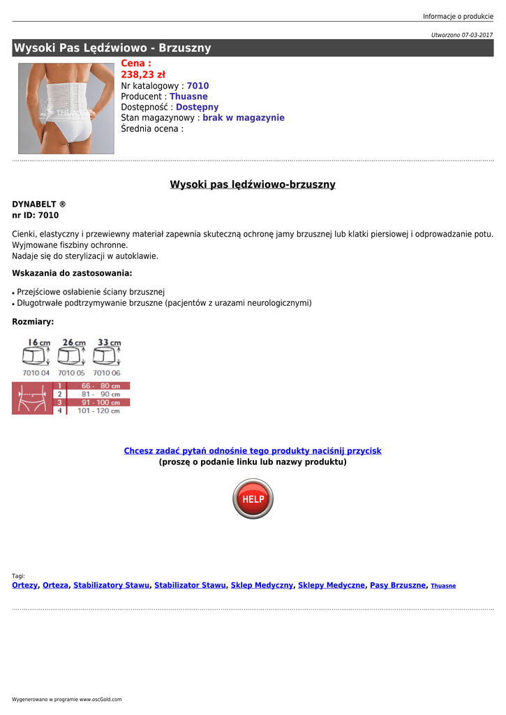 Informacje o produkcie Utworzono 07-03-2017 Wysoki Pas Lędźwiowo - Brzuszny Cena : 238,23 zł Nr katalogowy : 7010 Producent : Thuasne Dostępność : Dostępny Stan magazynowy : brak w magazynie Średnia ocena : Wysoki pas lędźwiowo-brzuszny DYNABELT ® nr ID: 7010 Cienki, elastyczny i przewiewny materiał zapewnia skuteczną ochronę jamy brzusznej lub klatki piersiowej i odprowadzanie potu. Wyjmowane fiszbiny ochronne. Nadaje się do sterylizacji w autoklawie. Wskazania do zastosowania: ● ● Przejściowe osłabienie ściany brzusznej Długotrwałe podtrzymywanie brzuszne (pacjentów z urazami neurologicznymi) Rozmiary: Chcesz zadać pytań odnośnie tego produkty naciśnij przycisk (proszę o podanie linku lub nazwy produktu) Tagi: Ortezy, Orteza, Stabilizatory Stawu, Stabilizator Stawu, Sklep Medyczny, Sklepy Medyczne, Pasy Brzuszne, Wygenerowano w programie www.oscGold.com Thuasne