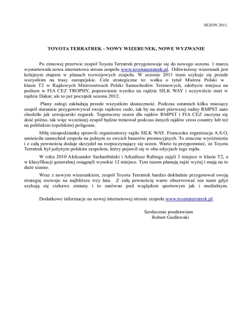 SEZON 2011. TOYOTA TERRATREK - NOWY WIZERUNEK, NOWE WYZWANIE Po zimowej przerwie zespół Toyota Terratrek przygotowuje się do nowego sezonu. 1 marca wystartowała nowa internetowa strona zespołu www.toyotaterratrek.pl. Odświeżony wizerunek jest kolejnym etapem w planach rozwojowych zespołu. W sezonie 2011 team szykuje się przede wszystkim na trasy europejskie. Cele strategiczne to: walka o tytuł Mistrza Polski w klasie T2 w Rajdowych Mistrzostwach Polski Samochodów Terenowych, zdobycie miejsca na podium w FIA CEZ TROPHY, poprawienie wyniku na rajdzie SILK WAY i oczywiście start w rajdzie Dakar, ale to już początek sezonu 2012. Plany załogi zakładają przede wszystkim skuteczność. Podczas ostatnich kilku miesięcy zespół starannie przygotowywał swoje rajdowe cudo, tak by na start pierwszej rudny RMPST auto chodziło jak szwajcarski zegarek. Tegoroczny sezon dla rajdów RMPST i FIA CEZ zaczyna się dość późno, tak więc wcześniej zespół będzie trenował podczas innych rajdów cross country lub też na pobliskim (opolskim) poligonie. Miłą niespodziankę sprawili organizatorzy rajdu SILK WAY. Francuska organizacja A.S.O, umieściła samochód zespołu na jednym ze swoich banerów promocyjnych. To znaczne wyróżnienie i z całą pewnością dodaje skrzydeł na rozpoczynający się sezon. Warto tu przypomnieć, że Toyota Terratrek był jedynym polskim zespołem, który pojawił się w obu edycjach tego rajdu. W roku 2010 Aleksander Sachanbiński i Arkadiusz Rabiega zajęli 3 miejsce w klasie T2, a w klasyfikacji generalnej osiągnęli wysokie 12 miejsce. Tym razem planują zajść wyżej i mają na to duże szanse. Wraz z nowym wizerunkiem, zespół Toyota Terratrek bardzo dokładnie przygotował swoją strategię rozwoju na najbliższe trzy lata. Z całą pewnością warto obserwować ten team gdyż szykują się ciekawe zmiany i to zarówno pod względem sportowym jak i medialnym. Dodatkowe informacje na nowej internetowej stronie zespołu www.toyotaterratrek.pl. Serdecznie pozdrawiam Robert Godlewski