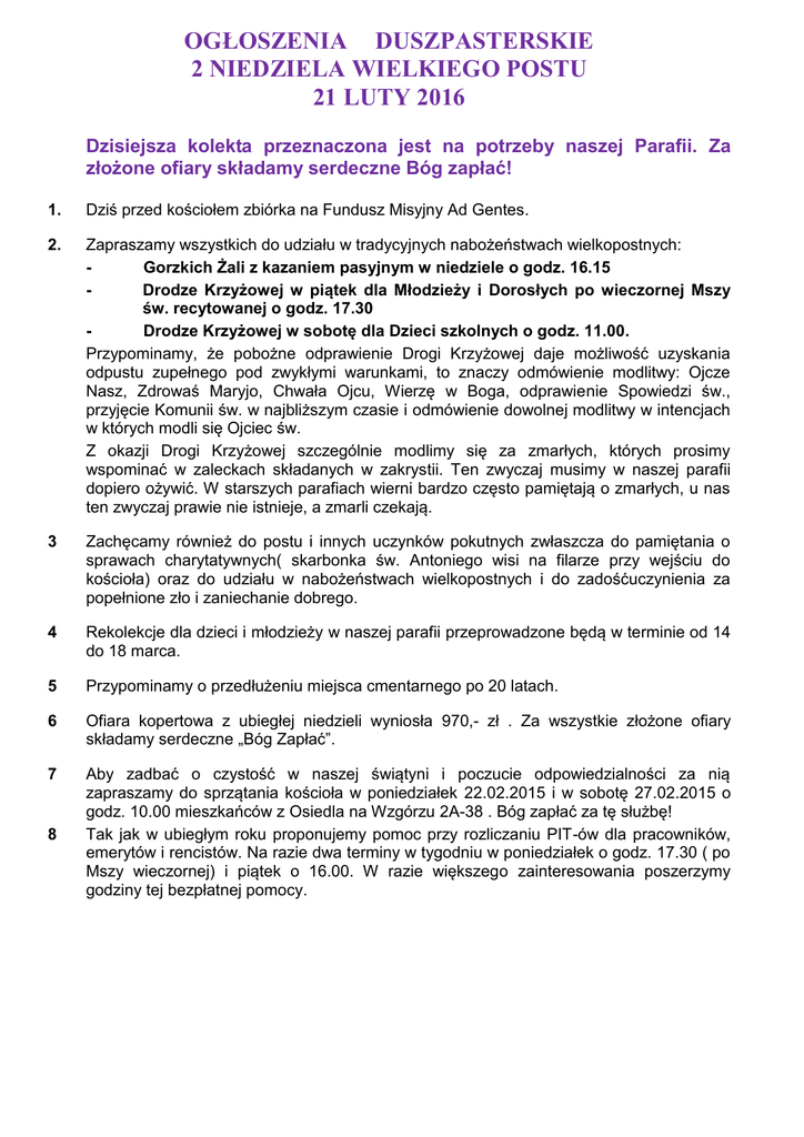 OGŁOSZENIA DUSZPASTERSKIE 2 NIEDZIELA WIELKIEGO POSTU 21 LUTY 2016 Dzisiejsza kolekta przeznaczona jest na potrzeby naszej Parafii. Za złożone ofiary składamy serdeczne Bóg zapłać! 1. Dziś przed kościołem zbiórka na Fundusz Misyjny Ad Gentes. 2. Zapraszamy wszystkich do udziału w tradycyjnych nabożeństwach wielkopostnych: Gorzkich Żali z kazaniem pasyjnym w niedziele o godz. 16.15 Drodze Krzyżowej w piątek dla Młodzieży i Dorosłych po wieczornej Mszy św. recytowanej o godz. 17.30 Drodze Krzyżowej w sobotę dla Dzieci szkolnych o godz. 11.00. Przypominamy, że pobożne odprawienie Drogi Krzyżowej daje możliwość uzyskania odpustu zupełnego pod zwykłymi warunkami, to znaczy odmówienie modlitwy: Ojcze Nasz, Zdrowaś Maryjo, Chwała Ojcu, Wierzę w Boga, odprawienie Spowiedzi św., przyjęcie Komunii św. w najbliższym czasie i odmówienie dowolnej modlitwy w intencjach w których modli się Ojciec św. Z okazji Drogi Krzyżowej szczególnie modlimy się za zmarłych, których prosimy wspominać w zaleckach składanych w zakrystii. Ten zwyczaj musimy w naszej parafii dopiero ożywić. W starszych parafiach wierni bardzo często pamiętają o zmarłych, u nas ten zwyczaj prawie nie istnieje, a zmarli czekają. 3 Zachęcamy również do postu i innych uczynków pokutnych zwłaszcza do pamiętania o sprawach charytatywnych( skarbonka św. Antoniego wisi na filarze przy wejściu do kościoła) oraz do udziału w nabożeństwach wielkopostnych i do zadośćuczynienia za popełnione zło i zaniechanie dobrego. 4 Rekolekcje dla dzieci i młodzieży w naszej parafii przeprowadzone będą w terminie od 14 do 18 marca. 5 Przypominamy o przedłużeniu miejsca cmentarnego po 20 latach. 6 Ofiara kopertowa z ubiegłej niedzieli wyniosła 970,- zł . Za wszystkie złożone ofiary składamy serdeczne „Bóg Zapłać”. 7 Aby zadbać o czystość w naszej świątyni i poczucie odpowiedzialności za nią zapraszamy do sprzątania kościoła w poniedziałek 22.02.2015 i w sobotę 27.02.2015 o godz. 10.00 mieszkańców z Osiedla na Wzgórzu 2A-38 . Bóg zapłać za tę służbę! Tak jak w ubiegłym roku proponujemy pomoc przy rozliczaniu PIT-ów dla pracowników, emerytów i rencistów. Na razie dwa terminy w tygodniu w poniedziałek o godz. 17.30 ( po Mszy wieczornej) i piątek o 16.00. W razie większego zainteresowania poszerzymy godziny tej bezpłatnej pomocy. 8