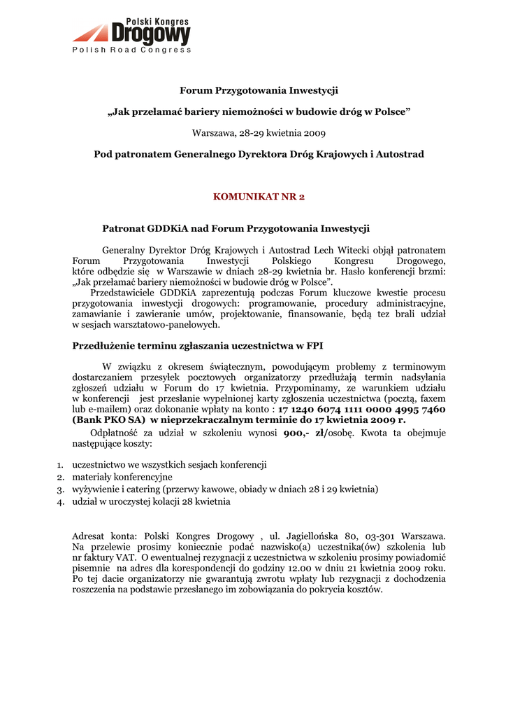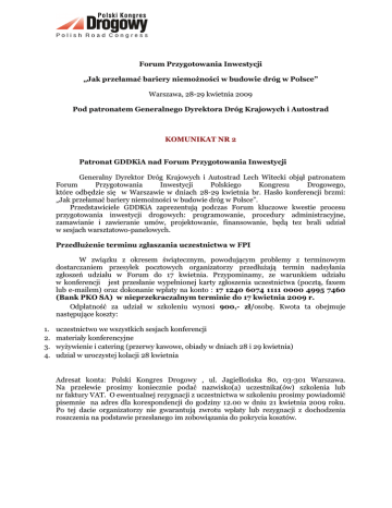 Forum Przygotowania Inwestycji „Jak przełamać bariery niemożności w budowie dróg w Polsce” Warszawa, 28-29 kwietnia 2009 Pod patronatem Generalnego Dyrektora Dróg Krajowych i Autostrad KOMUNIKAT NR 2 Patronat GDDKiA nad Forum Przygotowania Inwestycji Generalny Dyrektor Dróg Krajowych i Autostrad Lech Witecki objął patronatem Forum Przygotowania Inwestycji Polskiego Kongresu Drogowego, które odbędzie się w Warszawie w dniach 28-29 kwietnia br. Hasło konferencji brzmi: „Jak przełamać bariery niemożności w budowie dróg w Polsce”. Przedstawiciele GDDKiA zaprezentują podczas Forum kluczowe kwestie procesu przygotowania inwestycji drogowych: programowanie, procedury administracyjne, zamawianie i zawieranie umów, projektowanie, finansowanie, będą tez brali udział w sesjach warsztatowo-panelowych. Przedłużenie terminu zgłaszania uczestnictwa w FPI W związku z okresem świątecznym, powodującym problemy z terminowym dostarczaniem przesyłek pocztowych organizatorzy przedłużają termin nadsyłania zgłoszeń udziału w Forum do 17 kwietnia. Przypominamy, ze warunkiem udziału w konferencji jest przesłanie wypełnionej karty zgłoszenia uczestnictwa (pocztą, faxem lub e-mailem) oraz dokonanie wpłaty na konto : 17 1240 6074 1111 0000 4995 7460 (Bank PKO SA) w nieprzekraczalnym terminie do 17 kwietnia 2009 r. Odpłatność za udział w szkoleniu wynosi 900,- zł/osobę. Kwota ta obejmuje następujące koszty: 1. 2. 3. 4. uczestnictwo we wszystkich sesjach konferencji materiały konferencyjne wyżywienie i catering (przerwy kawowe, obiady w dniach 28 i 29 kwietnia) udział w uroczystej kolacji 28 kwietnia Adresat konta: Polski Kongres Drogowy , ul. Jagiellońska 80, 03-301 Warszawa. Na przelewie prosimy koniecznie podać nazwisko(a) uczestnika(ów) szkolenia lub nr faktury VAT. O ewentualnej rezygnacji z uczestnictwa w szkoleniu prosimy powiadomić pisemnie na adres dla korespondencji do godziny 12.00 w dniu 21 kwietnia 2009 roku. Po tej dacie organizatorzy nie gwarantują zwrotu wpłaty lub rezygnacji z dochodzenia roszczenia na podstawie przesłanego im zobowiązania do pokrycia kosztów. Program Forum: 28 kwietnia Godz. 11.00 - Sesja otwarcia: 1. Otwarcie Forum – prezes Polskiego Kongresu Drogowego Zbigniew Kotlarek 2. Wpływ infrastruktury drogowej na wzrost gospodarki, podstawowe bariery rozwoju, niezbędne zmiany – prezentacja wniosków z raportu „Którędy droga” – Marcin Radwan (Wardyński i wspólnicy), Maja Koźmińska (PricewaterhouseCoopers), Piotr Jutkiewicz (4C Future Computing), Jarosław Kantorowicz (Forum Obywatelskiego Rozwoju) 3. Kluczowe kwestie procesu przygotowania inwestycji drogowych: programowanie, procedury administracyjne, zamawianie i zawieranie umów, projektowanie, finansowanie – prezentacja GDDKiA 4. Wystąpienia gości honorowych Godz. 12.00 - Sesja robocza: 1. Ocena procedur zamawiania projektów i zawierania umów z projektantami wraz z propozycjami zmian w prawie zamówień publicznych i praktyce zamawiających – Grzegorz Ratajczak, dyrektor w firmie Scott Wilson 2. Problemy geodezji, szacowania wartości i nabywania nieruchomości pod budowę dróg w świetle stosowania „specustawy” – Bogdan Grzechnik, prezes firmy Grunt 3. Przepisy ochrony środowiska, wydawania ocen oddziaływania na środowisko i udziału społeczeństwa w ochronie środowiska a możliwości skracania czasu przygotowania inwestycji – Tomasz Podgajniak, wiceprezes ProEko 4. Normy, wymagania techniczne, specyfikacje w projektowaniu dróg - potrzeba systemowych rozwiązań – inż. Konrad Jabłoński 5. Nowe rozwiązania technologiczne do wykorzystania w projektowaniu i realizacji inwestycji drogowych – prezentacje produktowe Godz. 14.30 - przerwa na lunch Godz. 15.30 - Sesje warsztatowo-panelowe (równoległe): A. Pola konfliktów podczas przygotowania inwestycji z wymogami i przepisami ochrony środowiska, na przykładzie budowy odcinka autostrady A-1 od granicy woj. kujawsko-pomorskiego do Strykowa. Prowadzenie: Tomasz Podgajniak, prezentacja główna: Andrzej Wiszowaty (Arcadis Polska). Paneliści: Marek Brodowski, naczelnik Wydziału Dokumentacji GDDKiA Oddział Łódź, Ewa Makos (Arcadis Polska) B. Pozyskiwanie gruntów pod inwestycje jako istotna przyczyna wydłużania procesu przygotowania inwestycji, niewydolność administracji, ryzyko odszkodowań, współpraca z archeologami, na przykładzie budowy obwodnicy Mińska Mazowieckiego. Prowadzenie: Bogdan Grzechnik, prezentacja główna: Arkadiusz Siergiej (Level).Paneliści: Wojciech Dąbrowski, dyrektor GDDKiA Oddział Warszawa, przedstawiciel Mazowieckiego Urzędu Wojewódzkiego C. Porównanie metod realizacji inwestycji drogowych, z próbą oceny ich efektywności pod względem czasu i wydatkowania środków publicznych (Partnerstwo Publiczno-Prywatne, Design&Build, metoda tradycyjna z uwzględnieniem FIDIC-a). Paneliści: Daan Boddeke, Arcadis Nederland BV „Przykłady realizacji projektów PPP, D&B oraz Design, Bid & Build w Holandii”, Rajmund Ryś (DHV) „Przygotowanie projektów drogowych w systemie Zaprojektuj i Buduj”, Paweł Szaciłło (PricewaterhouseCoopers) D. Jakość dokumentacji projektowej a problemy z realizacją inwestycji drogowych dla Zamawiającego i wykonawcy. Prowadzenie: Stefan Assanowicz, prezes ZBM Inwestor Zastępczy. Paneliści: Grzegorz Nowaczyk (Trakt), Tadeusz Suwara (Transprojekt Warszawa), Stanisław Glegoła (Bilfinger Berger) Godz. 17.30 - zakończenie obrad Godz. 19.00 - uroczysta kolacja 29 kwietnia Godz. 10.00 - Sesja robocza 1. Problematyka specyfikacji technicznych i przygotowania inwestycji drogowych: analiza stanu i propozycje rozwiązań – Wacław Michalski, dyrektor Departamentu Technologii GDDKiA 2. prezentacja wyników/wniosków prac w grupach warsztatowo-panelowych Godz. 11.45 - przerwa kawowa Godz. 12.15 - sesja końcowa 1. dyskusja 2. przedstawienie projektu dokumentu końcowego Forum, 3. podsumowanie obrad Godz. 14.00