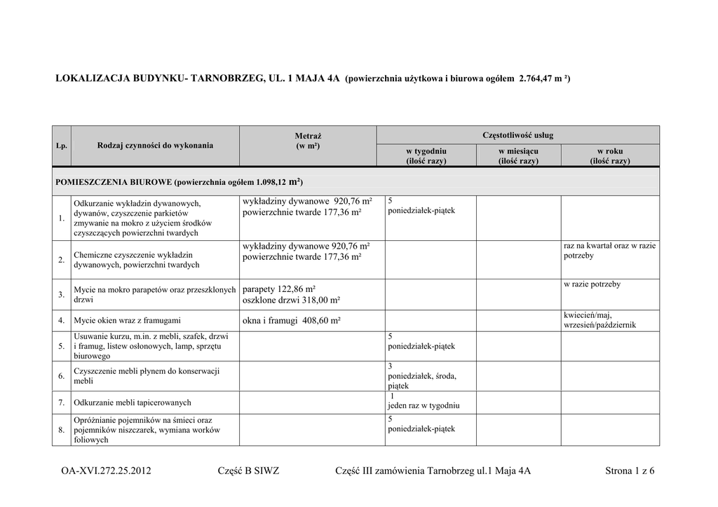 LOKALIZACJA BUDYNKU- TARNOBRZEG, UL. 1 MAJA 4A (powierzchnia uŜytkowa i biurowa ogółem 2.764,47 m ²) Lp. Częstotliwość usług MetraŜ (w m²) Rodzaj czynności do wykonania POMIESZCZENIA BIUROWE (powierzchnia ogółem 1.098,12 w tygodniu (ilość razy) wykładziny dywanowe 920,76 m² powierzchnie twarde 177,36 m² 1. 2. Chemiczne czyszczenie wykładzin dywanowych, powierzchni twardych 3. Mycie na mokro parapetów oraz przeszklonych parapety 122,86 m² drzwi oszklone drzwi 318,00 m² 4. Mycie okien wraz z framugami 5. Usuwanie kurzu, m.in. z mebli, szafek, drzwi i framug, listew osłonowych, lamp, sprzętu biurowego 6. Czyszczenie mebli płynem do konserwacji mebli 7. Odkurzanie mebli tapicerowanych 8. OpróŜnianie pojemników na śmieci oraz pojemników niszczarek, wymiana worków foliowych 5 poniedziałek-piątek raz na kwartał oraz w razie potrzeby wykładziny dywanowe 920,76 m² powierzchnie twarde 177,36 m² w razie potrzeby kwiecień/maj, wrzesień/październik okna i framugi 408,60 m² Część B SIWZ w roku (ilość razy) m²) Odkurzanie wykładzin dywanowych, dywanów, czyszczenie parkietów zmywanie na mokro z uŜyciem środków czyszczących powierzchni twardych OA-XVI.272.25.2012 w miesiącu (ilość razy) 5 poniedziałek-piątek 3 poniedziałek, środa, piątek 1 jeden raz w tygodniu 5 poniedziałek-piątek Część III zamówienia Tarnobrzeg ul.1 Maja 4A Strona 1 z 6 9. Mycie sprzętu oświetleniowego raz na kwartał w razie potrzeby 10. Usuwanie pajęczyn 5 poniedziałek-piątek 11. Kontrolowanie zamknięć okien i drzwi w pomieszczeniach 12. Zdejmowanie, pranie i wieszanie firanek oraz zasłon kwiecień/maj, wrzesień/październik pierwszy tydzień kaŜdego miesiąca 13. Usuwanie kurzu z kratek wentylacyjnych 14. Zgłaszanie wszelkich pojawiających się usterek technicznych – niezwłocznie po wystąpieniu 15. W pomieszczeniach plombowanych wykonywanie powyŜszych czynności w godzinach od 13 do 15 od poniedziałku do piątku KORYTARZE, HOLE (powierzchnia ogółem 995,57 m²) Odkurzanie wykładzin dywanowych, dywanów, czyszczenie i zmywanie na mokro 16. z uŜyciem środków czyszczących wykładziny dywanowe 111,18 m² powierzchnie twarde 681,00 m² Chemiczne czyszczenie wykładzin 17. dywanowych, powierzchni twardych wykładziny dywanowe 111,18 m² powierzchnie twarde 681,00 m² Zamiatanie, wycieranie na mokro powierzchni podłogowych oraz konserwacja posadzek 18. środkami przeciwpoślizgowymi Ogółem 681,00 m² 19. okna i framugi 81,08 m² Mycie okien wraz z framugami na holu OA-XVI.272.25.2012 RODZAJE POWIERZCHNI: lastryko 681,00 m² Część B SIWZ 5 poniedziałek-piątek raz na kwartał oraz w razie potrzeby 5 poniedziałek-piątek oraz w kaŜdym przypadku, związanym z zabrudzeniem powierzchni podłogowych (m.in. zaleŜnym od warunków atmosferycznych) Część III zamówienia Tarnobrzeg ul.1 Maja 4A kwiecień/maj, wrzesień/październik Strona 2 z 6 20. Mycie przeszklonych drzwi Mycie, froterowanie i polerowanie holu za 21. pomocą środków konserwujących i nabłyszczających Usuwanie kurzu i mycie listew osłonowych, 22. gablot oszklone drzwi 116,91 m² w razie potrzeby powierzchnie twarde (lastryko) 203,39 m² raz na kwartał 5 poniedziałek-piątek raz na kwartał 23. Mycie sprzętu oświetleniowego 24. 5 poniedziałek-piątek OpróŜnianie pojemników na śmieci i wymiana foliowych worków pierwszy tydzień kaŜdego miesiąca 25. Usuwanie kurzu z kratek wentylacyjnych w razie potrzeby 26. Usuwanie pajęczyn 27. Zgłaszanie wszelkich pojawiających się usterek technicznych – niezwłocznie po wystąpieniu KLATKI SCHODOWE- wewnętrzne (1) i zewnętrzne () 28. 29. Zamiatanie, wycieranie na mokro powierzchni podłogowych oraz konserwacja posadzek środkami przeciwpoślizgowymi Sprzątanie wejść i przejść komunikacyjnych (wewnętrznych i zewnętrznych) (powierzchnia ogółem 139,20 Ogółem 127,50 m² RODZAJE POWIERZCHNI: lastryko 127,50 m² Zewnętrzne 11,70 m2 Zamiatanie zewnętrznych klatek schodowych 30. OA-XVI.272.25.2012 2 Ogółem 11,70 m Część B SIWZ m²) 5 poniedziałek-piątek oraz w kaŜdym przypadku, związanym z zabrudzeniem powierzchni podłogowych (m.in. zaleŜnym od warunków atmosferycznych) 5 poniedziałek-piątek W kaŜdym przypadku związanym z zabrudzeniem (m.in. zaleŜnym od warunków atmosf.) Część III zamówienia Tarnobrzeg ul.1 Maja 4A Strona 3 z 6 31. 32. Wycieranie balustrad i poręczy 5 poniedziałek-piątek Zgłaszanie wszelkich pojawiających się usterek technicznych – w razie wystąpienia TOALETY (17) - w tym toalety ogólnodostępne 16 i toalety dla osób niepełnosprawnych 1 Mycie i usuwanie zabrudzeń glazury 33 z uŜyciem środków myjąco-pielęgnacyjnych 34. 35. Mycie i usuwanie zabrudzeń terakoty z uŜyciem środków myjąco-pielęgnacyjnych Mycie okien wraz z framugami glazura 613,13 m² terakota 218,10 m² (powierzchnia ogółem 218,10 5 poniedziałek-piątek 5 poniedziałek-piątek oraz kaŜdorazowo jeśli zajdzie taka potrzeba kwiecień/maj, wrzesień/październik okna i framugi 30,00 m² Mycie armatury, baterii umywalkowych 36. i umywalek, luster z uŜyciem środków myjącopielęgnacyjnych 5 poniedziałek-piątek Mycie i dezynfekcja wszystkich sanitariatówmuszli i deski klozetowej, usuwanie nalotów 37. i wszelkich zabrudzeń 5 poniedziałek-piątek oraz kaŜdorazowo jeśli zajdzie taka potrzeba 5 poniedziałek-piątek 5 poniedziałek-piątek OpróŜnianie pojemników na śmieci, wymiana 38. foliowych worków Mycie drzwi, framug i listew osłonowych 39. 40. 41. m²) Mycie sprzętu oświetleniowego raz na kwartał Usuwanie kurzu z kratek wentylacyjnych pierwszy tydzień kaŜdego miesiąca 5 poniedziałek-piątek 42. Kontrolowanie zamknięć okien i drzwi w pomieszczeniach OA-XVI.272.25.2012 Część B SIWZ Część III zamówienia Tarnobrzeg ul.1 Maja 4A Strona 4 z 6 43. Zgłaszanie wszelkich pojawiających się usterek technicznych – niezwłocznie po wystąpieniu SALE KONFERENCYJNE (powier