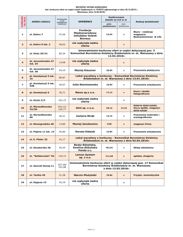 KONKURS 10/2015 WSTĘPNY WYNIK KONKURSU dot. konkursu ofert na najem lokali użytkowych nr 10/2015 ogłoszonego w dniu 30.12.2015 r. Warszawa, dnia 12.02.2016r. ADRES LOKALU Powierzchnia w m2 podstawowa/ dodatkowa OFERENCI Zaoferowane stawki za m2 w zł pow. podstawowa pow. dodatkowa 24,59 x Rodzaj działalności 1 ul. Dobra 7 27,46 Fundacja Międzynarodowy Inkubator Kobiet Biznesu 2 ul. Dobra 9 lok. 2 28,02 nie wpłynęła żadna oferta 3 ul. Hoża 29/31 85,34 4 Al. Jerozolimskie 47 lok. 34 14,58 nie wpłynęła żadna oferta 5 Al. Jerozolimskie 47 lok. 38 24,10 Maciej Klauzner 6 pl. Konstytucji 5 lok. 15 86,87 7 pl. Konstytucji 5 lok. 54B 20,57 Julia Staniszewska 18,00 x Pracownia artystyczna 8 pl. Konstytucji 6 30,71 Newu sp.z o.o. 17,13 x biuro i studio fotograficzne 9 ul. Kozia 3/5 191,73 nie wpłynęła żadna oferta 10 ul. Marszałkowska 34/50 444,13/ 220,77 DU2 sp. z o.o. 50,15 14,10 Galeria dzieł sztuki, biuro spółki, magazyn dzieł sztuki 11 ul. Marszałkowska 60 36,21 Justyna Strąk 15,19 x Pracownia malarska i scenograficzna 12 ul. Nowogrodzka 48 13,80 Maciej Janukowicz 9,00 x magazyn firmy 13 ul. Piękna 11 lok. 13 45,84 Dorota Kidziak 16,86 x Pracownia artystyczna 14 ul. E. Plater 25 42,17 Lokal wycofany z konkursu - Komunikat Burmistrza Dzielnicy Śródmieście m. st. Warszawy z dnia 02.02.2016r. 15 ul. Senatorska 26 45,44 Beata Różańska, Ewelina Różańska Panda s.c. 181,81 x Sklep odzieżowy 16 al. "Solidarności" 82 120,14 Leman System sp. z o.o. 211,00 x apteka, drogeria 17 ul. Szeroki Dunaj 11 327,39/ 151,08 18 ul. Tamka 45 31,38 Marcin Płużyński 19 ul. Zajęcza 13 45,19 nie wpłynęła żadna oferta Biuro - redakcja magazynu Businesswoman & Life x Unieważnienie konkursu ofert w części dotyczącej poz. 3 Komunikat Burmistrza Dzielnicy Śródmieście m. st. Warszawy z dnia 12.02.2016r. x 20,00 x Pracownia plastyczna Lokal wycofany z konkursu - Komunikat Burmistrza Dzielnicy Śródmieście m. st. Warszawy z dnia 13.01.2016r. x Unieważnienie konkursu ofert w części dotyczącej poz. 17 Komunikat Burmistrza Dzielnicy Śródmieście m. st. Warszawy z dnia 12.02.2016r. Strona 1 z 1 70,00 x x Fryzjer, kosmetyczka