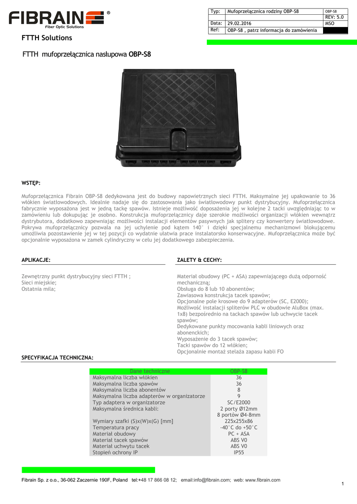 Typ: Mufoprzełącznica rodziny OBP-S8 Data: Ref: 29.02.2016 OBP-S8 , patrz informacja do zamówienia OBP-S8 REV: 5.0 MSO FTTH Solutions FTTH mufoprzełącznica nasłupowa OBP-S8 WSTĘP: Mufoprzełącznica Fibrain OBP-S8 dedykowana jest do budowy napowietrznych sieci FTTH. Maksymalne jej upakowanie to 36 włókien światłowodowych. Idealnie nadaje się do zastosowania jako światłowodowy punkt dystrybucyjny. Mufoprzełącznica fabrycznie wyposażona jest w jedną tackę spawów. Istnieje możliwość doposażenia jej w kolejne 2 tacki uwzględniając to w zamówieniu lub dokupując je osobno. Konstrukcja mufoprzełącznicy daje szerokie możliwości organizacji włókien wewnątrz dystrybutora, dodatkowo zapewniając możliwości instalacji elementów pasywnych jak splitery czy konwertery światłowodowe. Pokrywa mufoprzełącznicy pozwala na jej uchylenie pod kątem 140° i dzięki specjalnemu mechanizmowi blokującemu umożliwia pozostawienie jej w tej pozycji co wydatnie ułatwia prace instalatorsko konserwacyjne. Mufoprzełącznica może być opcjonalnie wyposażona w zamek cylindryczny w celu jej dodatkowego zabezpieczenia. APLIKACJE: ZALETY & CECHY: Zewnętrzny punkt dystrybucyjny sieci FTTH ; Sieci miejskie; Ostatnia mila; Materiał obudowy (PC + ASA) zapewniającego dużą odporność mechaniczną; Obsługa do 8 lub 10 abonentów; Zawiasowa konstrukcja tacek spawów; Opcjonalne pole krosowe do 9 adapterów (SC, E2000); Możliwość instalacji spliterów PLC w obudowie AluBox (max. 1x8) bezpośrednio na tackach spawów lub uchwycie tacek spawów; Dedykowane punkty mocowania kabli liniowych oraz abonenckich; Wyposażenie do 3 tacek spawów; Tacki spawów do 12 włókien; Opcjonalnie montaż stelaża zapasu kabli FO SPECYFIKACJA TECHNICZNA: Dane techniczne Maksymalna liczba włókien Maksymalna liczba spawów Maksymalna liczba abonentów Maksymalna liczba adapterów w organizatorze Typ adaptera w organizatorze Maksymalna średnica kabli: Wymiary szafki (S)x(W)x(G) [mm] Temperatura pracy Materiał obudowy Materiał tacek spawów Materiał uchwytu tacek Stopień ochrony IP OBP-S8 36 36 8 9 SC/E2000 2 porty Ø12mm 8 portów Ø4-8mm 225x255x86 -40°C do +50°C PC + ASA ABS V0 ABS V0 IP55 Fibrain Sp. z o.o., 36-062 Zaczernie 190F, Poland tel:+48 17 866 08 12; email:[email protected]; web: www.fibrain.com 1 Typ: Mufoprzełącznica rodziny OBP-S8 Data: Ref: 29.02.2016 OBP-S8 , patrz informacja do zamówienia OBP-S8 REV: 5.0 MSO FTTH Solutions WYPOSAŻENIE DODATKOWE: Adaptery: Splitery: Pigtaile: Stelaż zapasu z uchwytem nasłupowym Płyta adaptacyjna do poprzednich wersji stelaży zapasu Tacka spawów Pole krosowe pod adaptery FO Dodatkowe uszczelki pod otworowanie w obudowie Zamek cylindryczny AD-xxx, Axxx-xx FPLC-xx w obudowie AluBox S-xx, G-xx, T-xx SZ-D-S8 SZ-D-S8-PAD SCM-B-12H.xx Widok mufoprzełącznicy w wersji OBP-S8 Widok mufoprzełącznicy w wersji OBP-S8 z zamocowanym uchwytem kabla wewnątrzbudynkowego Fibrain Sp. z o.o., 36-062 Zaczernie 190F, Poland tel:+48 17 866 08 12; email:[email protected]; web: www.fibrain.com 2 Typ: Mufoprzełącznica rodziny OBP-S8 Data: Ref: 29.02.2016 OBP-S8 , patrz informacja do zamówienia OBP-S8 REV: 5.0 MSO FTTH Solutions Widok mufoprzełacznicy w wersji OBP-S8 z płytą separacyjną i panelem na 12 adapterów typu SC SX INFORMACJE DO ZAMÓWIENIA: OBP-S8-ABC-DDEFG-HIJKL-M-N-O-PR.SS Składnia zamówień; A – Kolor pierwszej tacki spawów B – występowanie i kolor drugiej tacki C - występowanie i kolor trzeciej tacki 1- biała; 2- niebieska 0– brak; 1- biała; 2- niebieska 0– brak; 1- biała; 2- niebieska DD - Ilość zainstalowanych adapterów: E – Płyta separująca* 0-9; 12 0-brak, 1 – w wyposażeniu F - Klasa adaptera: 1 – Standard One-Piece, 2 - Premium Super One-Piece 3 – Premium One-Piece z wewnętrzną przesłoną, 4 - Premium Super One-Piece z wewnętrzną przesłoną, G - Typ adaptera (tylko z flanszą): 0 - brak 1 – SC/PC, 2 – SCA/APC, 3 – E2000/PC (tylko wersja standard), 4 – E2000/APC (tylko wersja standard), H - Liczba spliterów: 0 – brak, 1 – jeden, 2 – dwa, 3 – trzy, 4 -cztery; I – Współczynnik podziału splitera #1: 0 – brak,1 – 1:2, 2 – 1:4, 3 – 1:8; J – Współczynnik podziału splitera #2: 0 – brak,1 – 1:2, 2 – 1:4, 3 – 1:8; K - Współczynnik podziału splitera #3: 0 – brak,1 – 1:2, 2 – 1:4, 3 – 1:8; L- Współczynnik podziału splitera #4: 0 – brak,1 – 1:2, 2 – 1:4, 3 – 1:8; M – Stelaż zapasu z uchwytem nasłupowym 0 – brak 1 – w wyposażeniu N - Pole krosowe pod adaptery FO 0 – brak 1 – w wyposażeniu O- Dodatkowe uchwyty do mocowania kabla 0 – brak wewnątrzbudynkowego (zas. wewnątrzbudynkowe) 1 – w wyposażeniu P - Zamek cylindryczny: 0 – brak 1 – w wyposażeniu R – Klin blokujący:** 0 – brak 1 – w wyposażeniu SS – Kolor obudowy BL - czarna * Tylko w wariancie 12 adapterów ** Montowany zawsze, jeżeli mufa nie ma montowanego zamka. W przypadku montażu zamka klin blokujący w standardzie nie jest montowany Fibrain Sp. z o.o., 36-062 Zaczernie 190F, Poland tel:+48 17 866 08 12; email:[email protected]; web: www.fibrain.com 3 Typ: Mufoprzełącznica rodziny OBP-S8 Data: Ref: 29.02.2016 OBP-S8 , patrz informacja do zamówienia OBP-S8 REV: 5.0 MSO FTTH Solutions Przykład: OBP-S8-211-09012-22200-1-1-0-01.BL Mufoprzełącznica OBP wersji S8 wyposażona w trzy kasety do 12 spawów (1x niebieska, 2x biała), 9 adapterów standard SCA, dwa splitery w obudowie Alubox o podziale 1:4, 1:4 , w komplecie z uchwytem nasłupowym; wyposażona w stelaż zapasu i pole krosowe pod 9 adapterów FO i klin blokujący. Uwaga Nabywca i / lub użytkownik tego produktu musi upewnić się przed użyciem tego produktu, że jest on odpowiedni do zamierzonego zastosowania. Wszystkie kwestie dotyczące odpowiedzialności odnoszące się do tego wyrobu podlegają Ogólnym Warunkom Sprzedaży przez FIBRAIN sp. z o.o.. Fibrain Sp. z o.o., 36-062 Zaczer