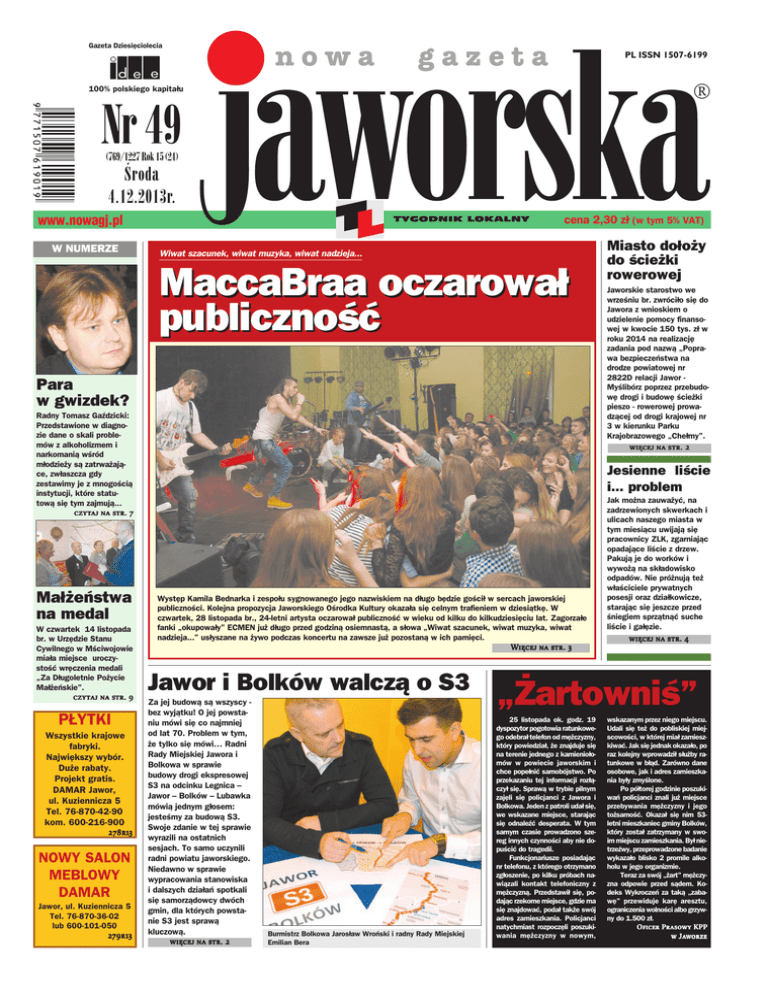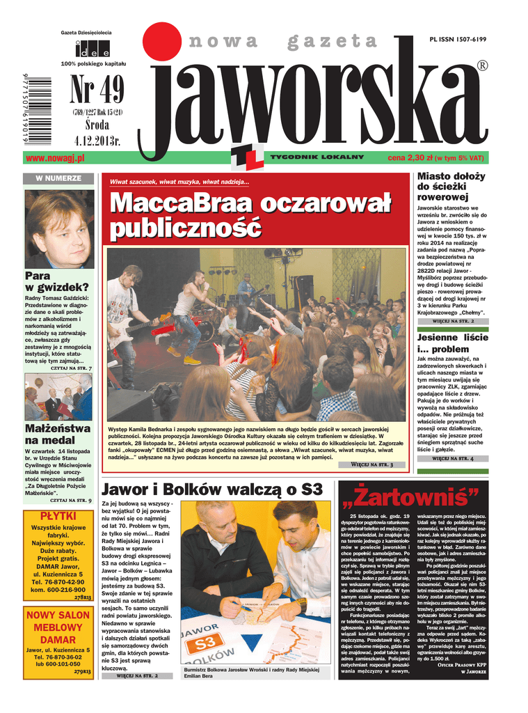 4Gazeta grudnia 2013r. Dziesięciolecia PL ISSN 1507-6199 ® 100% polskiego kapitału Nr 49 (769/1227 Rok 15 (24) Œroda 4.12.2013r. www.nowagj.pl W NUMERZE cena 2,30 zł (w tym 5% VAT) Wiwat szacunek, wiwat muzyka, wiwat nadzieja... MaccaBraa oczarował publiczność Para w gwizdek? Radny Tomasz Gaździcki: Przedstawione w diagno− zie dane o skali proble− mów z alkoholizmem i narkomanią wśród młodzieży są zatrważają− ce, zwłaszcza gdy zestawimy je z mnogością instytucji, które statu− tową się tym zajmują... czyt aj na sstr. tr. 7 czytaj Małżeństwa na medal W czwartek 14 listopada br. w Urzędzie Stanu Cywilnego w Mściwojowie miała miejsce uroczy− stość wręczenia medali „Za Długoletnie Pożycie Małżeńskie”. czyt aj na sstr. tr. 9 czytaj PŁYTKI Wszystkie krajowe fabryki. Największy wybór. Duże rabaty. Projekt gratis. DAMAR Jawor, ul. Kuziennicza 5 Tel. 76−870−42−90 kom. 600−216−900 278r1 78r133 NOWY SALON MEBLOWY DAMAR Jawor, ul. Kuziennicza 5 Tel. 76−870−36−02 lub 600−101−050 279r1 79r133 Miasto dołoży do ścieżki rowerowej Jaworskie starostwo we wrześniu br. zwróciło się do Jawora z wnioskiem o udzielenie pomocy finanso− wej w kwocie 150 tys. zł w roku 2014 na realizację zadania pod nazwą „Popra− wa bezpieczeństwa na drodze powiatowej nr 2822D relacji Jawor − Myślibórz poprzez przebudo− wę drogi i budowę ścieżki pieszo − rowerowej prowa− dzącej od drogi krajowej nr 3 w kierunku Parku Krajobrazowego „Chełmy”. więce tr. 2 więcejj na sstr. Jesienne liście i... problem Występ Kamila Bednarka i zespołu sygnowanego jego nazwiskiem na długo będzie gościł w sercach jaworskiej publiczności. Kolejna propozycja Jaworskiego Ośrodka Kultury okazała się celnym trafieniem w dziesiątkę. W czwartek, 28 listopada br., 24−letni artysta oczarował publiczność w wieku od kilku do kilkudziesięciu lat. Zagorzałe fanki „okupowały” ECMEN już długo przed godziną osiemnastą, a słowa „Wiwat szacunek, wiwat muzyka, wiwat nadzieja...” usłyszane na żywo podczas koncertu na zawsze już pozostaną w ich pamięci. Więce tr. 3 ięcejj na sstr. Jawor i Bolków walczą o S3 Za jej budową są wszyscy − bez wyjątku! O jej powsta− niu mówi się co najmniej od lat 70. Problem w tym, że tylko się mówi… Radni Rady Miejskiej Jawora i Bolkowa w sprawie budowy drogi ekspresowej S3 na odcinku Legnica – Jawor – Bolków – Lubawka mówią jednym głosem: jesteśmy za budową S3. Swoje zdanie w tej sprawie wyrazili na ostatnich sesjach. To samo uczynili radni powiatu jaworskiego. Niedawno w sprawie wypracowania stanowiska i dalszych działań spotkali się samorządowcy dwóch gmin, dla których powsta− nie S3 jest sprawą kluczową. więce tr. 2 więcejj na sstr. Burmistrz Bolkowa Jarosław Wroński i radny Rady Miejskiej Emilian Bera Jak można zauważyć, na zadrzewionych skwerkach i ulicach naszego miasta w tym miesiącu uwijają się pracownicy ZLK, zgarniając opadające liście z drzew. Pakują je do worków i wywożą na składowisko odpadów. Nie próżnują też właściciele prywatnych posesji oraz działkowicze, starając się jeszcze przed śniegiem sprzątnąć suche liście i gałęzie. więcejj na sstr. więce tr. 4 „Żartowniś” 25 listopada ok. godz. 19 dyspozytor pogotowia ratunkowe− go odebrał telefon od mężczyzny, który powiedział, że znajduje się na terenie jednego z kamienioło− mów w powiecie jaworskim i chce popełnić samobójstwo. Po przekazaniu tej informacji rozłą− czył się. Sprawą w trybie pilnym zajęli się policjanci z Jawora i Bolkowa. Jeden z patroli udał się, we wskazane miejsce, starając się odnaleźć desperata. W tym samym czasie prowadzono sze− reg innych czynności aby nie do− puścić do tragedii. Funkcjonariusze posiadając nr telefonu, z którego otrzymano zgłoszenie, po kilku próbach na− wiązali kontakt telefoniczny z mężczyzną. Przedstawił się, po− dając rzekome miejsce, gdzie ma się znajdować, podał także swój adres zamieszkania. Policjanci natychmiast rozpoczęli poszuki− wania mężczyzny w nowym, wskazanym przez niego miejscu. Udali się też do pobliskiej miej− scowości, w której miał zamiesz− kiwać. Jak się jednak okazało, po raz kolejny wprowadził służby ra− tunkowe w błąd. Zarówno dane osobowe, jak i adres zamieszka− nia były zmyślone. Po półtorej godzinie poszuki− wań policjanci znali już miejsce przebywania mężczyzny i jego tożsamość. Okazał się nim 53− letni mieszkaniec gminy Bolków, który został zatrzymany w swo− im miejscu zamieszkania. Był nie− trzeźwy, przeprowadzone badanie wykazało blisko 2 promile alko− holu w jego organizmie. Teraz za swój „żart” mężczy− zna odpowie przed sądem. Ko− deks Wykroczeń za taką „zaba− wę” przewiduje karę aresztu, ograniczenia wolności albo grzyw− ny do 1.500 zł. Of icer Pr aso wy KPP Oficer Praso asowy w Ja wor ze Jaw orz