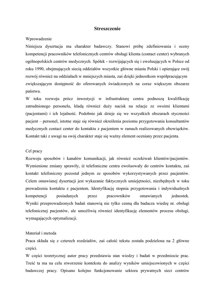 Streszczenie Wprowadzenie Niniejsza dysertacja ma charakter badawczy. Stanowi próbę zdefiniowania i oceny kompetencji pracowników telefonicznych centrów obsługi klienta (contact center) wybranych ogólnopolskich centrów medycznych. Spółek - rozwijających się i ewoluujących w Polsce od roku 1990, obejmujących siecią oddziałów wszystkie główne miasta Polski i opierające swój rozwój również na oddziałach w mniejszych miasta, zaś dzięki jednostkom współpracującym zwiększającym dostępność do oferowanych świadczonych na coraz większym obszarze państwa. W toku rozwoju prócz inwestycji w infrastrukturę centra podnoszą kwalifikację zatrudnionego personelu, kładą również duży nacisk na relacje ze swoimi klientami (pacjentami) i ich lojalność. Podobnie jak dzieje się we wszystkich obszarach styczności pacjent – personel, istotne staje się również określenia poziomu przygotowania konsultantów medycznych contact center do kontaktu z pacjentem w ramach realizowanych obowiązków. Kontakt taki z uwagi na swój charakter staje się ważny element oceniany przez pacjenta. Cel pracy Rozwoju sposobów i kanałów komunikacji, jak również oczekiwań klientów/pacjentów. Wymienione zmiany sprawiły, iż telefoniczne centra ewoluowały do centrów kontaktu, zaś kontakt telefoniczny pozostał jednym ze sposobów wykorzystywanych przez pacjentów. Celem omawianej dysertacji jest wykazanie faktycznych umiejętności, niezbędnych w toku prowadzenia kontaktu z pacjentem. Identyfikację stopnia przygotowania i indywidualnych kompetencji posiadanych przez pracowników omawianych jednostek. Wyniki przeprowadzonych badań stanowią nie tylko cenną dla badacza wiedzę nt. obsługi telefonicznej pacjentów, ale umożliwią również identyfikację elementów procesu obsługi, wymagających optymalizacji. Materiał i metoda Praca składa się z czterech rozdziałów, zaś całość tekstu została podzielona na 2 główne części. W części teoretycznej autor pracy przedstawia stan wiedzy i badań w przedmiocie prac. Treść ta ma na celu stworzenie kontekstu do analizy wyników umiejscowionych w części badawczej pracy. Opisano kolejno funkcjonowanie sektora prywatnych sieci centrów medycznych w Polsce, branżę call/contact center i swoistość jej działania. Ponadto opisano charakterystykę pracy w call/contact center, profil pracownika, nakreślono dalsze kierunki i prognozy dotyczące rozwoju prywatnych centrów medycznych w Polsce. W ramach części metodologiczno-badawczej autor opisał metodologię wykorzystaną w toku przeprowadzonych badań (autor zrealizował 2 rodzaje badań), zaprezentował ich wyniki i analizę. Pracę wieńczą: podsumowanie, wnioski wynikające z analizy uzyskanego materiału badawczego, jak również postulaty i obszary dalszych badań w opisywanej materii. Celem pierwszego badania było przedstawienia profilu pracownika call/contact center pracującego z pacjentami i pogłębienia wiedzy dotyczącej profilu konsultanta telefonicznego centrum kontaktu z pacjentem, autor zaprojektował pilotażowe badanie z wykorzystaniem autorskiej ankiety - składające się z 12 pytań badanie CAWI. W realizacji badania udział wzięło70 respondentów. Drugie badanie stanowiło ocenę kompetencji pracowników telefonicznych centrów obsługi pacjenta zrealizowana z wykorzystaniem kampanii głosowych połączeń telefonicznych w oparciu o wcześniej przygotowane scenariusze rozmów (w zamierzeniu: symulacja rozmowy pacjent-konsultant, badanie typu mystery call) – badanie CATI. Badanie zrealizowano poprzez wykonanie 500 głosowych połączeń telefonicznych przy użyciu ogólnopolskich numerów dostępowych dedykowanych kontaktowi pacjentów z centrami medycznymi (infolinie medyczne) - 400 kontaktów zostało przeprowadzonych w języku polskim, zaś 100 w języku angielskim. Do badania wytypowano 4 ogólnopolskie sieci centrów medycznych –największe w swojej branży: Grupę Medyczną LUX MED Sp. z o.o., Centrum Medyczne ENEL-MED S.A., POLMED S.A., Medicover Sp. z o.o. Dokonano analizy statystycznej zgromadzonych wyników badań. Wykonano histogramy przedstawiające rozkłady poszczególnych kompetencji. Wykorzystano test KołmogorowaSmirnowa do oceny zgodności poszczególnych kompetencji z rozkładem normalnym. Ponadto w różnych obszarach badań przeprowadzono test Kruskala Wallisa, wielokrotne porównania testem Manna-Whitneya, zastosowano poprawkę Hochberga. Wykonano także macierz korelacji Spearmana. Wyniki i wnioski W toku analizy zebranego materiału źródłowego i interpretacji wyników podjętych badań, autor stwierdza, iż telefoniczny kontakt pacjenta z centrum medycznym i kompetencje pracowników centrów obsługi pacjenta mają kluczowy wpływ na wybór przez pacjenta danego podmiotu/przedsiębiorstwa jako jednostki prowadzącej poradnictwo i leczenie. Rozwój pry watnych centrów medycznych stanowi istotny czynnik zmiany relacji pacjent – instytucja medyczna. Ponadto przeprowadzone badania pozwoliły na dokonanie analizy profilu zawodowego konsultanta centrów obsługi pacjenta (określenie dokładnych kompetencji, umiejętności, zestawu cech, doświadczenia, innych czynników powodujących świadczenie usługi w sposób bardziej efektywny od innych pracowników). Wykazano szereg czynników charakteryzujących konsultanta telefonicznego centrum obsługi pacjenta: określono kryteria pracy, wykształcenie, motywatory, związki pomiędzy kompetencją zawodową, a znajomością języków obcych (również korelacje między poszczególnymi kompetencjami). Ponadto wykazano różnice w ocenie kompetencji konsultantów poszczególnych centrów medycznych jak również wskazano, w których centrach kompetencje konsultantów oceniono najwyżej, a w których najniżej. Niezwykle ciekawym obszarem badań okazała się możliwość zbudowania profilu pracownika medycznego call/contact center. Na podstawie przeprowadzonych