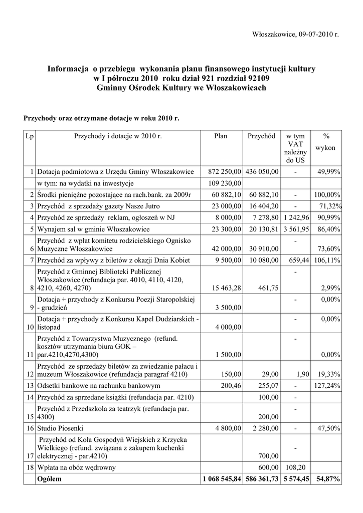 Włoszakowice, 09-07-2010 r. Informacja o przebiegu wykonania planu finansowego instytucji kultury w I półroczu 2010 roku dział 921 rozdział 92109 Gminny Ośrodek Kultury we Włoszakowicach Przychody oraz otrzymane dotacje w roku 2010 r. Lp Przychody i dotacje w 2010 r. 1 Dotacja podmiotowa z Urzędu Gminy Włoszakowice w tym: na wydatki na inwestycje Plan Przychód 872 250,00 436 050,00 w tym VAT należny do US % wykon - 49,99% 109 230,00 2 Środki pieniężne pozostające na rach.bank. za 2009r 60 882,10 60 882,10 - 100,00% 3 Przychód z sprzedaży gazety Nasze Jutro 23 000,00 16 404,20 - 71,32% 4 Przychód ze sprzedaży reklam, ogłoszeń w NJ 5 Wynajem sal w gminie Włoszakowice 8 000,00 7 278,80 1 242,96 90,99% 23 300,00 20 130,81 3 561,95 86,40% Przychód z wpłat komitetu rodzicielskiego Ognisko 6 Muzyczne Włoszakowice 42 000,00 30 910,00 73,60% 7 Przychód za wpływy z biletów z okazji Dnia Kobiet 9 500,00 10 080,00 659,44 106,11% Przychód z Gminnej Biblioteki Publicznej Włoszakowice (refundacja par. 4010, 4110, 4120, 8 4210, 4260, 4270) Dotacja + przychody z Konkursu Poezji Staropolskiej 9 - grudzień Dotacja + przychody z Konkursu Kapel Dudziarskich 10 listopad Przychód z Towarzystwa Muzycznego (refund. kosztów utrzymania biura GOK – 11 par.4210,4270,4300) - 15 463,28 461,75 2,99% - 0,00% - 0,00% 3 500,00 4 000,00 1 500,00 0,00% Przychód ze sprzedaży biletów za zwiedzanie pałacu i 12 muzeum Włoszakowice (refundacja paragraf 4210) 150,00 29,00 13 Odsetki bankowe na rachunku bankowym 200,46 255,07 - 100,00 - 14 Przychód za sprzedane książki (refundacja par. 4210) Przychód z Przedszkola za teatrzyk (refundacja par. 15 4300) 16 Studio Piosenki 1,90 127,24% 200,00 4 800,00 2 280,00 - Przychód od Koła Gospodyń Wiejskich z Krzycka Wielkiego (refund. związana z zakupem kuchenki 17 elektrycznej - par.4210) 700,00 18 Wpłata na obóz wędrowny 600,00 108,20 Ogółem 19,33% 47,50% - 1 068 545,84 586 361,73 5 574,45 54,87% Wykonanie planu finansowego Gminnego Ośrodka Kultury w I półroczu 2010 roku przebiegło prawidłowo. Ogólne przychody w 2010 roku osiągnięte zostały na założonym poziomie. Na dzień 01-01-2010 r. na rachunku bankowym pozostała kwota 60.882,10 zł. Natomiast na koniec I półrocza stan środków pieniężnych na rachunku bankowym wyniósł 161.339,26 zł. W omawianym półroczu Gminny Ośrodek Kultury uzyskał dotacje na działalność bieżącą i na wydatki inwestycyjne w wysokości 436.050 zł. W II półroczu GOK będzie ubiegał się o dotacje z Urzędu Marszałkowskiego w Lesznie na Konkurs Kapel Dudziarskich i Konkurs Poezji Staropolskiej, które zostaną przeprowadzone kolejno w listopadzie i grudniu 2010 r. Stosunkowo wysokie w porównaniu do zaplanowanych przychody własne w kwocie 87.083,81 zł osiągnięto z tytułu większej liczby sprzedaży gazety Nasze Jutro, ogłoszeń i reklam do gazety, wynajmów sal gminnych oraz większej liczy osób zainteresowanych nauką gry na instrumentach muzycznych w Samorządowym Ognisku Muzycznym we Włoszakowicach. Większa niż zaplanowano jest również frekwencja z wpływów ze sprzedaży biletów na Gminny Dzień Kobiet. Natomiast wpływy z nauki śpiewu w Studiu Piosenki osiągnięto w planowanej wysokości. Pozostałe przychody w wysokości 2.345,82 zł uzyskano z większych odsetek bankowych niż przewidywano, co spowodowane zostało posiadaniem na koncie bankowym większej ilości środków finansowych niż planowano. Dochody z tytułu sprzedaży biletów za zwiedzanie pałacu oraz muzeum Karola Kurpińskiego i Izb Regionalnych, nie osiągnięto w planowanej wysokości ze względu, na to że Izba Regionalna we Włoszakowicach została otwarta dopiero od 1 lipca 2010 r. W I półroczu GOK zagospodarował pomieszczenia pod salą we Włoszakowicach na Muzeum Karola Kurpińskiego, co spowodowało osiągnięcie przychodu z tytułu zwiedzania Muzeum. GOK osiągnął także przychody z refundacji kosztów z Gminnej Biblioteki Publicznej i Towarzystwa Muzycznego – większość obciążeń nastąpi w II półroczu. Gminny Ośrodek Kultury uzyskał także przychody, które nie były planowane, a które wynikły z działalności instytucji. Są to przychody wymienione w tabeli 1 w pkt 14, 15, 17, 18. Wydatki poniesione w 2010 r. Wydatki poniesione w 2010 r. Plan w zł Wydatki w zł. % wykon § 3020 Wydatki osobowe nie zaliczane do wynagrodzeń 5 370,00 4 460,00 83,05% § 3040 Nagrody i wydatki osobowe nie zaliczane do wynagr. 6 000,00 500,00 8,33% 223 891,47 81 774,06 36,52% 37 995,07 13 713,45 36,09% 5 438,50 1 810,32 33,29% § 4170 Wynagrodzenie bezosobowe 124 386,00 75 733,50 60,89% § 4210 Zakup materiałów i wyposażenia 129 290,00 65 325,72 50,53% § 4260 Zakup energii 36 550,00 24 123,56 66,00% § 4270 Zakup usług remontowych 93 100,00 18 528,46 19,90% § 4280 Zakup usług zdrowotnych 150,00 100,00 66,67% 169 220,00 84 777,68 50,10% § 4370 Zakup usług telekomunikacji stacjonarnej 5 150,00 1 179,02 22,89% § 4410 Podróże służbowe krajowe 8 042,70 4 740,23 58,94% § 4430 Różne opłaty i składki 4 000,00 700,00 0,18% § 4440 Odpis na ZFŚS 8 600,00 7 858,80 91,38% 500,00 0,00 0,00% § 4740 Zakup papieru do drukarek, kser i faksu 2 000,00 1 902,68 95,13% § 4750 Zakup akcesoriów komputerowych, w tym programów i licencji 3 750,00 0,00 0,00% 109 230,00 6 999,99 6,41% Przekazana dotacja dla Towarzystwa Muzycznego 30 000,00 30 000,00 100,00% Podatek od towarów i usług VAT zapłacony do US 5 000,00 795,00 15,90% 1 007 663,74 425 022,47 42,18% § 4010 Wynagrodzenie osobowe pracowników § 4110 Składki na ubezpieczenie społeczne § 4120 Składki na Fundusz Pracy § 4300 Zakup usług pozostałych § 4700 Szkolenia pracowników § 6050 Wydatki inwestycyjne jednostek OGÓŁEM Gminny Ośrodek Kultury w I półroczu wydatkował w wysokości 177.991,33 zł na wynagrodzenia i pochodne wynagrodzeń, w tym: Wydatki w § 3020 składały się z wypłaconego ekwiwalentu za materiały biurow