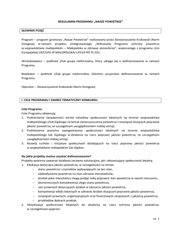 REGULAMIN PROGRAMU „NASZE POWIETRZE” SŁOWNIK POJĘĆ Program – program grantowy „Nasze Powietrze” realizowany przez Stowarzyszenie Krakowski Alarm Smogowy w ramach projektu zintegrowanego „Wdrażanie Programu ochrony powietrza w województwie małopolskim – Małopolska w zdrowej atmosferze”, wspieranego z programu Unii Europejskiej LIFE/LIFE-IP MALOPOLSKA/ LIFE14 IPE PL 021. Wnioskodawca – podmiot i/lub grupa nieformalna, który ubiega się o dofinansowanie w ramach Programu Realizator – podmiot i/lub grupa nieformalna, któremu przyznano dofinansowanie w ramach Programu Operator – Stowarzyszenie Krakowski Alarm Smogowy I. CELE PROGRAMU I ZAKRES TEMATYCZNY KONKURSU Cele Programu Cele Programu obejmują: 1. Podniesienie świadomości wśród członków społeczności lokalnych na terenie województwa małopolskiego i/lub śląskiego na temat zanieczyszczenia powietrza i rozwiązań służących poprawie jakości powietrza, ze szczególnym uwzględnieniem niskiej emisji; 2. Podniesienie poziomu zaangażowania społeczności lokalnych na terenie województwa małopolskiego lub śląskiego w działania na rzecz poprawy jakości powietrza, ze szczególnym uwzględnieniem niskiej emisji; 3. Rozwój ruchów i inicjatyw społecznych działających na rzecz poprawy jakości powietrza w województwie małopolskim lub śląskim. Na jakie projekty można uzyskać dofinansowanie? Projekty powinny zawierać działania zarówno edukacyjne, jak i aktywizujące społeczność lokalną. 1. Edukacja dotycząca jakości powietrza, w szczególności na temat: stanu powietrza i czynników wpływających na ten stan, oddziaływania powietrza na stan zdrowia mieszkańców, działań jakie mieszkańcy mogą podjąć żeby poprawić stan powietrza w swoim otoczeniu, ekonomicznych konsekwencji złego stanu powietrza, ram prawnych dotyczących działań w obszarze jakości powietrza, kompetencji władz lokalnych w zakresie działań służących poprawie jakości powietrza, rozwiązań prawnych, organizacyjnych oraz finansowych związanych z jakością powietrza, przykładów dobrych praktyk. 2. Aktywizacja społeczności lokalnych do działania na rzecz ochrony jakości powietrza, w szczególności poprzez: str. 1 tworzenie i rozwijanie ruchów i inicjatyw działających na rzecz jakości powietrza, zachęcanie mieszkańców, lokalnych liderów, przedstawicieli organizacji pozarządowych i władz lokalnych do angażowania się w działania na rzecz jakości powietrza, organizowanie społeczności lokalnej wokół tematyki ochrony powietrza. Przykładowe działania możliwe do zrealizowania w ramach projektu (nie jest to lista zamknięta, jedynie propozycje działań): spotkania informacyjne, edukacyjne, wykłady, konferencje, seminaria, warsztaty, prelekcje, pogadanki w szkołach, działania informacyjne w mediach, kampanie internetowe, tworzenie i dystrybucja materiałów informacyjnych i promocyjnych (broszur, ulotek, plakatów, publikacji), happeningi, konkursy, konsultacje i doradztwo, wizyty studyjne, współpraca z władzami, organizacjami pozarządowymi, społecznością lokalną. Do kogo mogą być skierowane działania? Projekty muszą być skierowane do grup docelowych z terenu województw: małopolskiego i śląskiego. Odbiorcami planowanych działań mogą być np. dzieci, młodzież, osoby dorosłe, władze lokalne, przedstawiciele systemu edukacji, przedstawiciele służby zdrowia, organizacje pozarządowe. Kto może uzyskać dotację? W konkursie przewiduje się dwa rodzaje wnioskodawców: organizacje pozarządowe i grupy nieformalne działające przy organizacjach pozarządowych. Szczegółowe wymagania dotyczące wnioskodawców przedstawiono poniżej: Organizacje pozarządowe O przyznanie dotacji może ubiegać się organizacja pozarządowa zgodnie z definicją zawartą w ustawie o działalności pożytku publicznego i o wolontariacie1, czyli podmiot który: nie należy do sektora finansów publicznych, nie działa w celu osiągnięcia zysku, jest osobą prawną lub jednostką nieposiadającą osobowości prawnej, ale odrębna ustawa przyznaje jej zdolność prawną. Organizacjami pozarządowymi są w szczególności stowarzyszenia i fundacje. Grupy nieformalne działające przy organizacjach pozarządowych O przyznanie dotacji mogą także ubiegać się grupy nieformalne liczące 3 osoby posiadające pełną zdolność do czynności prawnych, zamieszkujące na terenie województw: małopolskiego i/lub 1 Ustawa z dnia 24 kwietnia 2003 roku o działalności pożytku publicznego i o wolontariacie (Dz.U. 2003 nr 96 poz. 873 z późn. zm.), art. 3, ust. 2. str. 2 śląskiego. Grupy nieformalne mogą złożyć wniosek o dofinansowanie wyłącznie wspólnie z organizacją pozarządową, która użyczy im osobowości prawnej. Organizacje (składające wnioski samodzielnie lub użyczające osobowości grupie nieformalnej) muszą spełniać następujące warunki: posiadać wpis do Krajowego Rejestru Sądowego lub innej ewidencji, posiadać siedzibę lub oddział posiadający osobowość prawną na terenie województwa małopolskiego lub śląskiego, nie zalegać z opłacaniem należności z tytułu zobowiązań podatkowych ani składek na ubezpieczenia społeczne, nie podlegać wykluczeniu z ubiegania się o środki publiczne, prowadzić działalność w obszarze zgodnym z zakresem proponowanego projektu. O dofinansowanie (samodzielnie lub wspólnie z grupami nieformalnymi) nie mogą ubiegać się: partie polityczne, fundacje utworzone przez partie polityczne, związki zawodowe i organizacje pracodawców, samorządy zawodowe. Ile projektów można złożyć? Wnioskodawca może złożyć jeden wniosek o dofinansowanie w konkursie. Oznacza to, że: Organizacja może złożyć jeden wniosek o dofinansowanie. Jedna osoba może być członkiem jednej grupy nieformalnej. Jedna organizacja może użyczyć osobowości prawnej jednej grupie nieformalnej. W jakim okresie można realizować pro