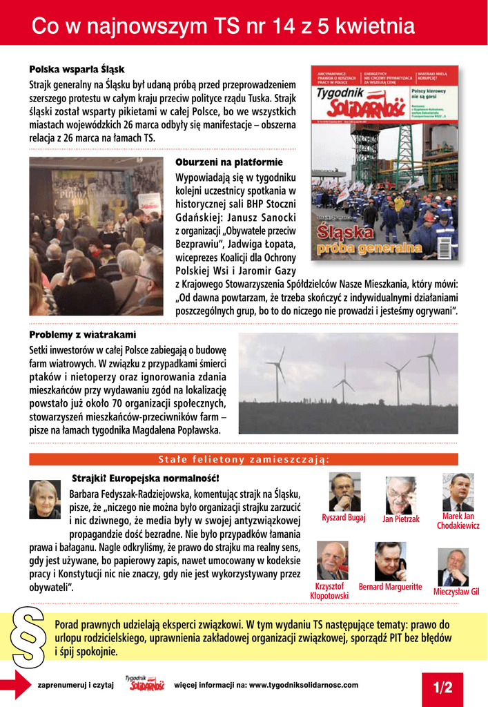 Co w najnowszym TS nr 14 z 5 kwietnia Polska wsparła Śląsk Strajk generalny na Śląsku był udaną próbą przed przeprowadzeniem szerszego protestu w całym kraju przeciw polityce rządu Tuska. Strajk śląski został wsparty pikietami w całej Polsce, bo we wszystkich miastach wojewódzkich 26 marca odbyły się manifestacje – obszerna relacja z 26 marca na łamach TS. Oburzeni na platformie Wypowiadają się w tygodniku kolejni uczestnicy spotkania w historycznej sali BHP Stoczni Gdańskiej: Janusz Sanocki z organizacji „Obywatele przeciw Bezprawiu”, Jadwiga Łopata, wiceprezes Koalicji dla Ochrony Polskiej Wsi i Jaromir Gazy z Krajowego Stowarzyszenia Spółdzielców Nasze Mieszkania, który mówi: „Od dawna powtarzam, że trzeba skończyć z indywidualnymi działaniami poszczególnych grup, bo to do niczego nie prowadzi i jesteśmy ogrywani”. Problemy z wiatrakami Setki inwestorów w całej Polsce zabiegają o budowę farm wiatrowych. W związku z przypadkami śmierci ptaków i nietoperzy oraz ignorowania zdania mieszkańców przy wydawaniu zgód na lokalizację powstało już około 70 organizacji społecznych, stowarzyszeń mieszkańców-przeciwników farm – pisze na łamach tygodnika Magdalena Popławska. St ałe felietony zamieszc zają: Strajki? Europejska normalność! Barbara Fedyszak-Radziejowska, komentując strajk na Śląsku, pisze, że „niczego nie można było organizacji strajku zarzucić i nic dziwnego, że media były w swojej antyzwiązkowej propagandzie dość bezradne. Nie było przypadków łamania prawa i bałaganu. Nagle odkryliśmy, że prawo do strajku ma realny sens, gdy jest używane, bo papierowy zapis, nawet umocowany w kodeksie pracy i Konstytucji nic nie znaczy, gdy nie jest wykorzystywany przez obywateli”. Ryszard Bugaj Krzysztof Kłopotowski Jan Pietrzak Bernard Margueritte Marek Jan Chodakiewicz Mieczysław Gil Porad prawnych udzielają eksperci związkowi. W tym wydaniu TS następujące tematy: prawo do urlopu rodzicielskiego, uprawnienia zakładowej organizacji związkowej, sporządź PIT bez błędów i śpij spokojnie. zaprenumeruj i czytaj więcej informacji na: www.tygodniksolidarnosc.com 1/2 Co w najnowszym TS nr 14 z 5 kwietnia Koszty pracy Prof. Grażyna Ancyparowicz w kolejnym swoim bardzo fachowym i przenikliwym materiale pisze, że zarabiamy – statystycznie rzecz biorąc – trochę więcej niż na początku transformacji ustrojowej, ale dotyczy to tylko tych zawodów i grup społecznych, które znalazły dla siebie wygodne miejsce w rządzonej twardą ręką neoliberalnej gospodarce. Zwiększyły się również dysproporcje dochodowe między miastem i wsią, poszczególnymi regionami Polski, wielkimi aglomeracjami i małymi miejscowościami. Wrażenie, że żyje nam się coraz dostatniej wynika z obfitości różnych importowanych dóbr, które w czasach realnego socjalizmu były dostępne wyłącznie w komisach i sklepach dla uprzywilejowanych. Polscy kierowcy nie są gorsi – Mimo że wykonują taką samą pracę, jeżdżą tymi samymi drogami i samochodami polscy kierowcy zarabiają znacznie mniej niż ich zachodni koledzy. W trasie często nie stać ich na prysznic – mówi na łamach tygodnika Bogdan Kubiak, przewodniczący Sekretariatu Transportowców NSZZ Solidarność. Z życia celebrytów Zadziwiające nieraz wnioski przychodzą na myśl, gdy posłuchamy wypowiedzi naszych gwiazd show-biznesu. Dlatego zachęcamy do czytania rubryki Ewy Zarzyckiej – „Z życia celebrytów”. Choćby taki kawałek: Natalia Siwiec wyznała w telewizji, że ma kompleksy. „Mam wiele kompleksów. Największym jest nos. Chciałam go zoperować, ale wszyscy lekarze, u których byłam, nawet dwaj w Polsce, odmówili mi. Nie chcieli się podjąć tej zmiany”. Ciekawe, dlaczego? Czyżby uznali, że chirurgiczne podniesienie piersi i wstrzykiwanie kwasu w wargi już celebrytce wystarczy? Nie, to byłoby zbyt okrutne ograniczenie, wręcz naruszanie praw człowieka. Pewnie po prostu się w owym nosie zakochali. Ponadto w każdym numerze oprócz tematyki związkowej i społecznej: gospodarka, historia, kultura, sport, krzyżówka i wiele więcej... zaprenumeruj i czytaj więcej informacji na: www.tygodniksolidarnosc.com 2/2