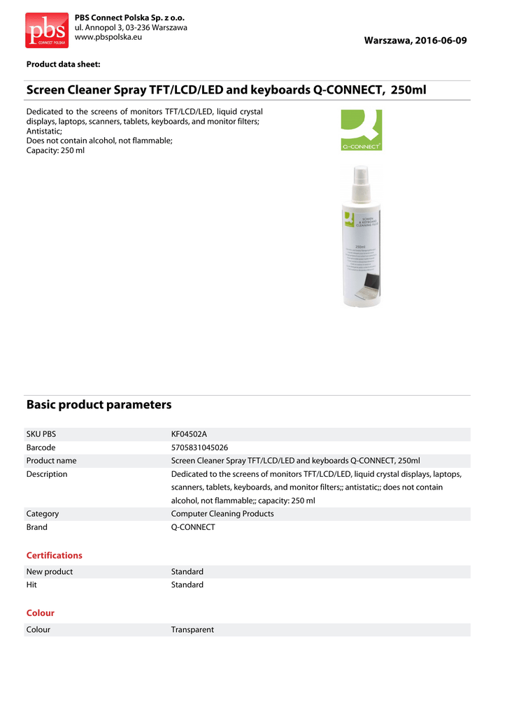 PBS Connect Polska Sp. z o.o. ul. Annopol 3, 03-236 Warszawa www.pbspolska.eu Warszawa, 2016-06-09 Product data sheet: Screen Cleaner Spray TFT/LCD/LED and keyboards Q-CONNECT, 250ml Dedicated to the screens of monitors TFT/LCD/LED, liquid crystal displays, laptops, scanners, tablets, keyboards, and monitor filters; Antistatic; Does not contain alcohol, not flammable; Capacity: 250 ml Basic product parameters SKU PBS KF04502A Barcode 5705831045026 Product name Screen Cleaner Spray TFT/LCD/LED and keyboards Q-CONNECT, 250ml Description Dedicated to the screens of monitors TFT/LCD/LED, liquid crystal displays, laptops, scanners, tablets, keyboards, and monitor filters;; antistatic;; does not contain alcohol, not flammable;; capacity: 250 ml Category Computer Cleaning Products Brand Q-CONNECT Certifications New product Standard Hit Standard Colour Colour Transparent PBS Connect Polska Sp. z o.o. ul. Annopol 3, 03-236 Warszawa www.pbspolska.eu Warszawa, 2016-06-09 Product data sheet cont. Screen Cleaner Spray TFT/LCD/LED and keyboards Q-CONNECT, 250ml Basic product parameters Feature Product Spray Type For TFT/LCD screens Kind Antistatic Offer from 2013-01 Dimensions Capacity (ml) 250 Procurement vocabulary CPV 30237250-6 Akcesoria do czyszczenia komputerów Logistic units Unit 1 20 Unit 2 1440