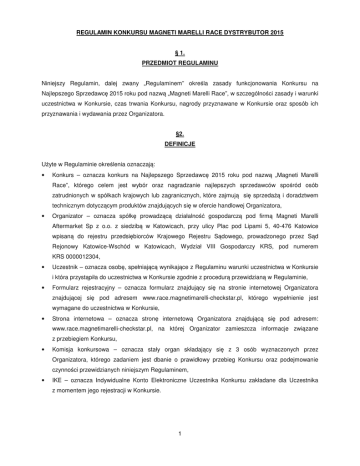 REGULAMIN KONKURSU MAGNETI MARELLI RACE DYSTRYBUTOR 2015 § 1. PRZEDMIOT REGULAMINU Niniejszy Regulamin, dalej zwany „Regulaminem” określa zasady funkcjonowania Konkursu na Najlepszego Sprzedawcę 2015 roku pod nazwą „Magneti Marelli Race”, w szczególności zasady i warunki uczestnictwa w Konkursie, czas trwania Konkursu, nagrody przyznawane w Konkursie oraz sposób ich przyznawania i wydawania przez Organizatora. §2. DEFINICJE Użyte w Regulaminie określenia oznaczają: • Konkurs – oznacza konkurs na Najlepszego Sprzedawcę 2015 roku pod nazwą „Magneti Marelli Race”, którego celem jest wybór oraz nagradzanie najlepszych sprzedawców spośród osób zatrudnionych w spółkach krajowych lub zagranicznych, które zajmują się sprzedażą i doradztwem technicznym dotyczącym produktów znajdujących się w ofercie handlowej Organizatora, • Organizator – oznacza spółkę prowadzącą działalność gospodarczą pod firmą Magneti Marelli Aftermarket Sp z o.o. z siedzibą w Katowicach, przy ulicy Plac pod Lipami 5, 40-476 Katowice wpisaną do rejestru przedsiębiorców Krajowego Rejestru Sądowego, prowadzonego przez Sąd Rejonowy Katowice-Wschód w Katowicach, Wydział VIII Gospodarczy KRS, pod numerem KRS 0000012304, • Uczestnik – oznacza osobę, spełniającą wynikające z Regulaminu warunki uczestnictwa w Konkursie i która przystąpiła do uczestnictwa w Konkursie zgodnie z procedurą przewidzianą w Regulaminie, • Formularz rejestracyjny – oznacza formularz znajdujący się na stronie internetowej Organizatora znajdującej się pod adresem www.race.magnetimarelli-checkstar.pl, którego wypełnienie jest wymagane do uczestnictwa w Konkursie, • Strona internetowa – oznacza stronę internetową Organizatora znajdującą się pod adresem: www.race.magnetimarelli-checkstar.pl, na której Organizator zamieszcza informacje związane z przebiegiem Konkursu, • Komisja konkursowa – oznacza stały organ składający się z 3 osób wyznaczonych przez Organizatora, którego zadaniem jest dbanie o prawidłowy przebieg Konkursu oraz podejmowanie czynności przewidzianych niniejszym Regulaminem, • IKE – oznacza Indywidualne Konto Elektroniczne Uczestnika Konkursu zakładane dla Uczestnika z momentem jego rejestracji w Konkursie. 1 • Dystrybutor – oznacza każdy podmiot krajowy lub podmiot zagraniczny, zajmujący się w ramach prowadzonej działalności gospodarczej, sprzedażą produktów znajdujących się w ofercie handlowej Organizatora. §3. POSTANOWIENIA OGÓLNE 1. Konkurs jest organizowany na terenie Rzeczypospolitej Polskiej oraz poza jej granicami. 2. Celem Konkursu jest wybór oraz nagradzanie najlepszych sprzedawców spośród osób zatrudnionych w podmiotach krajowych lub w podmiotach zagranicznych, które zajmują się sprzedażą i doradztwem technicznym produktów znajdujących się w ofercie handlowej Organizatora. 3. Konkurs polega na doprowadzeniu przez Uczestnika, w każdym etapie konkursu w okresie od dnia 15.01.2015 roku do dnia 30.06.2015 do sprzedaży, na rzecz podmiotów trzecich, jak największej ilości produktów Organizatora opisanych w § 4 ust. 1 znajdujących się w sprzedaży u Dystrybutora. Produkty o których mowa powyżej powinny zostać zakupione przez Dystrybutora u Organizatora nie wcześniej niż 1 stycznia 2015r. W Konkursie mogą zostać uwzględnione produkty zakupione przed 1 stycznia 2015r. pod warunkiem, że w czasie trwania Konkursu Dystrybutor złoży u Organizatora zamówienie, uzupełniające jego stany magazynowe o warunkowo zaliczone do Konkursu produkty. 4. Konkurs rozpoczyna się w dniu 15 stycznia 2015 r. i będzie trwał, przez czas określony, do dnia 30 czerwca 2015 r. Konkurs będzie podzielony na 3 etapy: Etap I od dnia 15.01.2015 do 28.02.2015 Etap II od dnia 01.03.2015 do 30.04.2015 Etap III od dnia 01.05.2015 do 30.06.2015 z zastrzeżeniem, iż z ważnych przyczyn Organizator może w dowolnym momencie zdecydować o wcześniejszym zakończeniu Konkursu. W takiej sytuacji Organizator zawiadomi wszystkich Uczestników o nowym terminie zakończenia Konkursu, który nie może przypadać na krócej niż 1 miesiąc od dnia zawiadomienia wszystkich Uczestników Konkursu. Zawiadomienie nastąpi pocztą elektroniczną na adresy podane przez Uczestników przy rejestracji. Ogłoszenie zostanie dokonane również na Stronie internetowej. 5. Na każdym etapie Konkursu, w okresach wskazanych w ust. 4, wygrywa pierwszych 40 Uczestników, którzy doprowadzą do sprzedaży największej ilości produktów Organizatora spośród tych określonych w § 4 ust. 1, zwanych dalej Zwycięzcami Konkursu, 6. Po zakończeniu każdego etapu Konkursu zgromadzone na IKE Uczestników nagrody podlegają wyzerowaniu, a Uczestnicy rozpoczynają od nowa zbieranie nagród w kolejnym etapie Konkursu. 2 7. Rozstrzygnięcie Konkursu nastąpi w terminie 45 dni roboczych po zakończeniu każdego kolejnego etapu konkursu. Uczestnicy Konkursu zostaną poinformowani o jego rozstrzygnięciu i o tym, kto został zwycięzcą Konkursu za pośrednictwem poczty elektronicznej. 8. W sytuacji gdy Organizator podejmie decyzję o zakończeniu Konkursu w ciągu 1 miesiąca od dnia jego rozpoczęcia, może równocześnie podjąć decyzję, iż nagrody w Konkursie nie będą przyznawane. Regulamin Konkursu dostępny jest na Stronie internetowej oraz w siedzibie Organizatora. 9. 10. W związku z rozpoczęciem Konkursu, Organizator powołuje Komisję konkursową w składzie: • Przemysław Treliński • Magdalena Nadowska- Dudzik • Sebastian Fraj Komisja konkursowa podejmuje decyzje większością głosów przy obecności wszystkich jej członków. Organizator uprawniony jest w każdym czasie i z dowolnych przyczyn zmienić skład osobowy Komisji konkursowej. 11. Sposób opodatkowania uzyskanych przez Uczestników nagród w Konkursie, przedstawia się w sposób następujący: Organizator, jako płatnik należnego podatku, pobierze od nagrodzone