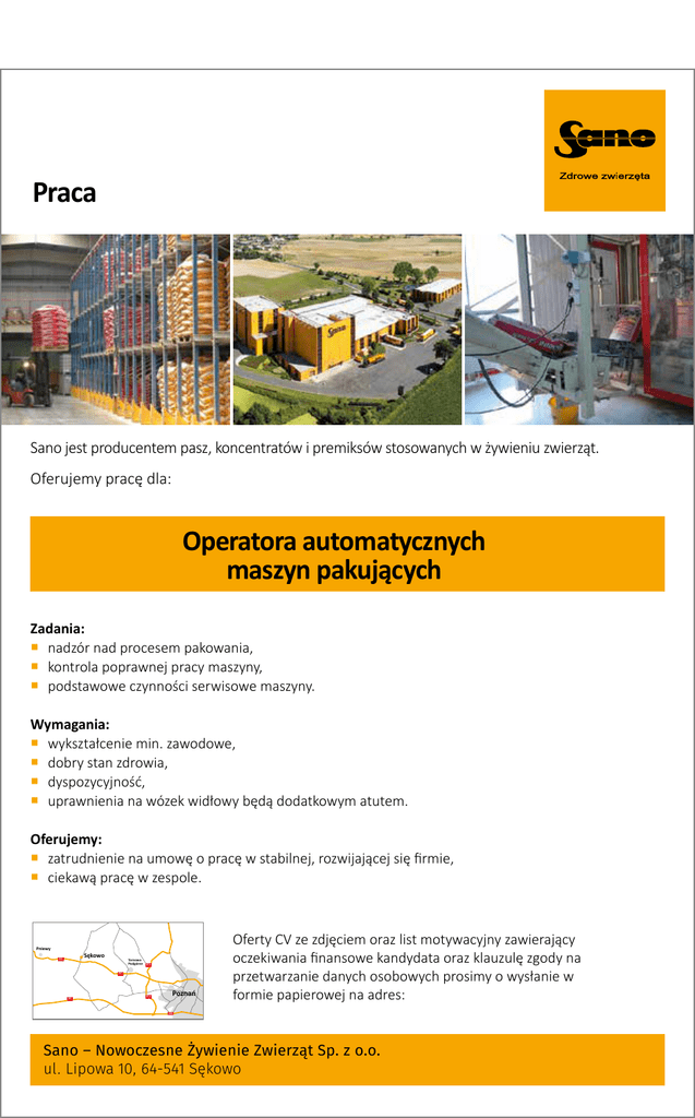 Praca Sano jest producentem pasz, koncentratów i premiksów stosowanych w żywieniu zwierząt. Oferujemy pracę dla: Sano jest producentem pasz, koncentratów i premiksów stosowanych w żywieniu zwierząt. Oferujemy pracę dla: Operatora automatycznych maszyn pakujących Zadania: ¡nadzór nad procesem pakowania, ¡kontrola poprawnej pracy maszyny, ¡podstawowe czynności serwisowe maszyny. Wymagania: ¡wykształcenie min. zawodowe, ¡dobry stan zdrowia, ¡dyspozycyjność, ¡uprawnienia na wózek widłowy będą dodatkowym atutem. Oferujemy: ¡zatrudnienie na umowę o pracę w stabilnej, rozwijającej się firmie, ¡ciekawą pracę w zespole. Pniewy Sękowo 92 Tarnowo Podgórne S11 92 A2 S11 Poznań Oferty CV ze zdjęciem oraz list motywacyjny zawierający oczekiwania finansowe kandydata oraz klauzulę zgody na przetwarzanie danych osobowych prosimy o wysłanie w formie papierowej na adres: A2 Sano – Nowoczesne Żywienie Zwierząt Sp. z o.o. ul. Lipowa 10, 64-541 Sękowo