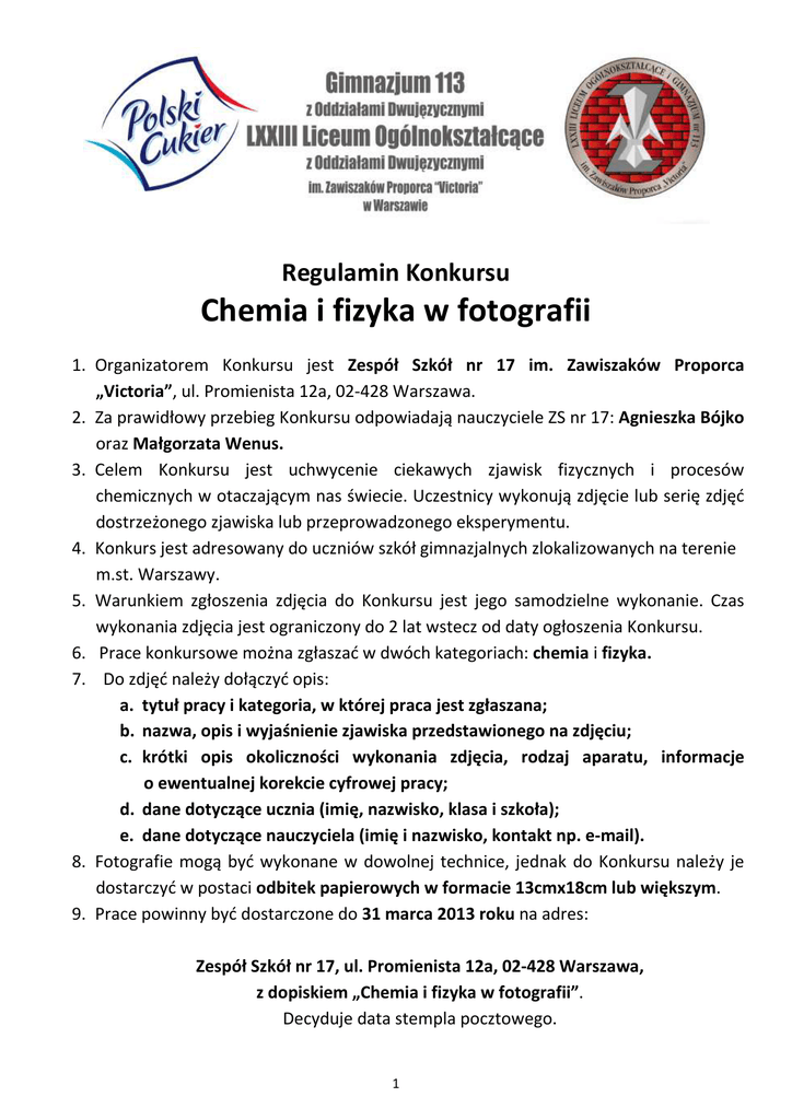 Regulamin Konkursu Chemia i fizyka w fotografii 1. Organizatorem Konkursu jest Zespół Szkół nr 17 im. Zawiszaków Proporca „Victoria”, ul. Promienista 12a, 02-428 Warszawa. 2. Za prawidłowy przebieg Konkursu odpowiadają nauczyciele ZS nr 17: Agnieszka Bójko oraz Małgorzata Wenus. 3. Celem Konkursu jest uchwycenie ciekawych zjawisk fizycznych i procesów chemicznych w otaczającym nas świecie. Uczestnicy wykonują zdjęcie lub serię zdjęć dostrzeżonego zjawiska lub przeprowadzonego eksperymentu. 4. Konkurs jest adresowany do uczniów szkół gimnazjalnych zlokalizowanych na terenie m.st. Warszawy. 5. Warunkiem zgłoszenia zdjęcia do Konkursu jest jego samodzielne wykonanie. Czas wykonania zdjęcia jest ograniczony do 2 lat wstecz od daty ogłoszenia Konkursu. 6. Prace konkursowe można zgłaszać w dwóch kategoriach: chemia i fizyka. 7. Do zdjęć należy dołączyć opis: a. tytuł pracy i kategoria, w której praca jest zgłaszana; b. nazwa, opis i wyjaśnienie zjawiska przedstawionego na zdjęciu; c. krótki opis okoliczności wykonania zdjęcia, rodzaj aparatu, informacje o ewentualnej korekcie cyfrowej pracy; d. dane dotyczące ucznia (imię, nazwisko, klasa i szkoła); e. dane dotyczące nauczyciela (imię i nazwisko, kontakt np. e-mail). 8. Fotografie mogą być wykonane w dowolnej technice, jednak do Konkursu należy je dostarczyć w postaci odbitek papierowych w formacie 13cmx18cm lub większym. 9. Prace powinny być dostarczone do 31 marca 2013 roku na adres: Zespół Szkół nr 17, ul. Promienista 12a, 02-428 Warszawa, z dopiskiem „Chemia i fizyka w fotografii”. Decyduje data stempla pocztowego. 1 10.Korekta cyfrowa zdjęć przesłanych na Konkurs może polegać jedynie na działaniach odpowiadających zabiegom stosowanym w ciemni fotograficznej (redukcja koloru, rozjaśnianie, kontrastowanie). Wszelkie inne zmiany, w tym fotomontaż, są niedopuszczalne. 11.Przy ocenie prac będzie brana pod uwagę umiejętność dostrzegania i dokumentowania zjawisk fizycznych i procesów chemicznych. 12. Oceny zdjęć dokona Komisja Konkursu, przewidziane są nagrody rzeczowe za I, II i III miejsce w każdej kategorii oraz wyróżnienia. 13.Komisja Konkursu może przyznać dwie nagrody tego samego stopnia. 14.Komisja Konkursu ma prawo odrzucić prace niezgodne z Regulaminem, odbiegające od tematu, wadliwe technicznie lub naruszające prawo. 15.Do Konkursu nie zostaną przyjęte zdjęcia, których wykonanie odbyło się z naruszeniem zasad bezpieczeństwa, mogło spowodować zagrożenie dla zdrowia lub życia, oraz zdjęcia zawierające treści obraźliwe czy wulgarne. 16.Zdjęcia zgłoszone do Konkursu nie mogą naruszać jakichkolwiek praw osób trzecich, w szczególności praw autorskich, dóbr osobistych lub prawa do ochrony wizerunku. 17. Oficjalne ogłoszenie wyników Konkursu oraz wręczenie nagród nastąpi w trakcie zorganizowanej w tym celu uroczystości dnia 15 kwietnia 2013 roku o godz. 12.00 w Zespole Szkół nr 17, ul. Promienista 12a, Warszawa. 18.Zgłoszenie pracy do Konkursu oznacza, że Uczestnikowi przysługuje autorskie prawo majątkowe i osobiste do nadesłanych zdjęć. 19.Przystąpienie do Konkursu oznacza wyrażenie zgody na przetwarzanie danych osobowych uczestników przez Organizatora w celu przeprowadzenia i rozstrzygnięcia Konkursu oraz identyfikacji Uczestników i Laureatów Konkursu, wydania nagród oraz publicznego podania imion i nazwisk osób nagrodzonych, nazwy szkoły, imienia i nazwiska nauczyciela, zgodnie z ustawą o ochronie danych osobowych. 20.Wszystkie prace biorące udział w konkursie przechodzą na własność Organizatora (nie będą zwracane Uczestnikom Konkursu). Organizator zastrzega sobie prawo do różnych form publikacji nadesłanych prac. 21.Zgłoszenie zdjęć do Konkursu jest jednoznaczne z przyjęciem przez Uczestnika Konkursu warunków Regulaminu. 22.Naruszenie przez Uczestnika Konkursu któregokolwiek z warunków uczestnictwa w Konkursie, spowoduje utratę prawa do otrzymania nagrody. W przypadku stwierdzenia naruszenia zapisów niniejszego Regulaminu, Uczestnik Konkursu będzie zobowiązany do zwrotu otrzymanej nagrody. 23.Dodatkowe informacje i wyjaśnienia można uzyskać pod numerem telefonu 022 863 73 04 lub pod adresem e-mail: [email protected]. 2