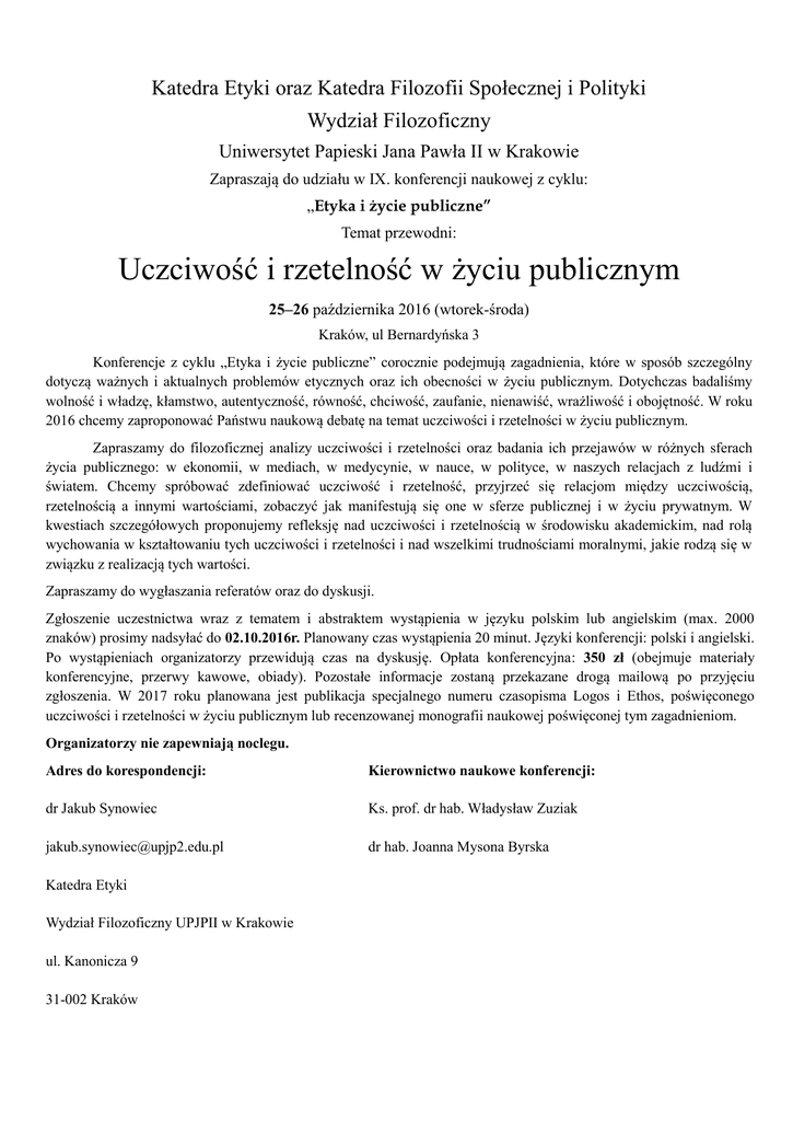 Katedra Etyki oraz Katedra Filozofii Społecznej i Polityki Wydział Filozoficzny Uniwersytet Papieski Jana Pawła II w Krakowie Zapraszają do udziału w IX. konferencji naukowej z cyklu: „Etyka i życie publiczne” Temat przewodni: Uczciwość i rzetelność w życiu publicznym 25–26 października 2016 (wtorek-środa) Kraków, ul Bernardyńska 3 Konferencje z cyklu „Etyka i życie publiczne” corocznie podejmują zagadnienia, które w sposób szczególny dotyczą ważnych i aktualnych problemów etycznych oraz ich obecności w życiu publicznym. Dotychczas badaliśmy wolność i władzę, kłamstwo, autentyczność, równość, chciwość, zaufanie, nienawiść, wrażliwość i obojętność. W roku 2016 chcemy zaproponować Państwu naukową debatę na temat uczciwości i rzetelności w życiu publicznym. Zapraszamy do filozoficznej analizy uczciwości i rzetelności oraz badania ich przejawów w różnych sferach życia publicznego: w ekonomii, w mediach, w medycynie, w nauce, w polityce, w naszych relacjach z ludźmi i światem. Chcemy spróbować zdefiniować uczciwość i rzetelność, przyjrzeć się relacjom między uczciwością, rzetelnością a innymi wartościami, zobaczyć jak manifestują się one w sferze publicznej i w życiu prywatnym. W kwestiach szczegółowych proponujemy refleksję nad uczciwości i rzetelnością w środowisku akademickim, nad rolą wychowania w kształtowaniu tych uczciwości i rzetelności i nad wszelkimi trudnościami moralnymi, jakie rodzą się w związku z realizacją tych wartości. Zapraszamy do wygłaszania referatów oraz do dyskusji. Zgłoszenie uczestnictwa wraz z tematem i abstraktem wystąpienia w języku polskim lub angielskim (max. 2000 znaków) prosimy nadsyłać do 02.10.2016r. Planowany czas wystąpienia 20 minut. Języki konferencji: polski i angielski. Po wystąpieniach organizatorzy przewidują czas na dyskusję. Opłata konferencyjna: 350 zł (obejmuje materiały konferencyjne, przerwy kawowe, obiady). Pozostałe informacje zostaną przekazane drogą mailową po przyjęciu zgłoszenia. W 2017 roku planowana jest publikacja specjalnego numeru czasopisma Logos i Ethos, poświęconego uczciwości i rzetelności w życiu publicznym lub recenzowanej monografii naukowej poświęconej tym zagadnieniom. Organizatorzy nie zapewniają noclegu. Adres do korespondencji: Kierownictwo naukowe konferencji: dr Jakub Synowiec Ks. prof. dr hab. Władysław Zuziak [email protected] dr hab. Joanna Mysona Byrska Katedra Etyki Wydział Filozoficzny UPJPII w Krakowie ul. Kanonicza 9 31-002 Kraków wf.upjp2.edu.pl