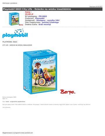 Informacje o produkcie Utworzono 07-03-2017 Playmobil 6663 City Life - Dziecko na wózku inwalidzkim Cena : 22,00 zł Nr katalogowy : PM.6663 Producent : Playmobil Dostępność : Dostępny - wysyłka 24h! Stan magazynowy : poniżej średniego Średnia ocena : brak recenzji PLAYMOBIL 6663 CITY LIFE - DZIECKO NA WÓZKU INWALIDZKIM Numer katalogowy: 6663 Wiek: 4+ Stan: nowe - oryginalnie zapakowane Dziś jest piękny dzień. Tata odbiera dziecko z oddziału. Korzystając z wózka dziecko nawet ze złamaną nogą może spędzić czas w parku i nacieszyć się słońcem. inne elementy Wygenerowano w programie www.oscGold.com Informacje o produkcie Dostępność w salonach: Ilość sztuk: Sklep - Złotniki: 2 Sklep - zlikwidowany: 0 Sklep - Szczepankowo: 1 Dostępne opcje Playmobil 6663 City Life - Dziecko na wózku inwalidzkim » Wiek: 3 - 4 lat, 5 - 7 lat, 8 - 11 lat. Wygenerowano w programie www.oscGold.com