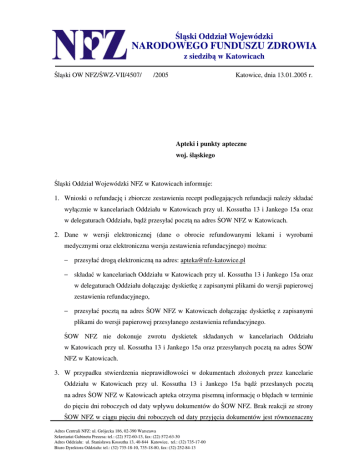 Śląski Oddział Wojewódzki NARODOWEGO FUNDUSZU ZDROWIA z siedzibą w Katowicach Śląski OW NFZ/ŚWZ-VII/4507/ /2005 Katowice, dnia 13.01.2005 r. Apteki i punkty apteczne woj. śląskiego Śląski Oddział Wojewódzki NFZ w Katowicach informuje: 1. Wnioski o refundację i zbiorcze zestawienia recept podlegających refundacji należy składać wyłącznie w kancelariach Oddziału w Katowicach przy ul. Kossutha 13 i Jankego 15a oraz w delegaturach Oddziału, bądź przesyłać pocztą na adres ŚOW NFZ w Katowicach. 2. Dane w wersji elektronicznej (dane o obrocie refundowanymi lekami i wyrobami medycznymi oraz elektroniczna wersja zestawienia refundacyjnego) można: − przesyłać drogą elektroniczną na adres: [email protected] − składać w kancelariach Oddziału w Katowicach przy ul. Kossutha 13 i Jankego 15a oraz w delegaturach Oddziału dołączając dyskietkę z zapisanymi plikami do wersji papierowej zestawienia refundacyjnego, − przesyłać pocztą na adres ŚOW NFZ w Katowicach dołączając dyskietkę z zapisanymi plikami do wersji papierowej przesyłanego zestawienia refundacyjnego. ŚOW NFZ nie dokonuje zwrotu dyskietek składanych w kancelariach Oddziału w Katowicach przy ul. Kossutha 13 i Jankego 15a oraz przesyłanych pocztą na adres ŚOW NFZ w Katowicach. 3. W przypadku stwierdzenia nieprawidłowości w dokumentach złożonych przez kancelarie Oddziału w Katowicach przy ul. Kossutha 13 i Jankego 15a bądź przesłanych pocztą na adres ŚOW NFZ w Katowicach apteka otrzyma pisemną informację o błędach w terminie do pięciu dni roboczych od daty wpływu dokumentów do ŚOW NFZ. Brak reakcji ze strony ŚOW NFZ w ciągu pięciu dni roboczych od daty przyjęcia dokumentów jest równoznaczny Adres Centrali NFZ: ul. Grójecka 186, 02-390 Warszawa Sekretariat Gabinetu Prezesa: tel.: (22) 572-60-13, fax: (22) 572-63-30 Adres Oddziału: ul. Stanisława Kossutha 13, 40-844 Katowice, tel.: (32) 735-17-00 Biuro Dyrektora Oddziału: tel.: (32) 735-18-10, 735-18-80, fax: (32) 252-84-13 Śląski Oddział Wojewódzki NARODOWEGO FUNDUSZU ZDROWIA z siedzibą w Katowicach z pozytywnym wynikiem ich weryfikacji. Po pozytywnym wyniku weryfikacji dokumentów elektronicznych przesłanych na adres: [email protected] nadawca otrzyma drogą elektroniczną zwrotną informację potwierdzającą fakt otrzymania komunikatu przez ŚOW NFZ a w razie stwierdzenia błędów - raport z informacją o nieprawidłowościach. Zachęcamy do przesyłania danych drogą elektroniczną z uwagi na stosunkowo szybką informację zwrotną wysyłaną do nadawcy. Prosimy jednak pamiętać, że możliwość przesyłania danych o obrocie refundowanymi lekami i wyrobami medycznymi oraz elektronicznej wersji zbiorczego zestawienia recept drogą elektroniczną nie zwalnia apteki z obowiązku składania zbiorczego zestawienia recept w wersji papierowej. 4. W razie konieczności wymiany dokumentów w związku z negatywnym wynikiem ich weryfikacji, apteka składa ponownie sporządzone, skorygowane dokumenty w trybie określonym w punktach 1 i 2. Do skorygowanych dokumentów składanych osobiście przez kancelarie bądź przesyłanych drogą pocztową na adres ŚOW NFZ w Katowicach apteka jest zobowiązana dołączyć pismo informujące o konieczności wymiany dokumentów. 5. Regulacje przedstawione w punktach od 1 do 4 będą obowiązywać do 01 czerwca 2005 r. 6. Przypominamy, że zgodnie z zapisami obowiązującego rozporządzenia Ministra Zdrowia z dnia 28 września 2004 r. w sprawie sposobu oraz terminów przedstawiania przez apteki podmiotom zobowiązanym do finansowania świadczeń ze środków publicznych zbiorczych zestawień zrealizowanych recept podlegających refundacji, a także wzoru zbiorczego zestawienia recept podlegających refundacji (Dz. U. Nr 213 z 2004 r., poz. 2165) złożenie dokumentów stanowiących podstawę dokonania refundacji powinno nastąpić w ciągu pięciu dni roboczych od dnia zakończenia okresu rozliczeniowego. Nieprzestrzeganie tego przepisu będzie skutkowało przesunięciem terminu dokonania refundacji cen leków wynikającej ze złożonych dokumentów. Adres Centrali NFZ: ul. Grójecka 186, 02-390 Warszawa Sekretariat Gabinetu Prezesa: tel.: (22) 572-60-13, fax: (22) 572-63-30 Adres Oddziału: ul. Stanisława Kossutha 13, 40-844 Katowice, tel.: (32) 735-17-00 Biuro Dyrektora Oddziału: tel.: (32) 735-18-10, 735-18-80, fax: (32) 252-84-13
