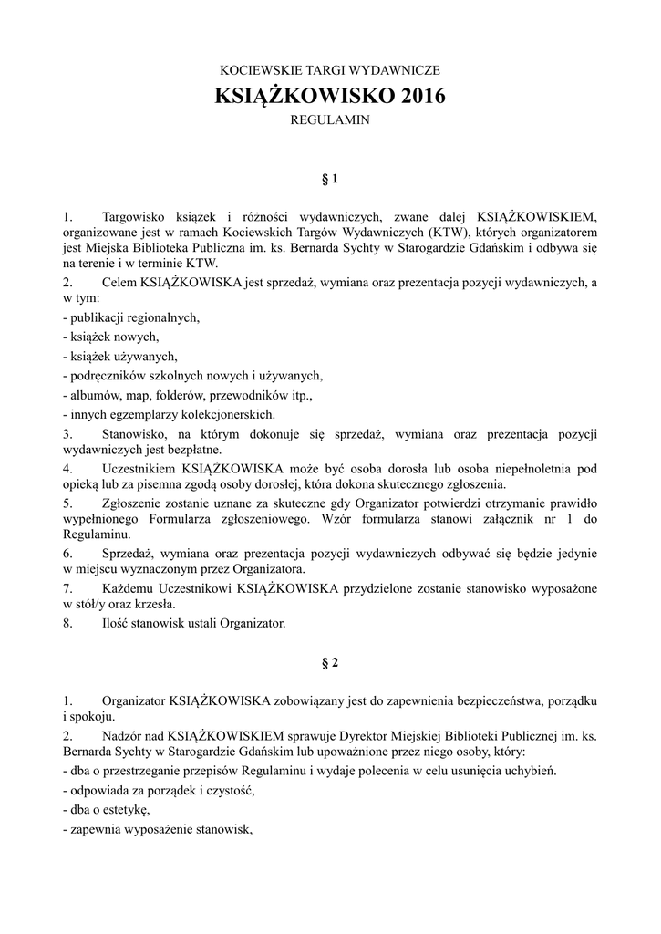 KOCIEWSKIE TARGI WYDAWNICZE KSIĄŻKOWISKO 2016 REGULAMIN §1 1. Targowisko książek i różności wydawniczych, zwane dalej KSIĄŻKOWISKIEM, organizowane jest w ramach Kociewskich Targów Wydawniczych (KTW), których organizatorem jest Miejska Biblioteka Publiczna im. ks. Bernarda Sychty w Starogardzie Gdańskim i odbywa się na terenie i w terminie KTW. 2. Celem KSIĄŻKOWISKA jest sprzedaż, wymiana oraz prezentacja pozycji wydawniczych, a w tym: - publikacji regionalnych, - książek nowych, - książek używanych, - podręczników szkolnych nowych i używanych, - albumów, map, folderów, przewodników itp., - innych egzemplarzy kolekcjonerskich. 3. Stanowisko, na którym dokonuje się sprzedaż, wymiana oraz prezentacja pozycji wydawniczych jest bezpłatne. 4. Uczestnikiem KSIĄŻKOWISKA może być osoba dorosła lub osoba niepełnoletnia pod opieką lub za pisemna zgodą osoby dorosłej, która dokona skutecznego zgłoszenia. 5. Zgłoszenie zostanie uznane za skuteczne gdy Organizator potwierdzi otrzymanie prawidło wypełnionego Formularza zgłoszeniowego. Wzór formularza stanowi załącznik nr 1 do Regulaminu. 6. Sprzedaż, wymiana oraz prezentacja pozycji wydawniczych odbywać się będzie jedynie w miejscu wyznaczonym przez Organizatora. 7. Każdemu Uczestnikowi KSIĄŻKOWISKA przydzielone zostanie stanowisko wyposażone w stół/y oraz krzesła. 8. Ilość stanowisk ustali Organizator. §2 1. Organizator KSIĄŻKOWISKA zobowiązany jest do zapewnienia bezpieczeństwa, porządku i spokoju. 2. Nadzór nad KSIĄŻKOWISKIEM sprawuje Dyrektor Miejskiej Biblioteki Publicznej im. ks. Bernarda Sychty w Starogardzie Gdańskim lub upoważnione przez niego osoby, który: - dba o przestrzeganie przepisów Regulaminu i wydaje polecenia w celu usunięcia uchybień. - odpowiada za porządek i czystość, - dba o estetykę, - zapewnia wyposażenie stanowisk, - wstrzyma sprzedaż towarów objętych zakazem sprzedaży, zawiadamiając właściwe służby publiczne. §3 1. Zabrania się sprzedaży, wymiany oraz prezentacji pozycji wydawniczych poza miejscami do tego wyznaczonymi. 2. Zabrania się sprzedaży obnośnej po terenie Kociewskich Targów Wydawniczych. 3. Wyznaczone stanowiska nie mogą być odstępowane osobom trzecim. §4 1. Uczestnicy KSIĄŻKOWISKA zobowiązani są do: - przestrzegania niniejszego regulaminu, - przestrzegania obowiązujących przepisów w zakresie prowadzonej działalności gospodarczej, a w szczególności: przepisów sanitarnych, weterynaryjnych, porządkowych, przeciwpożarowych, dotyczących praw konsumenta, przepisów ustawy o swobodzie działalności gospodarczej, - stosowania się do zarządzeń i postanowień wydawanych przez Organizatora, - utrzymania stanowiska w należytym ładzie i porządku, zarówno w trakcie KSIĄŻKOWISKA jak i po jego zakończeniu, - poddania się kontroli przez organy do tego upoważnione. §5 Organizator nie ponosi odpowiedzialności za ceny, jakość towarów i usług, sposób ich sprzedaży oraz za rzeczy pozostawione na targowiskach. §6 Organizator KSIĄŻKOWISKA informuje właściwe służby tj. Policję, Straż Miejską w Starogardzie Gdańskim, Państwowego Powiatowego Inspektora Sanitarnego, Powiatowego Lekarza Weterynarii i inne organy o przypadkach naruszeń obowiązujących przepisów prawa. §7 Wszelkie uwagi, wnioski i skargi związane z funkcjonowaniem KSIĄŻKOWISKA można składać Dyrektorowi Miejskiej Biblioteki Publicznej im. ks. Bernarda Sychty w Starogardzie Gdańskim. §8 Organizator zastrzega sobie prawo do zmiany Regulaminu.