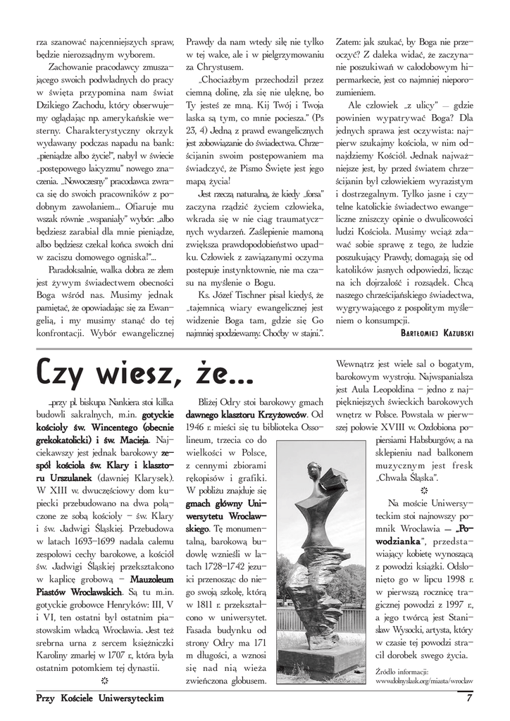 rza szanowaæ najcenniejszych spraw, bêdzie nierozs¹dnym wyborem. Zachowanie pracodawcy zmuszaj¹cego swoich podw³adnych do pracy w wiêta przypomina nam wiat Dzikiego Zachodu, który obserwujemy ogl¹daj¹c np. amerykañskie westerny. Charakterystyczny okrzyk wydawany podczas napadu na bank: pieni¹dze albo ¿ycie!, naby³ w wiecie postêpowego laicyzmu nowego znaczenia. Nowoczesny pracodawca zwraca siê do swoich pracowników z podobnym zawo³aniem... Ofiaruje mu wszak równie wspania³y wybór: albo bêdziesz zarabia³ dla mnie pieni¹dze, albo bêdziesz czeka³ koñca swoich dni w zaciszu domowego ogniska!... Paradoksalnie, walka dobra ze z³em jest ¿ywym wiadectwem obecnoci Boga wród nas. Musimy jednak pamiêtaæ, ¿e opowiadaj¹c siê za Ewangeli¹, i my musimy stan¹æ do tej konfrontacji. Wybór ewangelicznej Prawdy da nam wtedy si³ê nie tylko w tej walce, ale i w pielgrzymowaniu za Chrystusem. Chocia¿bym przechodzi³ przez ciemn¹ dolinê, z³a siê nie ulêknê, bo Ty jeste ze mn¹. Kij Twój i Twoja laska s¹ tym, co mnie pociesza. (Ps 23, 4) Jedn¹ z prawd ewangelicznych jest zobowi¹zanie do wiadectwa. Chrzecijanin swoim postêpowaniem ma wiadczyæ, ¿e Pismo wiête jest jego map¹ ¿ycia! Jest rzecz¹ naturaln¹, ¿e kiedy forsa zaczyna rz¹dziæ ¿yciem cz³owieka, wkrada siê w nie ci¹g traumatycznych wydarzeñ. Zalepienie mamon¹ zwiêksza prawdopodobieñstwo upadku. Cz³owiek z zawi¹zanymi oczyma postêpuje instynktownie, nie ma czasu na mylenie o Bogu. Ks. Józef Tischner pisa³ kiedy, ¿e tajemnic¹ wiary ewangelicznej jest widzenie Boga tam, gdzie siê Go najmniej spodziewamy. Choæby w stajni.. Czy wiesz, ¿e... ...przy pl. biskupa Nankiera stoi kilka ty cki budowli sakralnych, m.in. go goty tycki ckiee koci o³y w in cen ocio³y w.. W Win incen centtego ((oobecni becniee grek cki) i w grekooka kattolilicki) w.. Maci Macieeja. Najciekawszy jest jednak barokowy zespó³ k oci o³a w okoci ocio³a w.. Klary i klaszt klasztoek (dawniej Klarysek). ru Urszulan Urszulanek W XIII w. dwuczêciowy dom kupiecki przebudowano na dwa po³¹czone ze sob¹ kocio³y - w. Klary i w. Jadwigi l¹skiej. Przebudowa w latach 1693-1699 nada³a ca³emu zespo³owi cechy barokowe, a koció³ w. Jadwigi l¹skiej przekszta³cono uzo w kaplicê grobow¹ - Ma Mauzo uzolleum Piastów W roc³a wski ch Wroc³a roc³awski wskich ch. S¹ tu m.in. gotyckie grobowce Henryków: III, V i VI, ten ostatni by³ ostatnim piastowskim w³adc¹ Wroc³awia. Jest te¿ srebrna urna z sercem ksiê¿niczki Karoliny zmar³ej w 1707 r., która by³a ostatnim potomkiem tej dynastii. * Pr zy K oci el niw ersyt eckim Przy Koci ociel elee U Uniw niwersyt ersyteckim Bli¿ej Odry stoi barokowy gmach da wn ego klaszt zy¿o wców dawn wnego klasztooru Kr Krzy¿o zy¿ow ców. Od 1946 r. mieci siê tu biblioteka Ossolineum, trzecia co do wielkoci w Polsce, z cennymi zbiorami rêkopisów i grafiki. W pobli¿u znajduje siê gmach g³ówn y U nig³ówny Uniwersyt roc³a wersyteetu W Wroc³a roc³awski ego skiego ego. Tê monumentaln¹, barokow¹ budowlê wznieli w latach 1728-1742 jezuici przenosz¹c do niego swoj¹ szko³ê, któr¹ w 1811 r. przekszta³cono w uniwersytet. Fasada budynku od strony Odry ma 171 m d³ugoci, a wznosi siê nad ni¹ wie¿a zwieñczona globusem. Zatem: jak szukaæ, by Boga nie przeoczyæ? Z daleka widaæ, ¿e zaczynanie poszukiwañ w ca³odobowym hipermarkecie, jest co najmniej nieporozumieniem. Ale cz³owiek z ulicy gdzie powinien wypatrywaæ Boga? Dla jednych sprawa jest oczywista: najpierw szukajmy kocio³a, w nim odnajdziemy Koció³. Jednak najwa¿niejsze jest, by przed wiatem chrzecijanin by³ cz³owiekiem wyrazistym i dostrzegalnym. Tylko jasne i czytelne katolickie wiadectwo ewangeliczne zniszczy opinie o dwulicowoci ludzi Kocio³a. Musimy wci¹¿ zdawaæ sobie sprawê z tego, ¿e ludzie poszukuj¹cy Prawdy, domagaj¹ siê od katolików jasnych odpowiedzi, licz¹c na ich dojrza³oæ i rozs¹dek. Chc¹ naszego chrzecijañskiego wiadectwa, wygrywaj¹cego z pospolitym myleniem o konsumpcji. B AR T£OMIEJ K AZUBSKI ART£OMIEJ Wewn¹trz jest wiele sal o bogatym, barokowym wystroju. Najwspanialsza jest Aula Leopoldina - jedno z najpiêkniejszych wieckich barokowych wnêtrz w Polsce. Powsta³a w pierwszej po³owie XVIII w. Ozdobiona popiersiami Habsburgów, a na sklepieniu nad balkonem muzycznym jest fresk Chwa³a l¹ska. * Na mocie Uniwersyteckim stoi najnowszy poomnik Wroc³awia P Powodzianka odzianka, przedstawiaj¹cy kobietê wynosz¹c¹ z powodzi ksi¹¿ki. Ods³oniêto go w lipcu 1998 r. w pierwsz¹ rocznicê tragicznej powodzi z 1997 r., a jego twórc¹ jest Stanis³aw Wysocki, artysta, który w czasie tej powodzi straci³ dorobek swego ¿ycia. ród³o informacji: www.dolnyslask.org/miasta/wroclaw 7