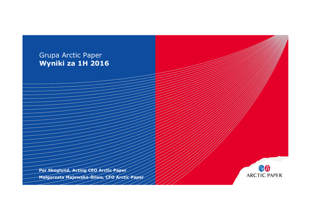 Grupa Arctic Paper Wyniki za 1H 2016 Per Skoglund, Acting CEO Arctic Paper Małgorzata Majewska-Śliwa, CFO Arctic Paper Arctic Paper Strona 2 Zastrzeżenie Prosimy o uważne zapoznanie się z poniższą informacją Niniejsza prezentacja („Prezentacja”) została przygotowana przez Arctic Paper S.A. („Spółka”) wyłącznie w celu informacyjnym na potrzeby inwestorów, banków i klientów Spółki oraz analityków rynku i w żadnym przypadku nie może być traktowana jako część zaproszenia do lub oferty nabycia papierów wartościowych, zaproszenia do dokonania inwestycji lub przeprowadzenia transakcji dotyczących papierów wartościowych, zachętą do złożenia oferty nabycia lub rekomendacją do zawierania jakichkolwiek transakcji, w szczególności dotyczących papierów wartościowych Spółki. Informacje zawarte w Prezentacji pochodzą z ogólnie dostępnych i w opinii Spółki wiarygodnych źródeł. Spółka nie może jednak zagwarantować ich prawdziwości ani zupełności, z wyłączeniem informacji dotyczących Spółki i jej Grupy Kapitałowej. Spółka nie ponosi odpowiedzialności za skutki decyzji podjętych na podstawie lub w oparciu o informacje zawarte w niniejszej Prezentacji. Informacje zawarte w Prezentacji nie były poddane niezależnej weryfikacji i w każdym wypadku mogą podlegać zmianom. Publikowanie przez Spółkę danych zawartych w Prezentacji nie stanowi naruszenia przepisów prawa obowiązujących spółki, których akcje są notowane na rynku regulowanym, w szczególności na rynku regulowanym prowadzonym przez Giełdę Papierów Wartościowych w Warszawie S.A. oraz giełdę NASDAQ OMX w Sztokholmie, Szwecja. Informacje w niej zawarte zostały przekazane do publicznej wiadomości przez Spółkę w ramach raportów bieżących lub okresowych, albo stanowią ich uzupełnienie, nie dając jednocześnie podstawy do przekazywania ich w ramach wypełniania przez Spółkę jej obowiązków informacyjnych jako spółki publicznej. W żadnym wypadku nie należy uznawać informacji znajdujących się w niniejszej Prezentacji za wyraźne lub dorozumiane złożenie oświadczenia czy zapewnienia jakiegokolwiek rodzaju przez Spółkę lub osoby działające w imieniu Spółki. Ponadto, ani Spółka, ani osoby działające w imieniu Spółki nie ponoszą pod żadnym względem odpowiedzialności za jakiekolwiek szkody, jakie mogą powstać, w skutek niedbalstwa czy z innej przyczyny, w związku z wykorzystaniem niniejszej Prezentacji lub jakichkolwiek informacji w niej zawartych, ani za szkody, które mogą powstać w inny sposób w związku z informacjami stanowiącymi część niniejszej Prezentacji. Spółka nie ma obowiązku przekazywania do publicznej wiadomości aktualizacji i zmian informacji, danych oraz oświadczeń znajdujących się w niniejszej Prezentacji na wypadek zmiany strategii albo zamiarów Spółki lub wystąpienia nieprzewidzianych faktów lub okoliczności, które będą miały wpływ na tę strategię lub zamiary Spółki, chyba że obowiązek taki wynika z przepisów prawa. Niniejsza Prezentacja może zawierać informacje dotyczące branży papierniczej. Z wyjątkiem informacji, które zostały oznaczone jako pochodzące wyłącznie ze wskazanego źródła, informacje rynkowe, o których mowa powyżej, zostały sporządzone w oparciu o dane pochodzące od osób trzecich, które zostały wskazane w niniejszej Prezentacji, oraz zawierają dane szacunkowe, oceny, korekty i opinie oparte na doświadczeniu Spółki i jej znajomości sektora, w którym Spółka prowadzi działalność. Ze względu na fakt, że informacje rynkowe, o których mowa powyżej, mogły zostać w części przygotowane w oparciu o dane szacunkowe, oceny, korekty i opinie oraz nie zostały zweryfikowane przez niezależne podmioty, informacje te mają do pewnego stopnia charakter subiektywny, z wyjątkiem informacji, które zostały oznaczone jako informacje pochodzące od osób trzecich ze wskazanego źródła. Domniemywa się, że takie dane szacunkowe, oceny, korekty i opinie są oparte na uzasadnionych podstawach oraz że przygotowane informacje rynkowe należycie odzwierciedlają sytuację w branży oraz na rynkach, na których Spółka prowadzi działalność. Nie ma jednak pewności, że takie dane szacunkowe, oceny, korekty i opinie są najwłaściwszą podstawą do wyciągania wniosków dotyczących informacji rynkowych, ani że informacje rynkowe pochodzące z innych źródeł nie będą różnić się w istotny sposób od informacji rynkowych zawartych w niniejszej Prezentacji. Spółka zwraca uwagę osobom zapoznającym się z niniejszą Prezentacją, że jedynym wiarygodnym źródłem danych dotyczących wyników finansowych Arctic Paper S.A., prognoz, zdarzeń oraz wskaźników dotyczących Spółki są raporty bieżące i okresowe przekazywane przez Spółkę w ramach wykonywania obowiązków informacyjnych wynikających z prawa polskiego i szwedzkiego. Niniejszą Prezentację należy czytać łącznie ze skonsolidowanym i jednostkowym raportem rocznym za rok 2015, jak i z raportem za pierwsze półrocze 2016. Arctic Paper Strona 3 Agenda Otoczenie rynkowe Wyniki operacyjne Wyniki finansowe Podsumowanie 1H 2016 Arctic Paper Page 4 Otoczenie rynkowe Arctic Paper Page 5 Dostawy papierów wysokogatunkowych Miesięczne dostawy papierów wysokogatunkowych w Europie 1 200 Q2 2016 vs. Q2 2015 -6,6% 959 Niepowlekane bezdrzewne spadek -6,2% Wzrost wolumenu Arctic Paper +0,3% Tysięcy ton Powlekane bezdrzewne spadek -7,1% 901 950 891 700 523 497 498 501 383 390 450 Q2 2016 vs. Q1 2016 -6,1% 436 Niepowlekane bezdrzewne spadek -3,6% Spadek wolumenu Arctic Paper -7,4% Fine papers 5 000 Tysięcy ton Wolumen 332 t CWF 34% Coated woodfree Kwartalne dostawy papierów wysokogatunkowych w Europie 4 000 UWF Uncoated woodfree Źródło: Arctic Paper na podstawie danych EuroGraph Struktura wolumenu Arctic Paper YTD 2016 66% 404 200 Powlekane bezdrzewne spadek -9,1% TON 881 5 