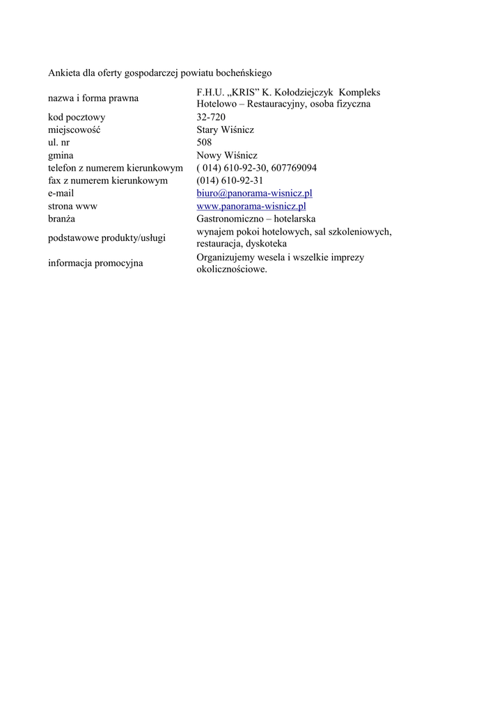 Ankieta dla oferty gospodarczej powiatu bocheńskiego nazwa i forma prawna kod pocztowy miejscowość ul. nr gmina telefon z numerem kierunkowym fax z numerem kierunkowym e-mail strona www branża podstawowe produkty/usługi informacja promocyjna F.H.U. „KRIS” K. Kołodziejczyk Kompleks Hotelowo – Restauracyjny, osoba fizyczna 32-720 Stary Wiśnicz 508 Nowy Wiśnicz ( 014) 610-92-30, 607769094 (014) 610-92-31 [email protected] www.panorama-wisnicz.pl Gastronomiczno – hotelarska wynajem pokoi hotelowych, sal szkoleniowych, restauracja, dyskoteka Organizujemy wesela i wszelkie imprezy okolicznościowe.