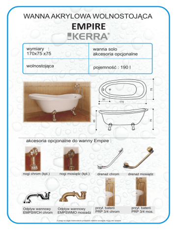 WANNA AKRYLOWA WOLNOSTOJ¥CA EMPIRE wanna solo akcesoria opcjonalne wolnostoj¹ca pojemnoœæ : 190 l 75 wymiary : 170x75 x75 30 65 75 170 akcesoria opcjonalne do wanny Empire : nogi chrom (kpl.) Odplyw wannowy EMPSWCH chrom nogi mosi¹dz (kpl.) drena¿ chrom drena¿ mosi¹dz Odplyw wannowy EMPSWMO mosiadz przy³. baterii PRP 3/4 chrom przy³. baterii PRP 3/4 mos. Z uwagi na ci¹g³e doskonalenie produktów niektóre szczegó³y mog¹ ulec zmianie.