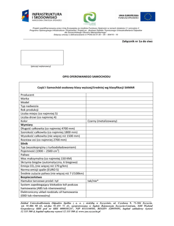 Projekt współfinansowany przez Unię Europejską ze środków Funduszu Spójności w ramach działania 2.1 priorytetu II Programu Operacyjnego Infrastruktura i Środowisko, Projekt pn. „Budowa Zakładu Termicznego Unieszkodliwiania Odpadów dla Szczecińskiego Obszaru Metropolitarnego”. Dotyczy umowy o dofinansowanie nr POIS.02.01.00 – 00 – 004/10 - 10 __________________________________________________________________________ Załącznik nr 1a do siwz (pieczęć wykonawcy) OPIS OFEROWANEGO SAMOCHODU Część I Samochód osobowy klasy wyższej/średniej wg klasyfikacji SAMAR Producent Marka Model Typ nadwozia Rok produkcji Liczba miejsc (co najmniej 5) Liczba drzwi (co najmniej 4) Kolor Wymiary Długość całkowita (co najmniej 4700 mm) Szerokość całkowita (co najmniej 1800 mm) Wysokość całkowita (nie więcej niż 1500 mm) Rozstaw osi (co najmniej 2700 mm) Silnik Typ (wysokoprężny z turbodoładowaniem) Pojemność (1900 – 2500 cm3) Paliwo Moc maksymalna (co najmniej 150 KM) Skrzynia biegów (automatyczna, 6 biegowa) Emisja CO2 (nie więcej niż 170 g/km) Norma emisji spalin (EURO 5) Średnie zużycie paliwa (nie więcej niż 7 l/100km) Bezpieczeństwo Hamulce tarczowe przód i tył System zapobiegający blokadzie kół podczas hamowania (ABS lub równoważny) Elektroniczny układ rozdziału sił hamowania (EBD lub równoważny) Czarny (metalizowany) tak/nie* ____________________________________________________________________________________________________ Zakład Unieszkodliwiania Odpadów Spółka z o. o. z siedzibą w Szczecinie, ul. Czesława 9, 71-504 Szczecin, tel. 91 886 90 65, tel./fax 91 455 71 43, zarejestrowana w Sądzie Rejonowym Szczecin-Centrum, XIII Wydział Gospodarczy KRS pod nr KRS 0000381247, NIP 8513140503, REGON 320959491, kapitał zakładowy wynosi 12 335 500 zł, kapitał wpłacony wynosi 12 335 500 zł. www.zuo.szczecin.pl System wspomagania gwałtownego hamowania (EBA lub równoważny) System zapobiegający poślizgowi kół przy ruszaniu (ASR lub równoważny) System elektronicznej kontroli stabilności toru jazdy (ESP lub równoważny) Poduszki powietrzne (czołowe i boczne) kierowcy i pasażera Kurtyny powietrzne dla pasażerów drugiego rzędu siedzeń Dezaktywacja poduszki Reflektory – ksenonowe światła mijania i światła drogowe, przednie światła przeciwmgielne Wyposażenie Klimatyzacja automatyczna (dwustrefowa) Zestaw audio – radio z CD, MP3 + 4 głośniki, antena Immobilizer Autoalarm Centralny zamek zdalnie sterowany Elektrycznie sterowane szyby przednich i tylnych drzwi bocznych Czujnik deszczu Tapicerka tkaninowa (w kolorze w ciemnym odcieniu) Podłokietnik kierowcy Tylna kanapa dzielona asymetrycznie Tempomat Czujniki parkowania przód i tył Elektrycznie regulowane i podgrzewane lusterka boczne Samościemniające się lusterko wsteczne Wspomaganie układu kierowniczego Regulacja kolumny kierowniczej (wysokość, głębokość) Obręcze kół ze stopów lekkich (co najmniej 17’’) Elementy dodatkowe Gaśnica, trójkąt, lewarek, fabryczny zestaw kluczy do zmiany kół Instrukcja obsługi w języku polskim Komplet opon zimowych na felgach stalowych Gwarancja Gwarancja mechaniczna (Co najmniej 24 miesiące, bez limitu kilometrów) Gwarancja na powłoki lakiernicze (Co najmniej 24 miesiące) Gwarancja na perforację nadwozia (Co najmniej 60 miesięcy) tak/nie* tak/nie* tak/nie* tak/nie* tak/nie* tak/nie* tak/nie* tak/nie* tak/nie* tak/nie* tak/nie* tak/nie* tak/nie* tak/nie* tak/nie* tak/nie* tak/nie* tak/nie* tak/nie* tak/nie* tak/nie* tak/nie* tak/nie* tak/nie* ____________________________________________________________________________________________________ Zakład Unieszkodliwiania Odpadów Spółka z o. o. z siedzibą w Szczecinie, ul. Czesława 9, 71-504 Szczecin, zarejestrowana w Sądzie Rejonowym Szczecin-Centrum, XIII Wydział Gospodarczy KRS pod nr KRS 0000381247, NIP 8513140503, REGON, 320959491, kapitał zakładowy wynosi 12 335 500 zł, kapitał wpłacony wynosi 12 335 500 zł. *niewłaściwe skreślić , dn (podpis(y) osób uprawnionych do reprezentacji wykonawcy) ____________________________________________________________________________________________________ Zakład Unieszkodliwiania Odpadów Spółka z o. o. z siedzibą w Szczecinie, ul. Czesława 9, 71-504 Szczecin, zarejestrowana w Sądzie Rejonowym Szczecin-Centrum, XIII Wydział Gospodarczy KRS pod nr KRS 0000381247, NIP 8513140503, REGON, 320959491, kapitał zakładowy wynosi 12 335 500 zł, kapitał wpłacony wynosi 12 335 500 zł.