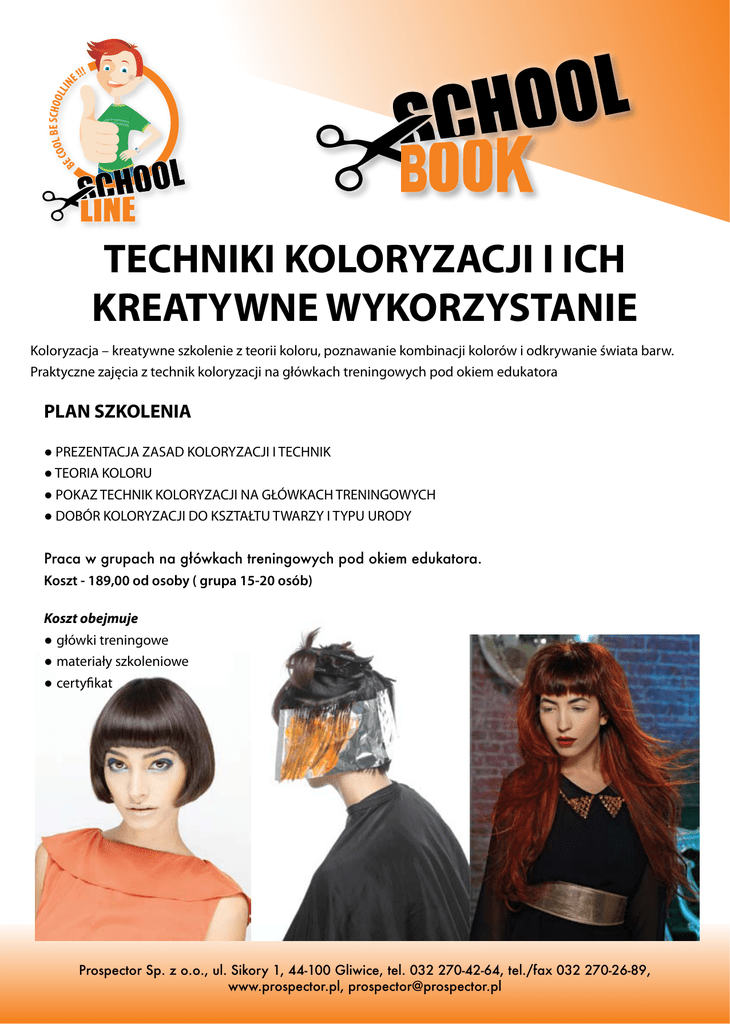 TECHNIKI KOLORYZACJI I ICH KREATYWNE WYKORZYSTANIE Koloryzacja – kreatywne szkolenie z teorii koloru, poznawanie kombinacji kolorów i odkrywanie świata barw. Praktyczne zajęcia z technik koloryzacji na główkach treningowych pod okiem edukatora PLAN SZKOLENIA ● PREZENTACJA ZASAD KOLORYZACJI I TECHNIK ● TEORIA KOLORU ● POKAZ TECHNIK KOLORYZACJI NA GŁÓWKACH TRENINGOWYCH ● DOBÓR KOLORYZACJI DO KSZTAŁTU TWARZY I TYPU URODY Praca w grupach na główkach treningowych pod okiem edukatora. Koszt - 189,00 od osoby ( grupa 15-20 osób) Koszt obejmuje ● główki treningowe ● materiały szkoleniowe ● certyfikat Prospector Sp. z o.o., ul. Sikory 1, 44-100 Gliwice, tel. 032 270-42-64, tel./fax 032 270-26-89, www.prospector.pl, [email protected]