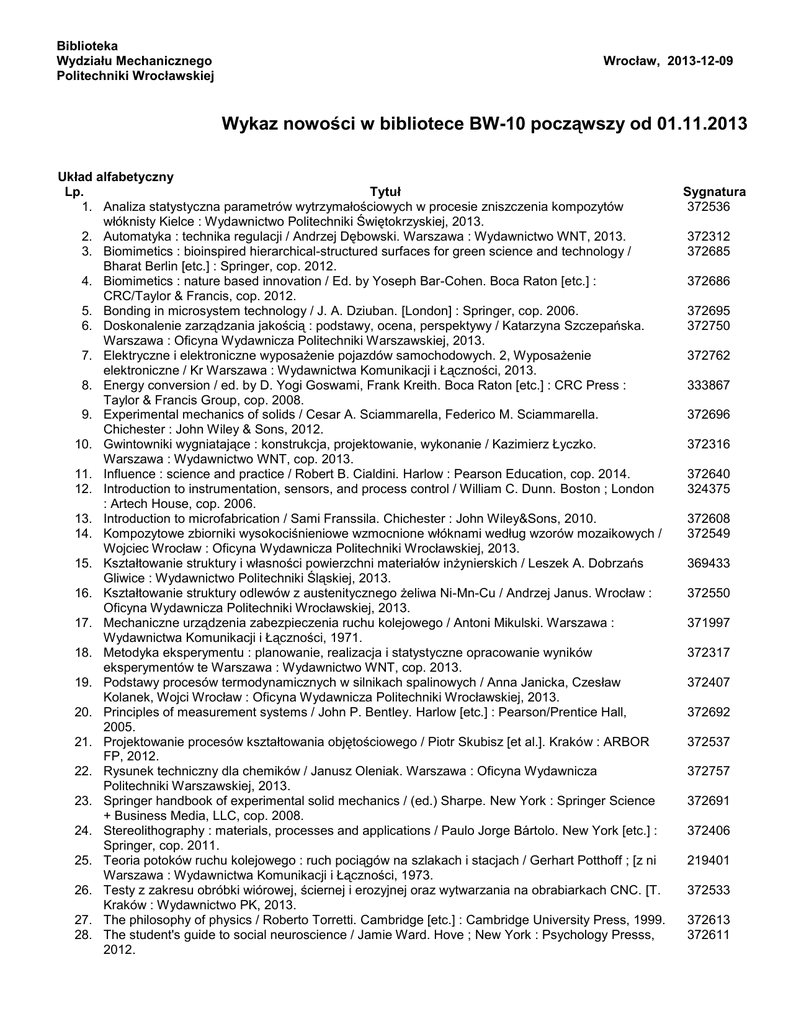 Biblioteka Wydziału Mechanicznego Politechniki Wrocławskiej Wrocław, 2013-12-09 Wykaz nowości w bibliotece BW-10 począwszy od 01.11.2013 Układ alfabetyczny Lp. Tytuł 1. Analiza statystyczna parametrów wytrzymałościowych w procesie zniszczenia kompozytów włóknisty Kielce : Wydawnictwo Politechniki Świętokrzyskiej, 2013. 2. Automatyka : technika regulacji / Andrzej Dębowski. Warszawa : Wydawnictwo WNT, 2013. 3. Biomimetics : bioinspired hierarchical-structured surfaces for green science and technology / Bharat Berlin [etc.] : Springer, cop. 2012. 4. Biomimetics : nature based innovation / Ed. by Yoseph Bar-Cohen. Boca Raton [etc.] : CRC/Taylor & Francis, cop. 2012. 5. Bonding in microsystem technology / J. A. Dziuban. [London] : Springer, cop. 2006. 6. Doskonalenie zarządzania jakością : podstawy, ocena, perspektywy / Katarzyna Szczepańska. Warszawa : Oficyna Wydawnicza Politechniki Warszawskiej, 2013. 7. Elektryczne i elektroniczne wyposażenie pojazdów samochodowych. 2, Wyposażenie elektroniczne / Kr Warszawa : Wydawnictwa Komunikacji i Łączności, 2013. 8. Energy conversion / ed. by D. Yogi Goswami, Frank Kreith. Boca Raton [etc.] : CRC Press : Taylor & Francis Group, cop. 2008. 9. Experimental mechanics of solids / Cesar A. Sciammarella, Federico M. Sciammarella. Chichester : John Wiley & Sons, 2012. 10. Gwintowniki wygniatające : konstrukcja, projektowanie, wykonanie / Kazimierz Łyczko. Warszawa : Wydawnictwo WNT, cop. 2013. 11. Influence : science and practice / Robert B. Cialdini. Harlow : Pearson Education, cop. 2014. 12. Introduction to instrumentation, sensors, and process control / William C. Dunn. Boston ; London : Artech House, cop. 2006. 13. Introduction to microfabrication / Sami Franssila. Chichester : John Wiley&Sons, 2010. 14. Kompozytowe zbiorniki wysokociśnieniowe wzmocnione włóknami według wzorów mozaikowych / Wojciec Wrocław : Oficyna Wydawnicza Politechniki Wrocławskiej, 2013. 15. Kształtowanie struktury i własności powierzchni materiałów inżynierskich / Leszek A. Dobrzańs Gliwice : Wydawnictwo Politechniki Śląskiej, 2013. 16. Kształtowanie struktury odlewów z austenitycznego żeliwa Ni-Mn-Cu / Andrzej Janus. Wrocław : Oficyna Wydawnicza Politechniki Wrocławskiej, 2013. 17. Mechaniczne urządzenia zabezpieczenia ruchu kolejowego / Antoni Mikulski. Warszawa : Wydawnictwa Komunikacji i Łączności, 1971. 18. Metodyka eksperymentu : planowanie, realizacja i statystyczne opracowanie wyników eksperymentów te Warszawa : Wydawnictwo WNT, cop. 2013. 19. Podstawy procesów termodynamicznych w silnikach spalinowych / Anna Janicka, Czesław Kolanek, Wojci Wrocław : Oficyna Wydawnicza Politechniki Wrocławskiej, 2013. 20. Principles of measurement systems / John P. Bentley. Harlow [etc.] : Pearson/Prentice Hall, 2005. 21. Projektowanie procesów kształtowania objętościowego / Piotr Skubisz [et al.]. Kraków : ARBOR FP, 2012. 22. Rysunek techniczny dla chemików / Janusz Oleniak. Warszawa : Oficyna Wydawnicza Politechniki Warszawskiej, 2013. 23. Springer handbook of experimental solid mechanics / (ed.) Sharpe. New York : Springer Science + Business Media, LLC, cop. 2008. 24. Stereolithography : materials, processes and applications / Paulo Jorge Bártolo. New York [etc.] : Springer, cop. 2011. 25. Teoria potoków ruchu kolejowego : ruch pociągów na szlakach i stacjach / Gerhart Potthoff ; [z ni Warszawa : Wydawnictwa Komunikacji i Łączności, 1973. 26. Testy z zakresu obróbki wiórowej, ściernej i erozyjnej oraz wytwarzania na obrabiarkach CNC. [T. Kraków : Wydawnictwo PK, 2013. 27. The philosophy of physics / Roberto Torretti. Cambridge [etc.] : Cambridge University Press, 1999. 28. The student's guide to social neuroscience / Jamie Ward. Hove ; New York : Psychology Presss, 2012. Sygnatura 372536 372312 372685 372686 372695 372750 372762 333867 372696 372316 372640 324375 372608 372549 369433 372550 371997 372317 372407 372692 372537 372757 372691 372406 219401 372533 372613 372611 29. Utrzymanie podtorza kolejowego / Mieczysław Sznurowski. Warszawa : Wydawnictwa Komunikacji i Łączności, 1971. 30. Wpływ stanu energetycznego warstwy wierzchniej elementów silnika spalinowego na zużycie i tarcie Wrocław : Oficyna Wydawnicza Politechniki Wrocławskiej, 2013. 31. Wybrane zagadnienia teorii tłokowych silników spalinowych w aspekcie zmian objętości skokowej / Wrocław : Oficyna Wydawnicza Politechniki Wrocławskiej, 2013. 32. Zarządzanie innowacjami / Ryszard Knosala [et al.]. Warszawa : Polskie Wydawnictwo Ekonomiczne, 2014. 33. Zarządzanie projektem / Marek Wirkus [et al.]. Warszawa : Polskie Wydawnictwa Ekonomiczne, 2014. 34. Zarządzanie zapasami i łańcuchem dostaw / red. nauk. Andrzej Szymonik. Warszawa : Difin, 2013. 278177 372173 372555 372135 372115 372219
